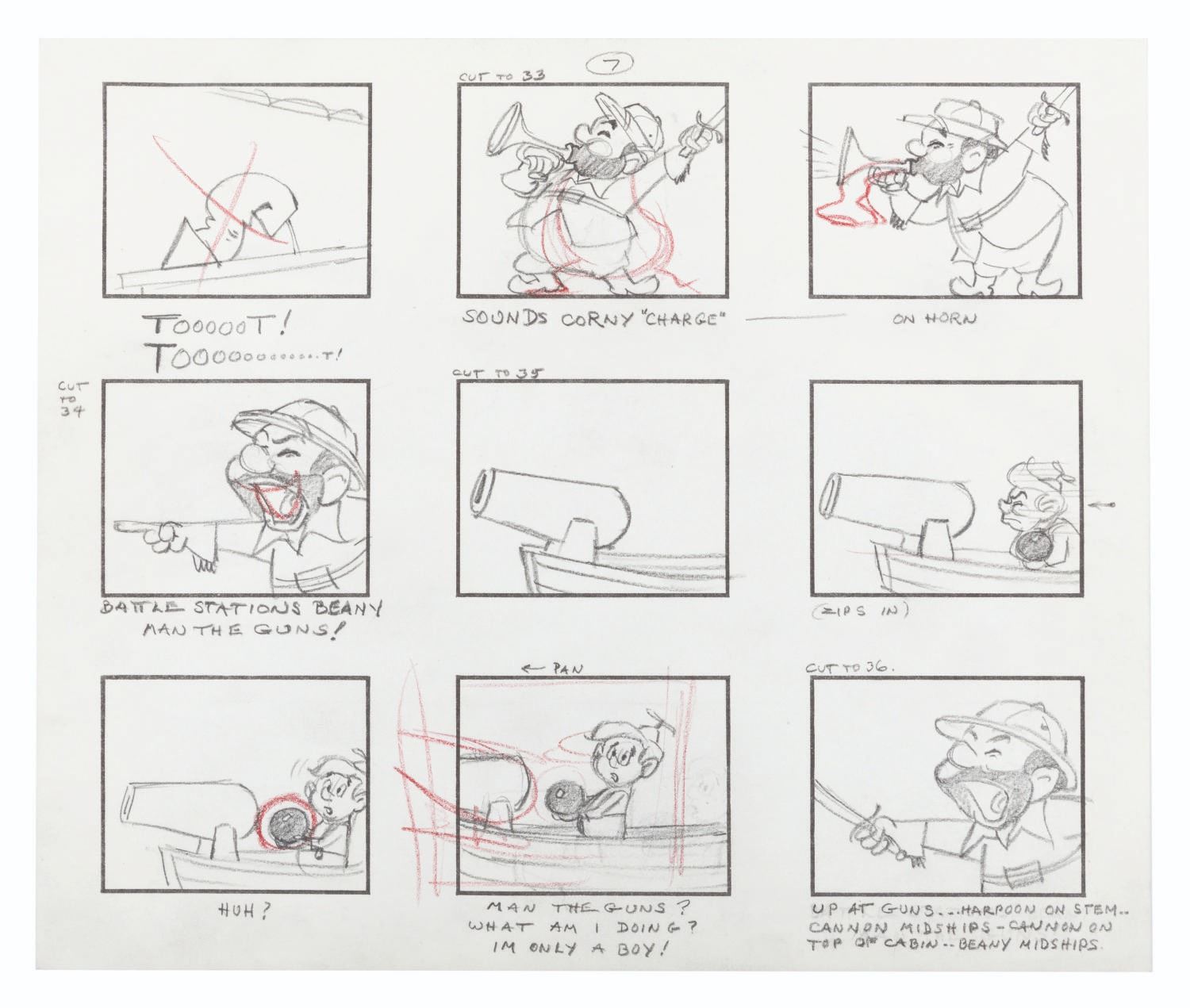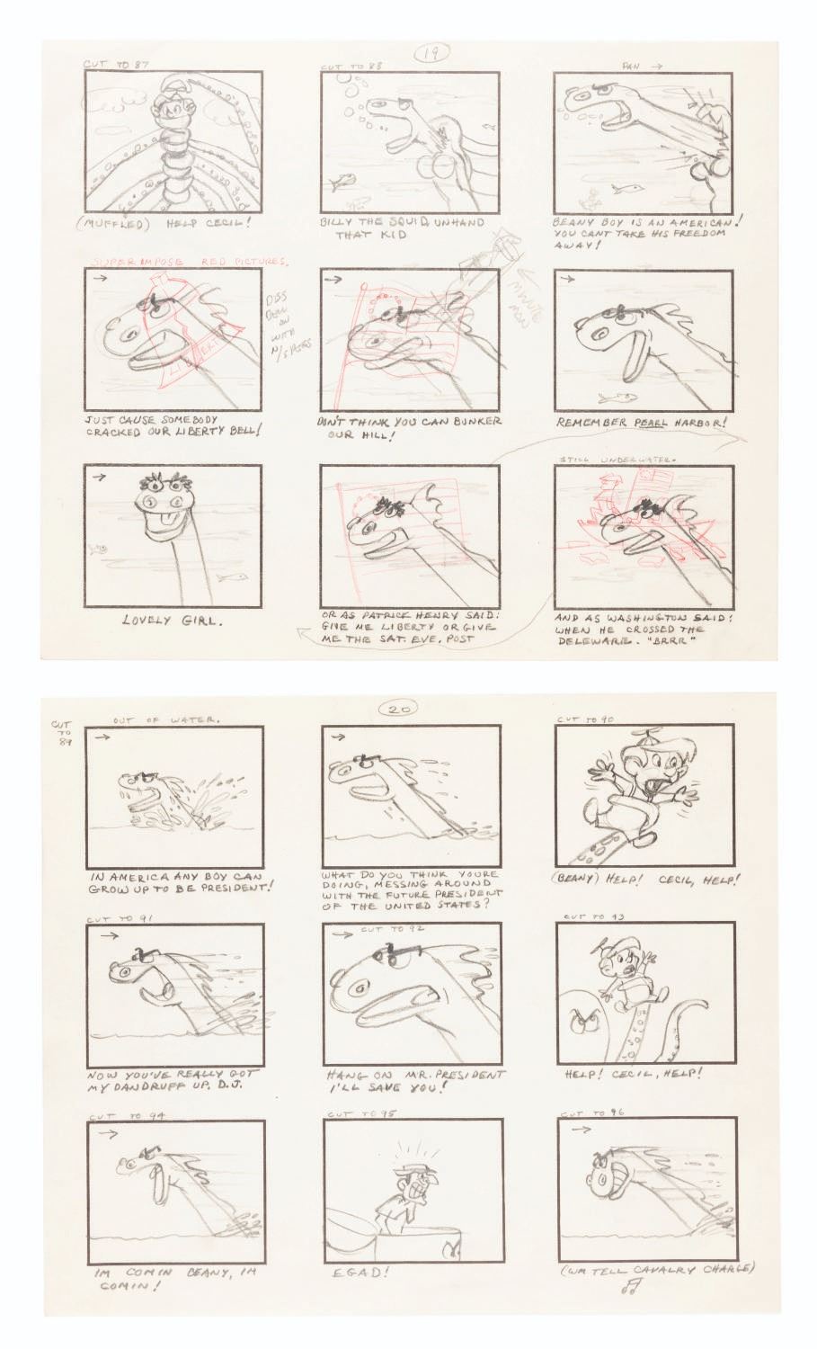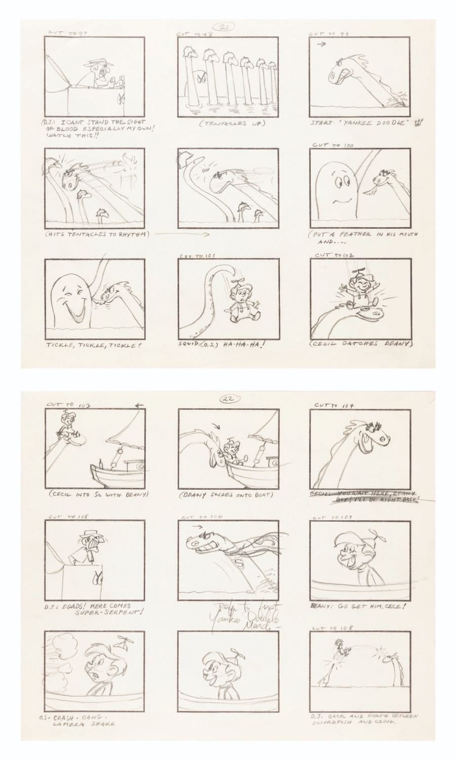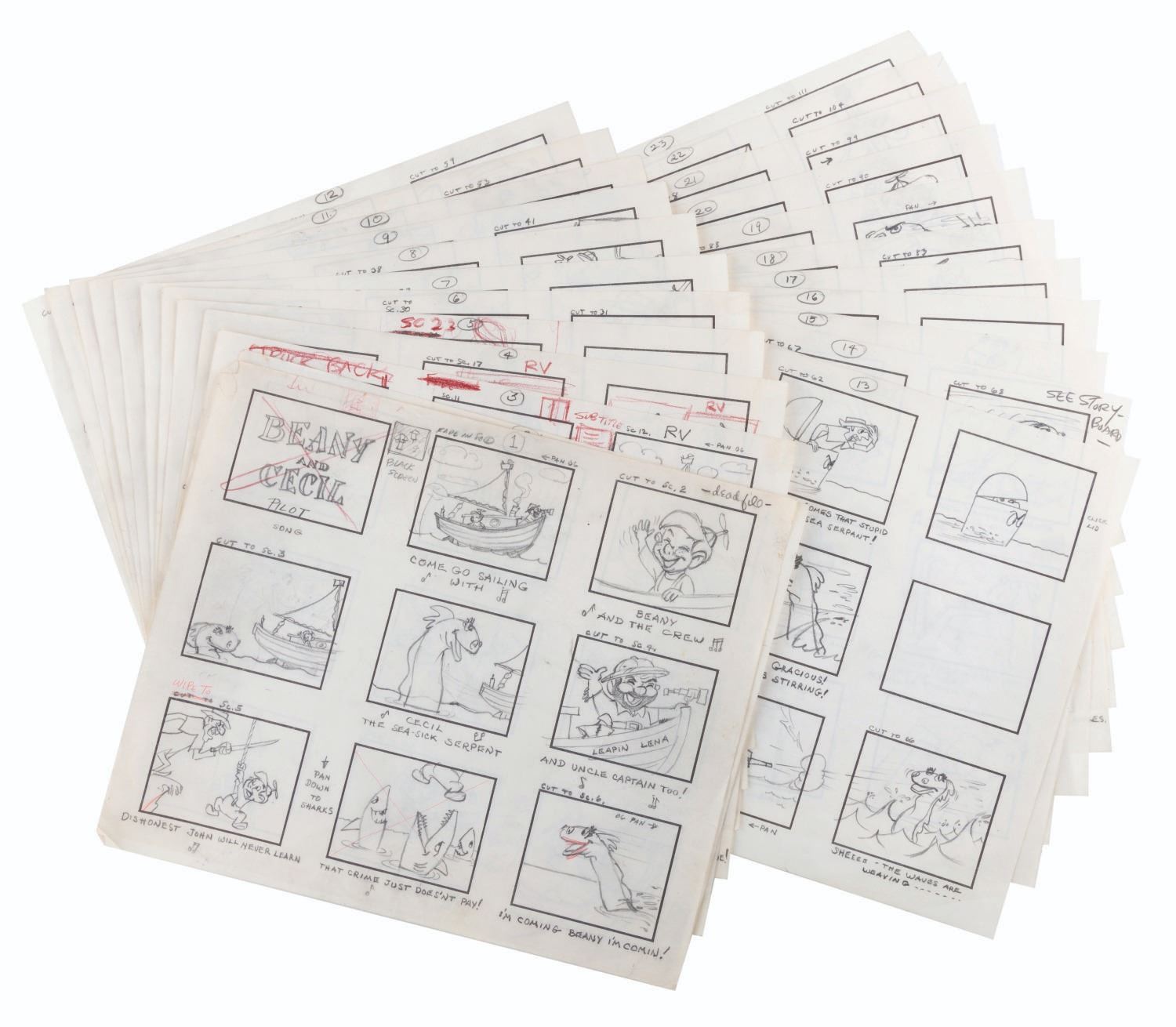 (Clampett, 1959) The complete original 23-page storyboard for the first “Beany and Cecil” animated cartoon, “Beany and Cecil Meet Billy the Squid.” The storyboards include 207 individual images, all beautifully drawn by Bob Clampett himself, with some corrections and notations in red grease pencil. Famously, Robert Clampett, Jr. was introduced to the family business when he had to turn over his bedroom every morning to the animation department during the making of this pilot, which ultimately aired as a segment of the show’s 8th episode on February 24, 1962. Accomplished in graphite, the pages measure 10.5” x 12.5” and are in good condition with edge wear and creases from production use, and light discoloration from age.