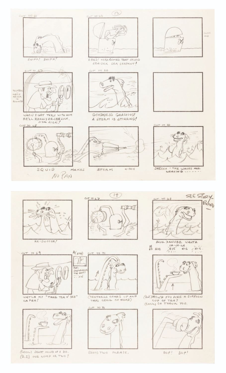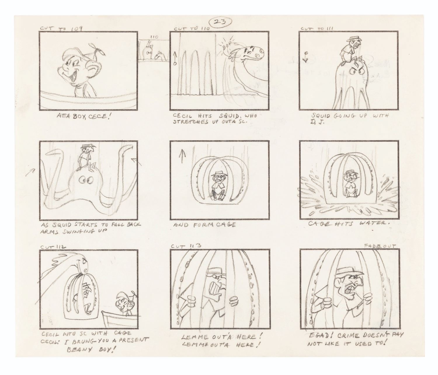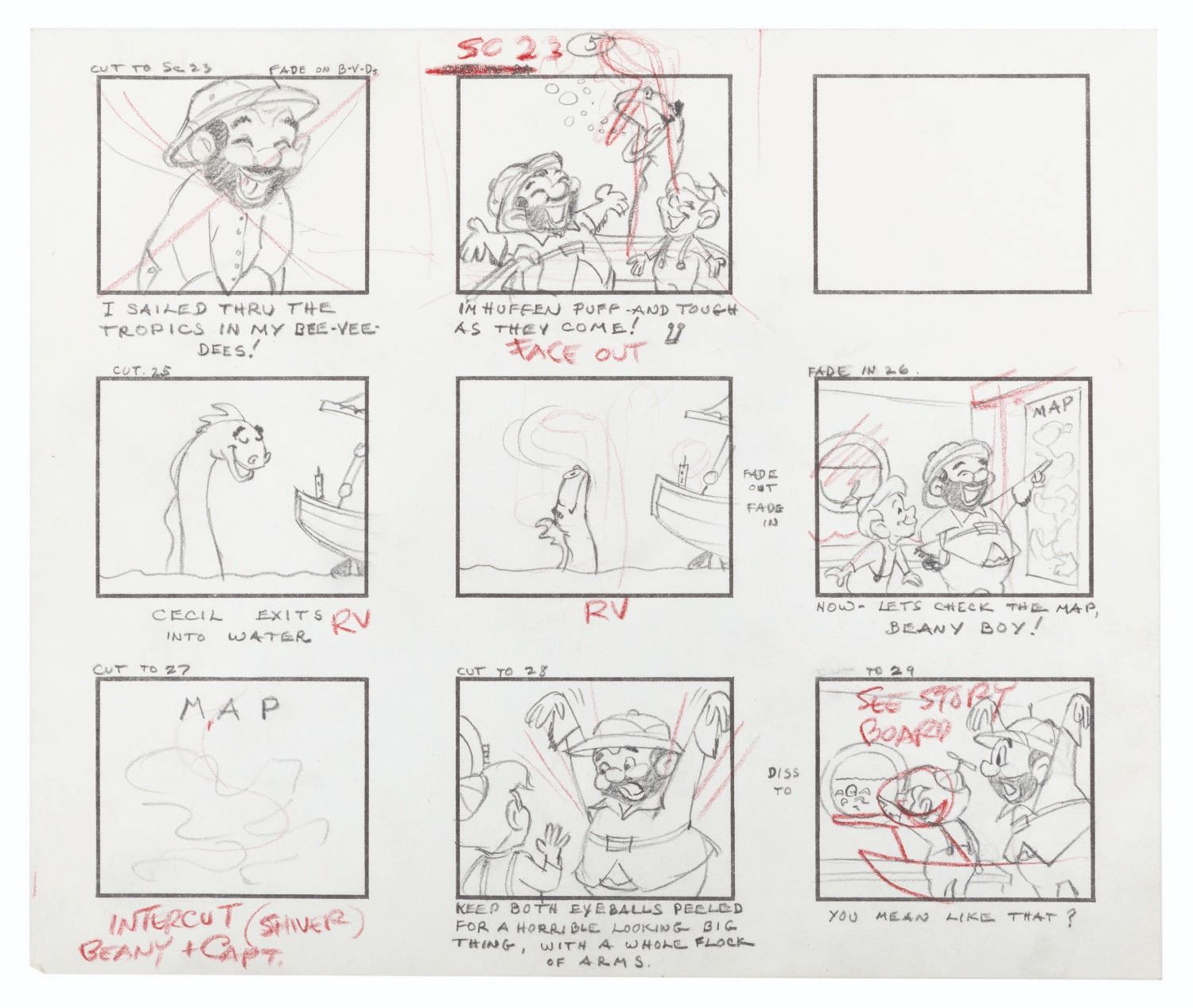 (Clampett, 1959) The complete original 23-page storyboard for the first “Beany and Cecil” animated cartoon, “Beany and Cecil Meet Billy the Squid.” The storyboards include 207 individual images, all beautifully drawn by Bob Clampett himself, with some corrections and notations in red grease pencil. Famously, Robert Clampett, Jr. was introduced to the family business when he had to turn over his bedroom every morning to the animation department during the making of this pilot, which ultimately aired as a segment of the show’s 8th episode on February 24, 1962. Accomplished in graphite, the pages measure 10.5” x 12.5” and are in good condition with edge wear and creases from production use, and light discoloration from age.