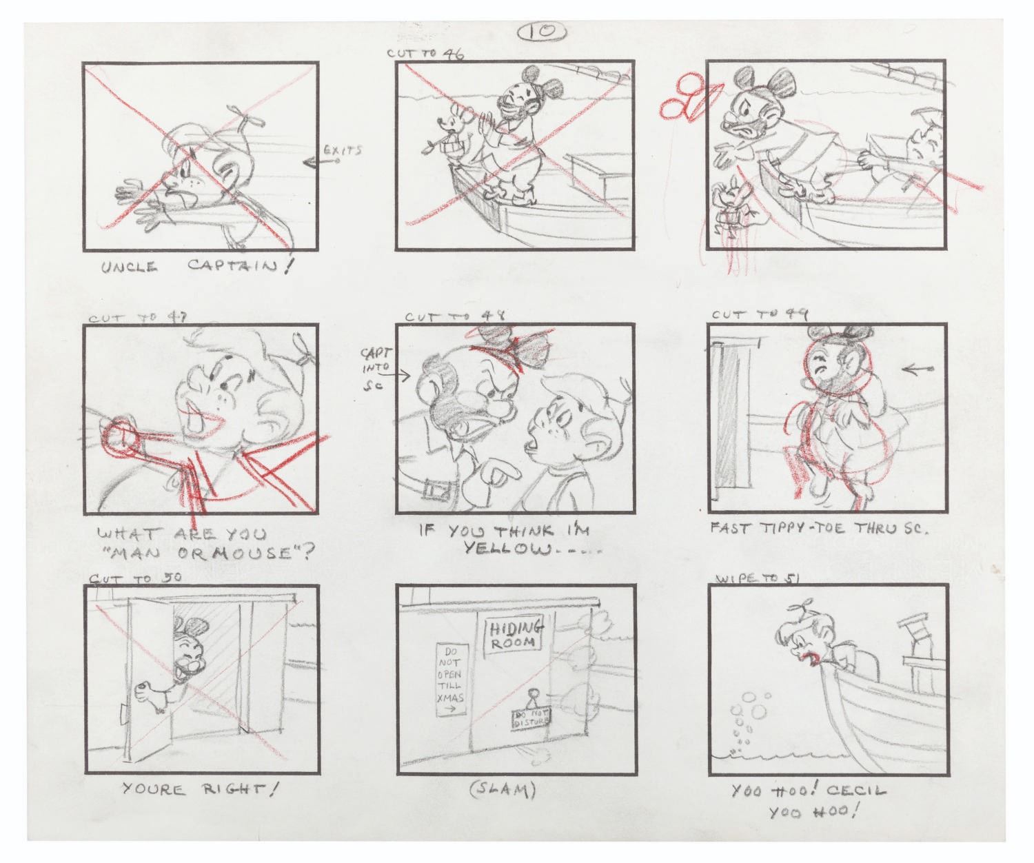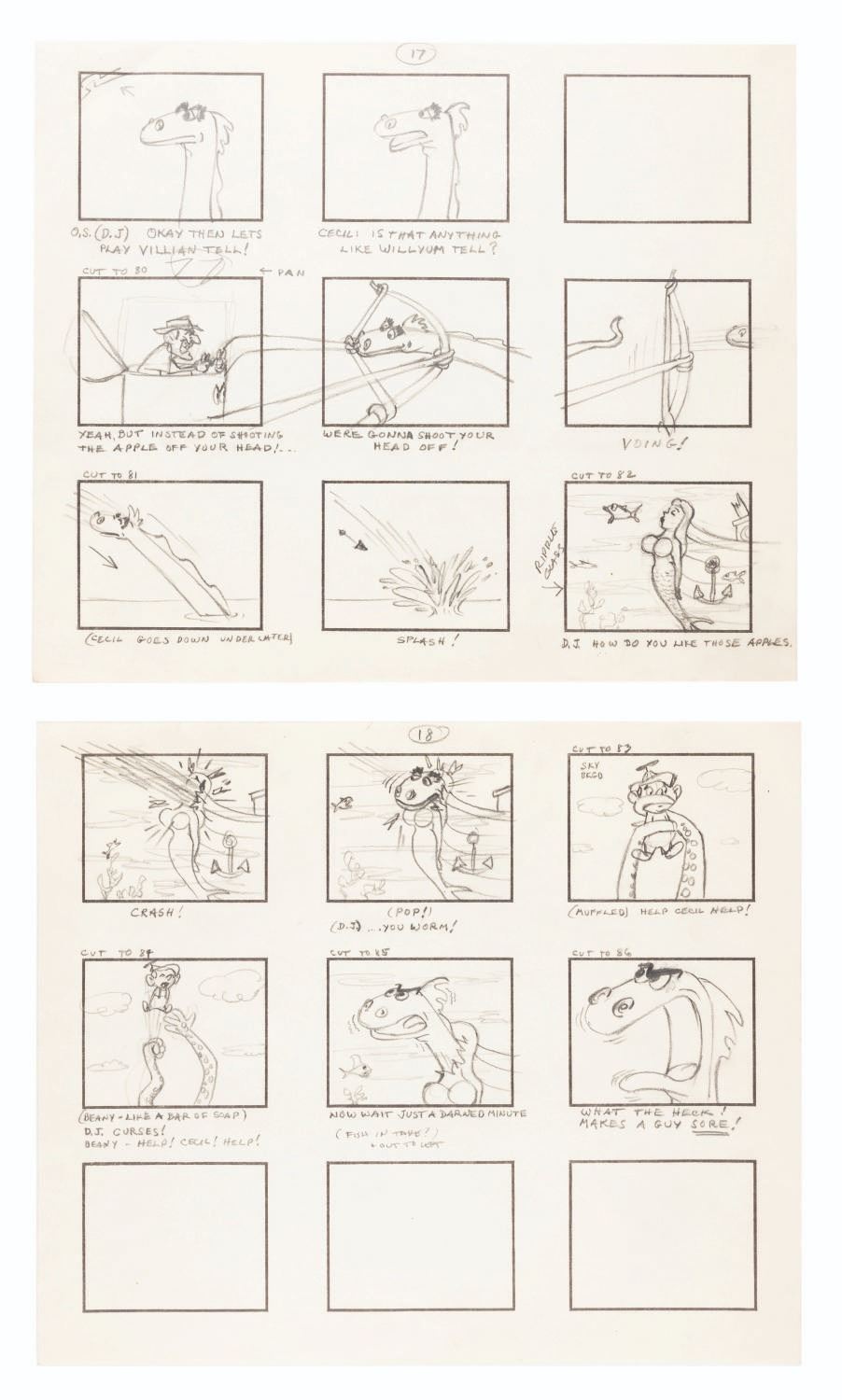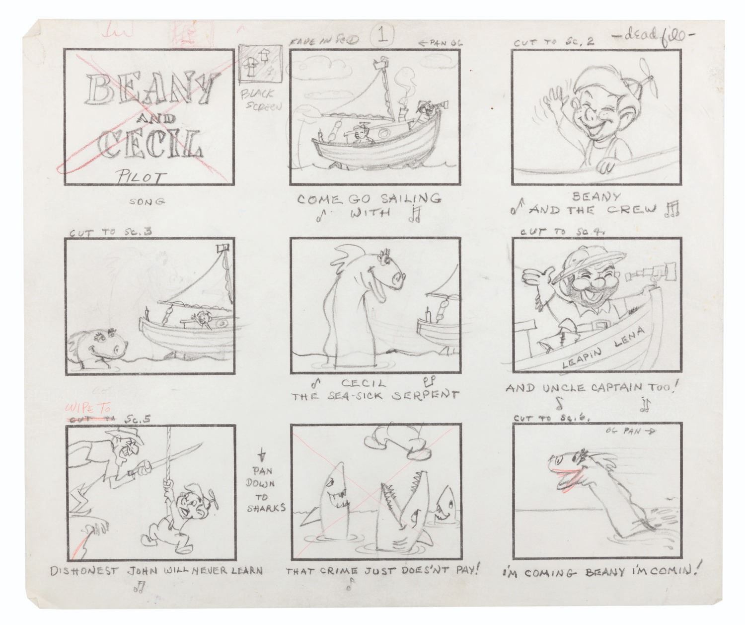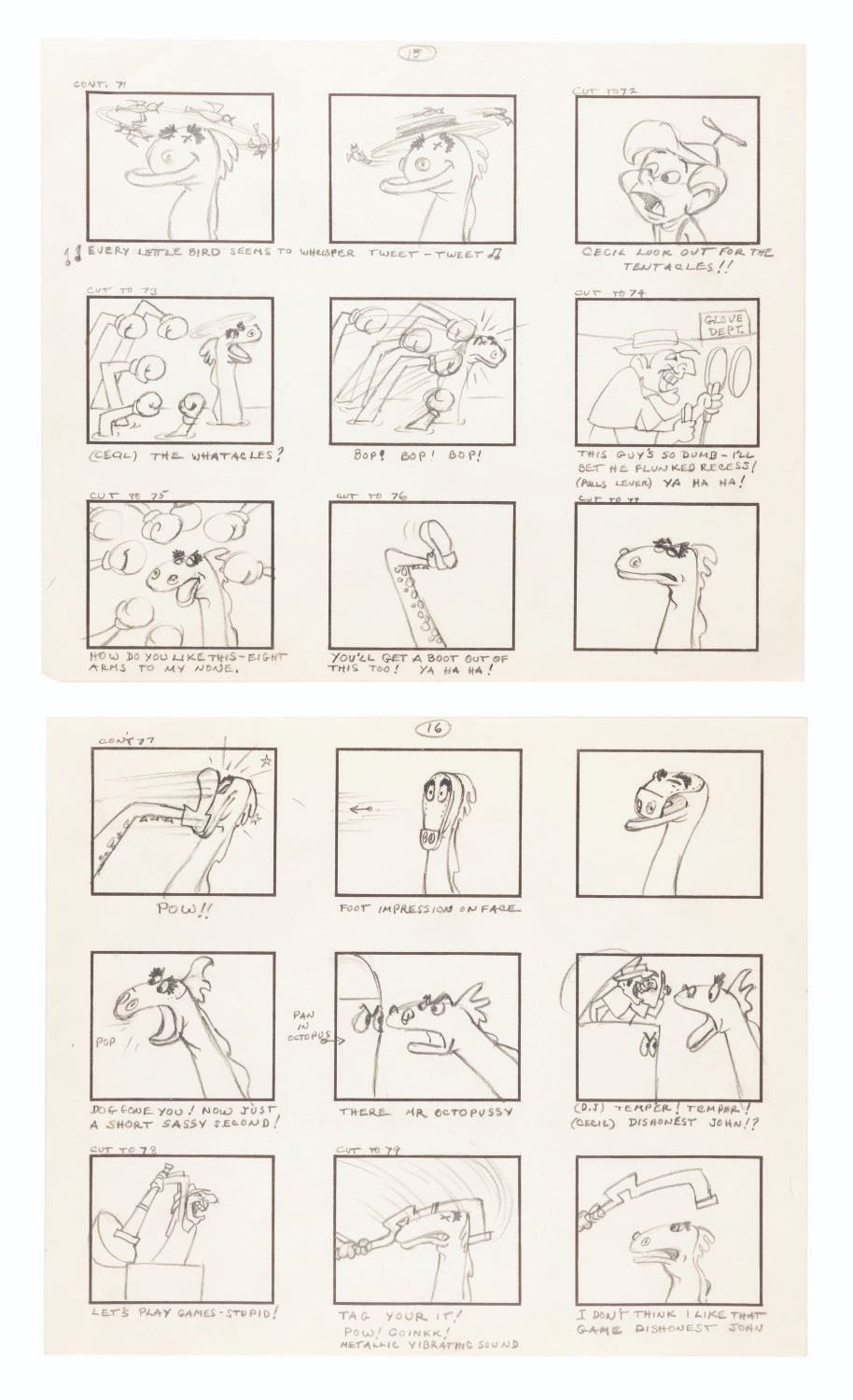 (Clampett, 1959) The complete original 23-page storyboard for the first “Beany and Cecil” animated cartoon, “Beany and Cecil Meet Billy the Squid.” The storyboards include 207 individual images, all beautifully drawn by Bob Clampett himself, with some corrections and notations in red grease pencil. Famously, Robert Clampett, Jr. was introduced to the family business when he had to turn over his bedroom every morning to the animation department during the making of this pilot, which ultimately aired as a segment of the show’s 8th episode on February 24, 1962. Accomplished in graphite, the pages measure 10.5” x 12.5” and are in good condition with edge wear and creases from production use, and light discoloration from age.