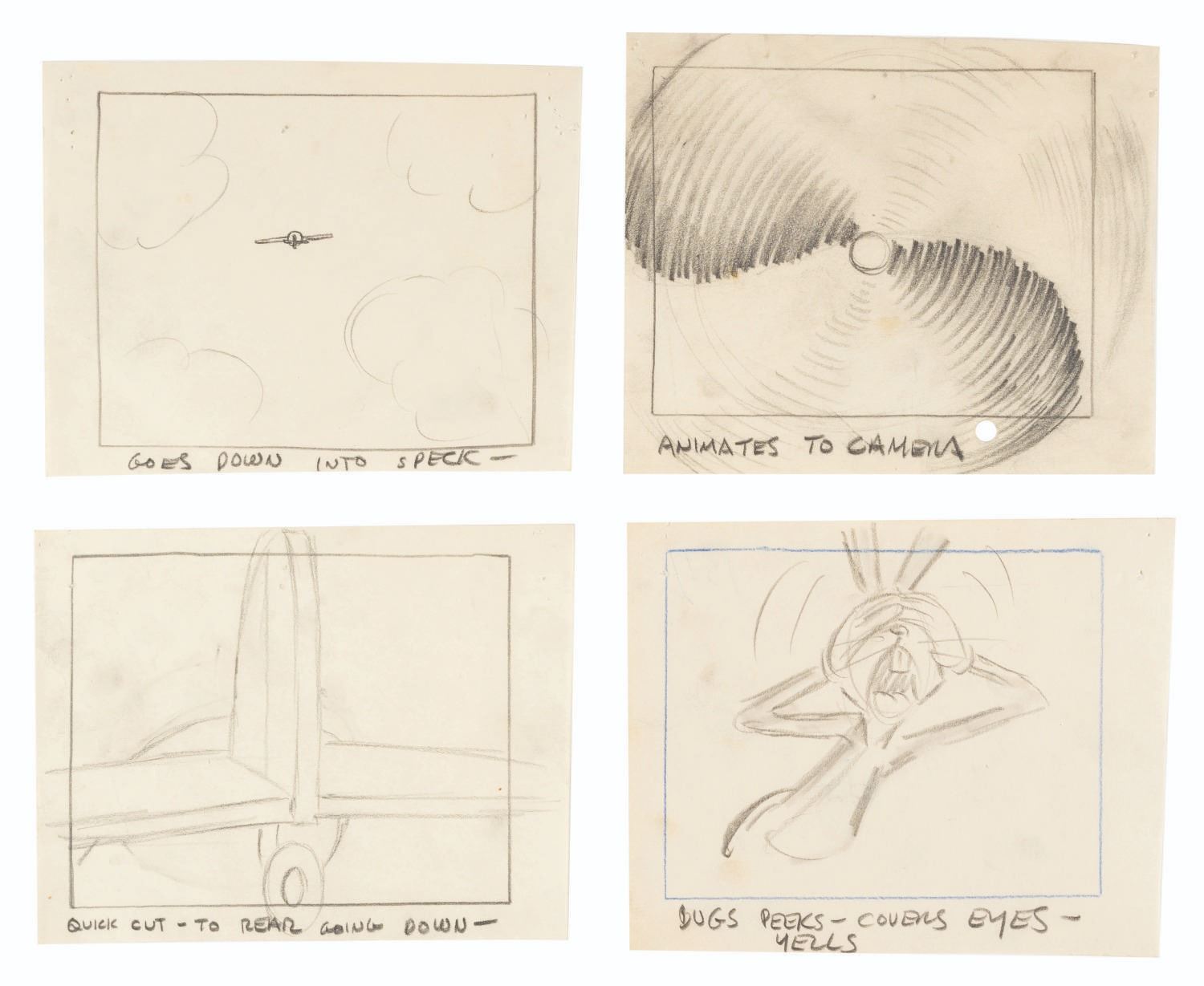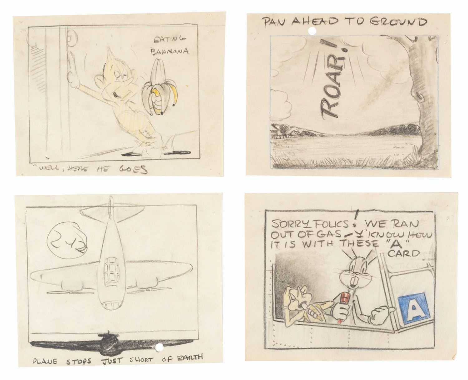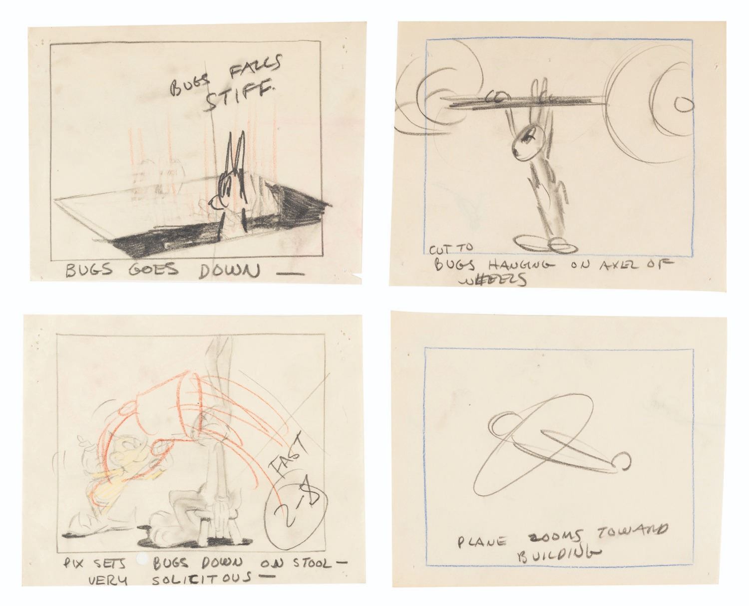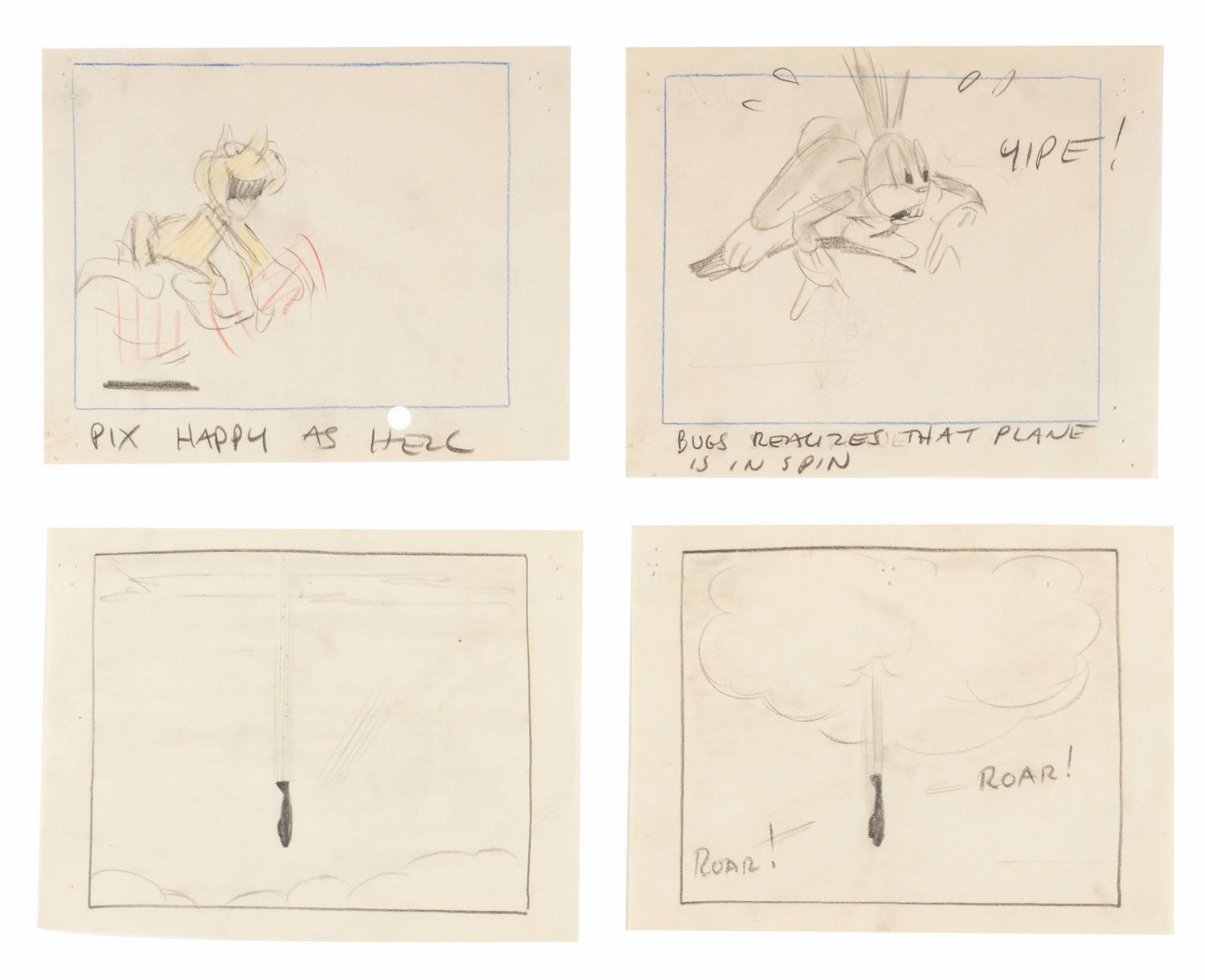 (Schlesinger, 1943) The complete set of 84 storyboard panels for the Merrie Melodies short “Falling Hare,” directed by Bob Clampett. Complete storyboards from Merrie Melodies and Looney Tunes shorts are incredibly rare. This short is one of the true standouts of the WWII-era Warner Bros. cartoons, featuring Bugs Bunny in a confrontation with one of the few antagonists to outsmart him: a saboteur Gremlin. Accomplished in graphite and colored pencil, and ranging in size from 4.5” x 6” to 5” x 6”, the panels display in very good production-used condition with creases, pinholes with some corner tears, and light