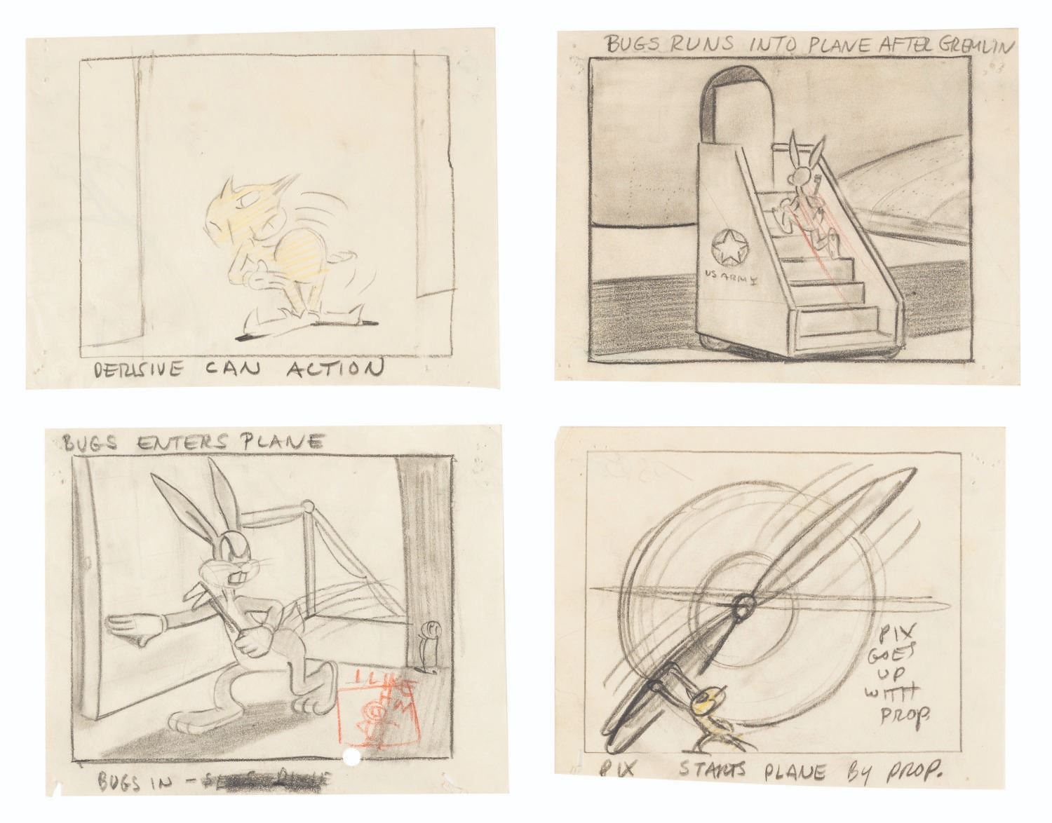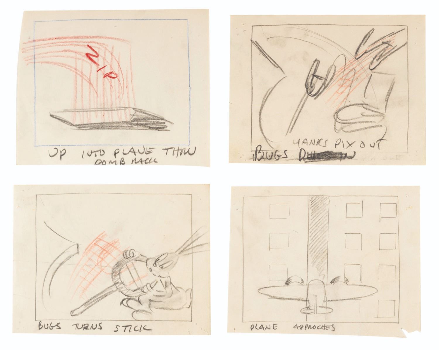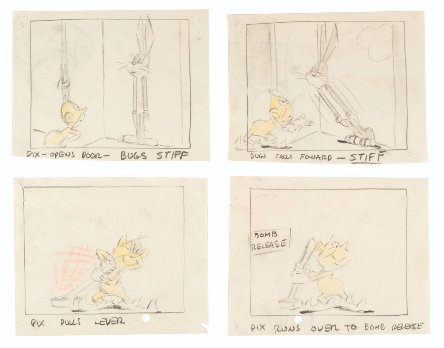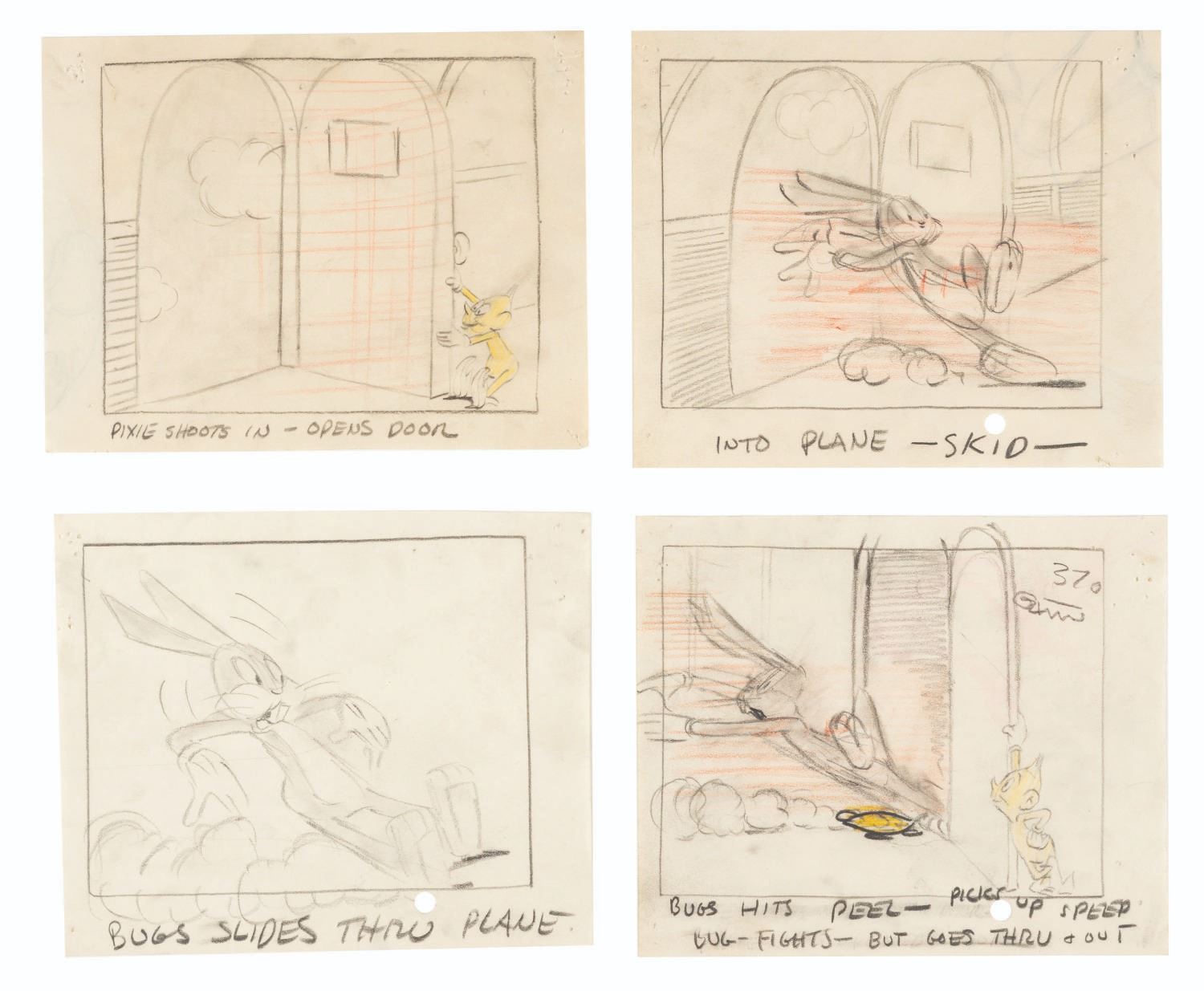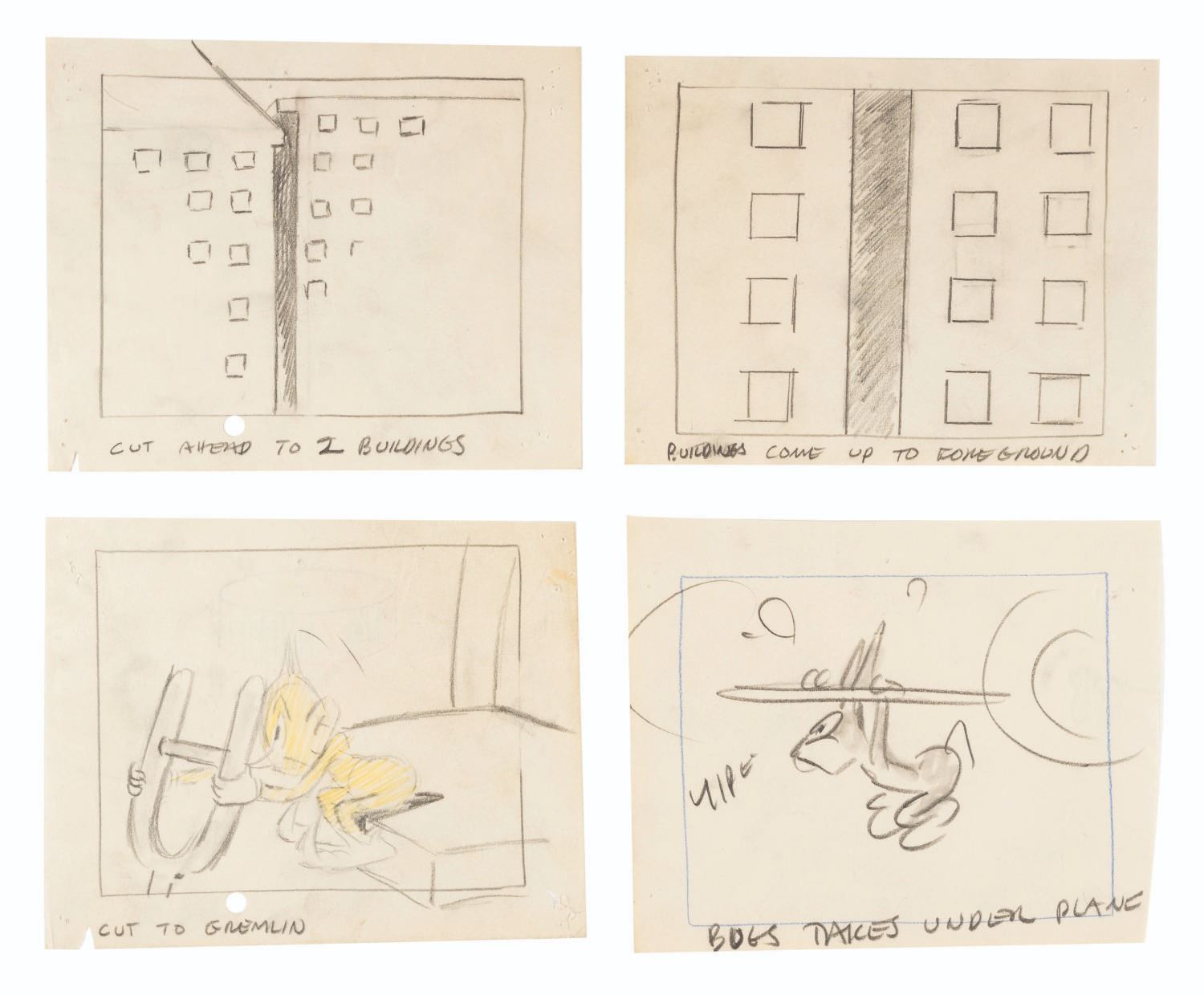 (Schlesinger, 1943) The complete set of 84 storyboard panels for the Merrie Melodies short “Falling Hare,” directed by Bob Clampett. Complete storyboards from Merrie Melodies and Looney Tunes shorts are incredibly rare. This short is one of the true standouts of the WWII-era Warner Bros. cartoons, featuring Bugs Bunny in a confrontation with one of the few antagonists to outsmart him: a saboteur Gremlin. Accomplished in graphite and colored pencil, and ranging in size from 4.5” x 6” to 5” x 6”, the panels display in very good production-used condition with creases, pinholes with some corner tears, and light