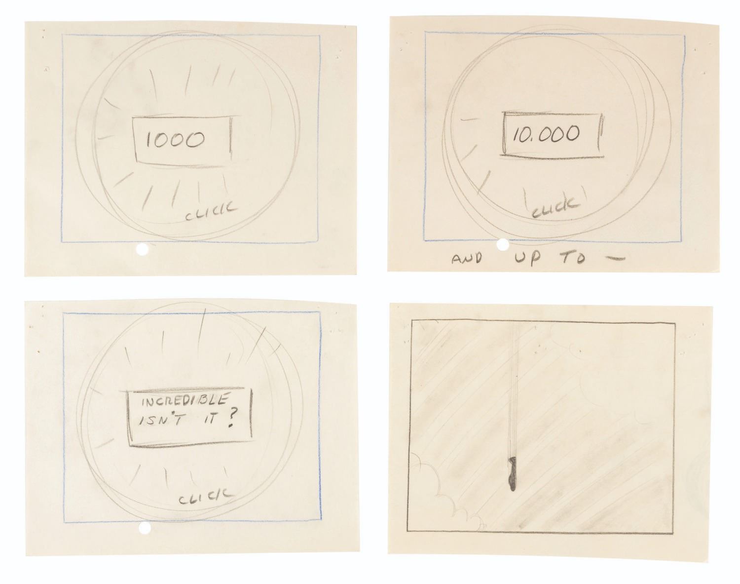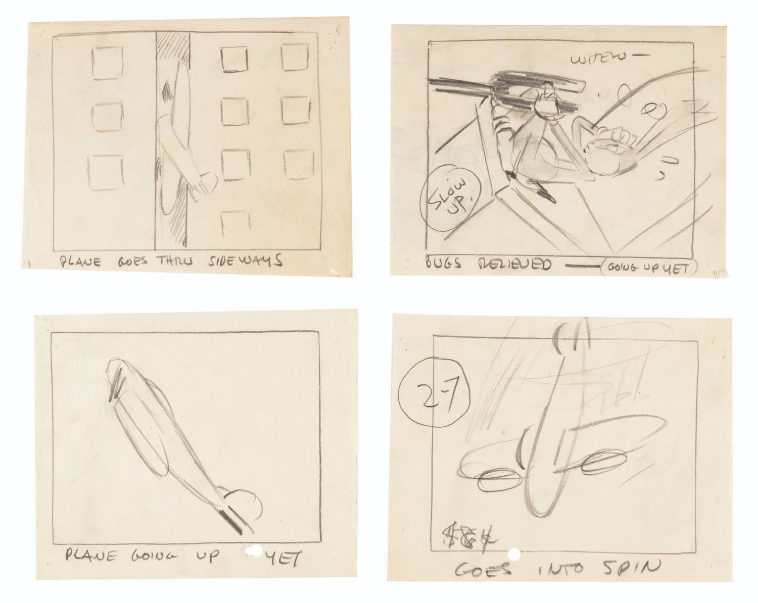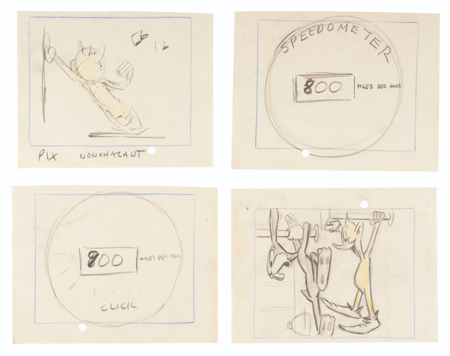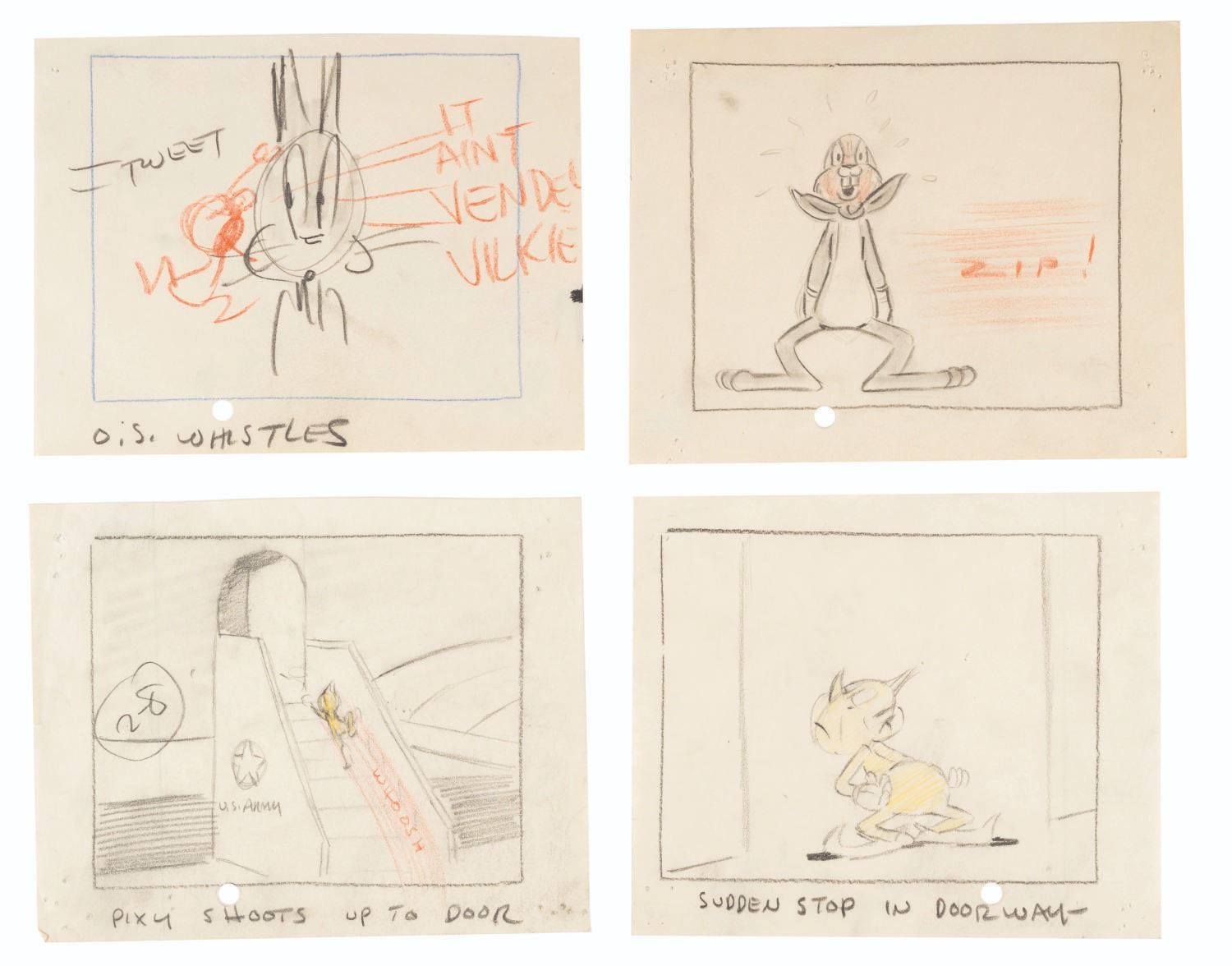 (Schlesinger, 1943) The complete set of 84 storyboard panels for the Merrie Melodies short “Falling Hare,” directed by Bob Clampett. Complete storyboards from Merrie Melodies and Looney Tunes shorts are incredibly rare. This short is one of the true standouts of the WWII-era Warner Bros. cartoons, featuring Bugs Bunny in a confrontation with one of the few antagonists to outsmart him: a saboteur Gremlin. Accomplished in graphite and colored pencil, and ranging in size from 4.5” x 6” to 5” x 6”, the panels display in very good production-used condition with creases, pinholes with some corner tears, and light