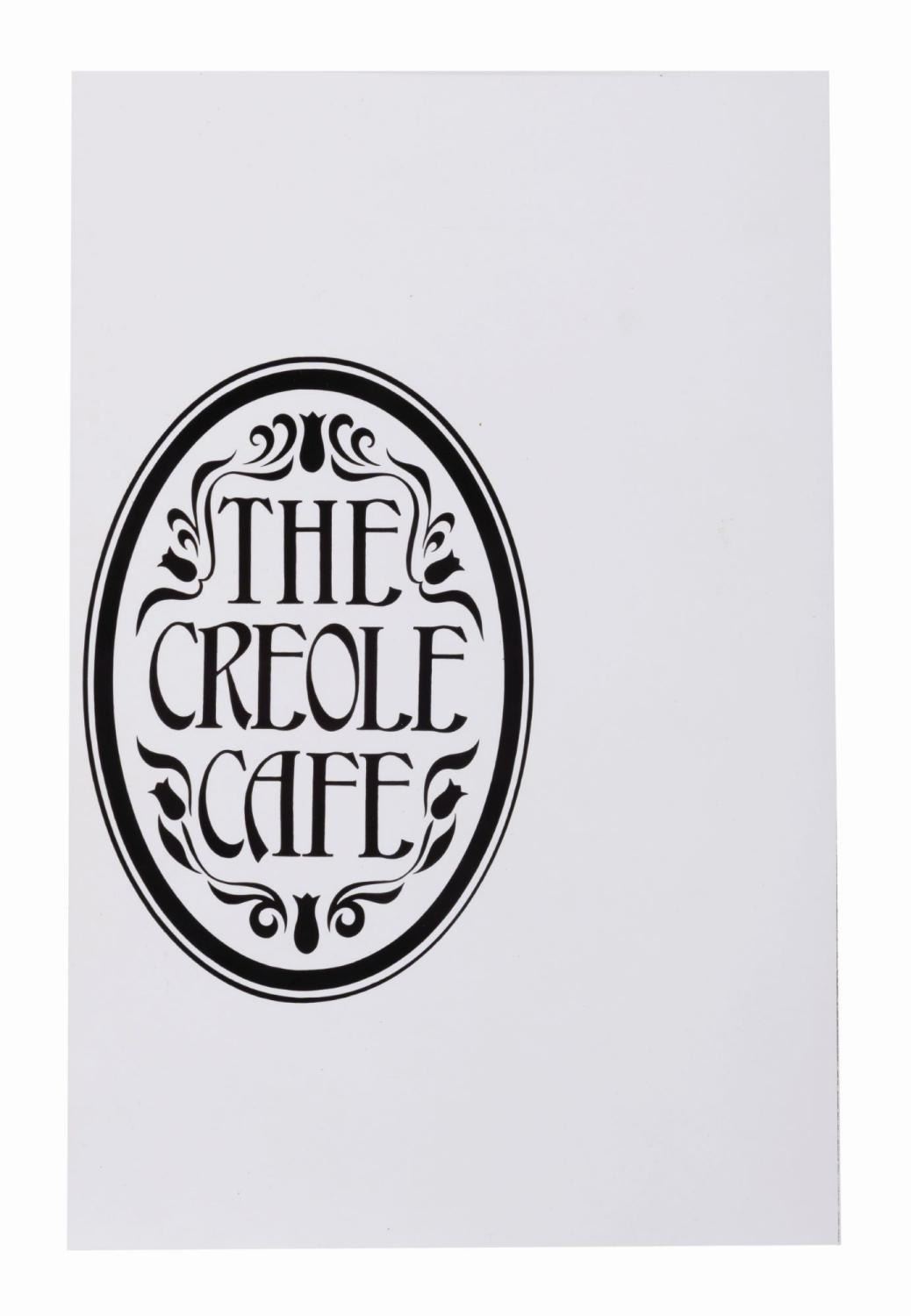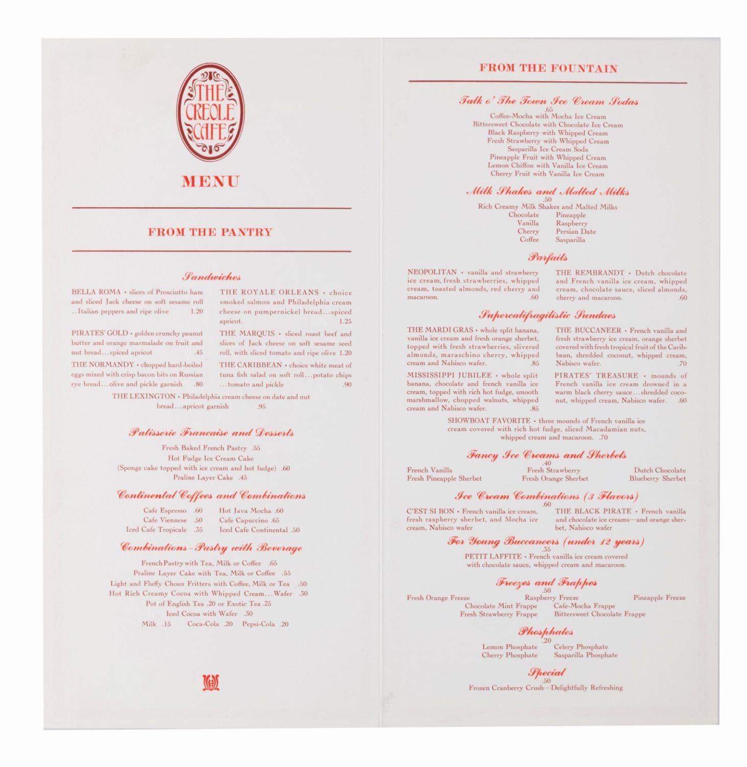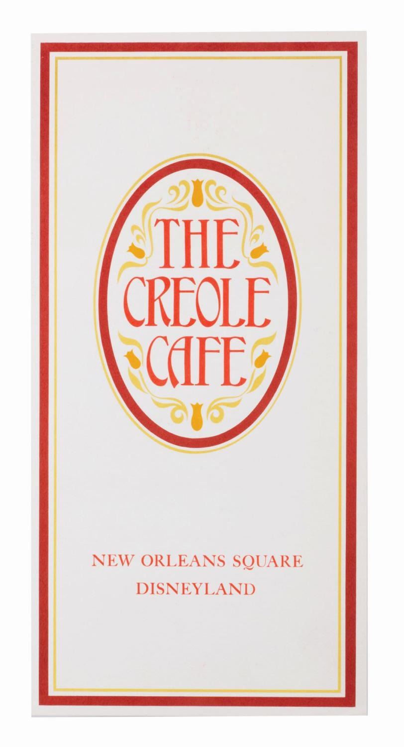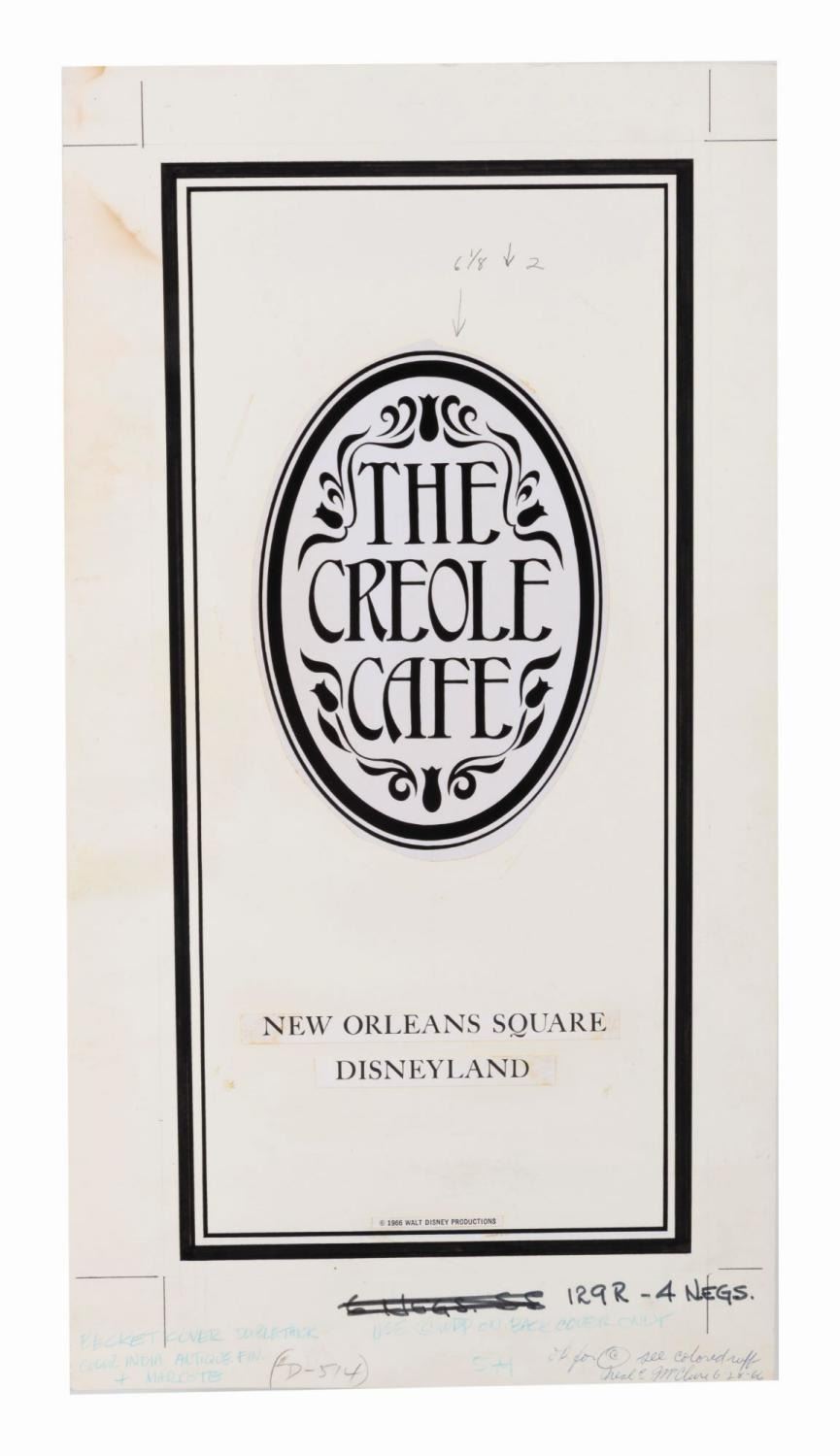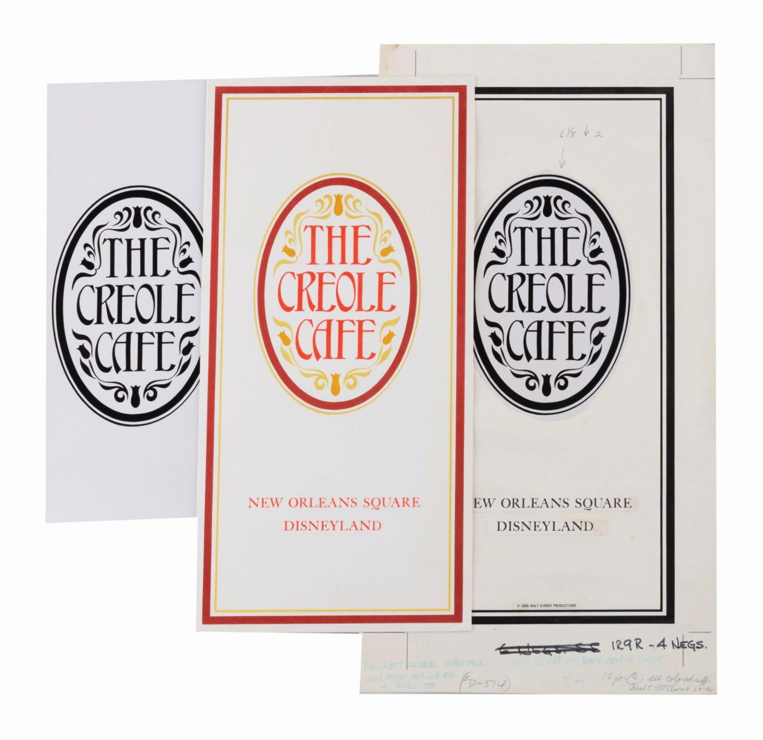 (Disneyland, 1966) An opening year dining menu and original development artwork for The Creole Cafe in New Orleans Square. Included are a photo-printed logo, a mock-up of the cover artwork, and a final menu. The cover artwork features a trimmed printed logo, a printed and applied title and copyright, hand-inked borders, and development notes along the bottom margin. The final printed menu features the layout and imagery from the development art, with a different copyright location on the menu's reverse. In 1972, the restaurant's name changed to Cafe Orleans, which it remains to this day. Ranging in size from 7.5" x 11.25" to 9" x 16.5", the items are in good to very good condition with soiling, light wear, and a smudge on the interior of the final menu.
