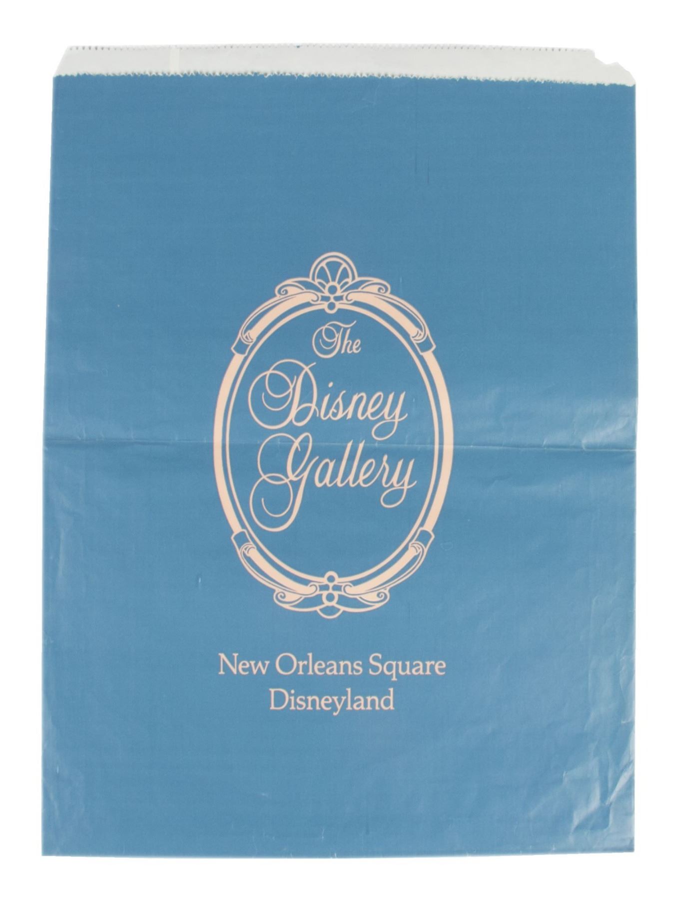 (Disneyland, c.1987) An elegant shopping bag from Disneyland's "The Disney Gallery". This style of shopping bag was used during the very beginning years of the Gallery, and features the original logo for the Gallery on both sides. The bag reads "The Disney Gallery - New Orleans Square - Disneyland". Measuring 15.5"x11.5", the bag is in good condition with some edge-wear from use and a horizontal fold through the center.
