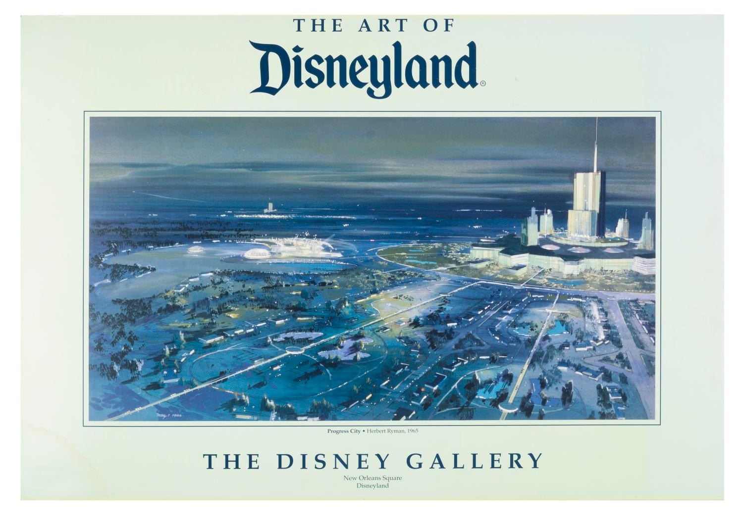 (Disneyland, 1987) An original poster for the Disney Gallery's inaugural exhibit, "The Art of Disneyland." This poster, adhered to a board backing, features a 1965 illustration by Herb Ryman of "Progress City" as well as the exhibit and gallery names. Measures 26" x 36", the poster is in very good condition with minor edge wear, and a faint 4.25” x 4.25” stain to the lower left corner from water exposure.