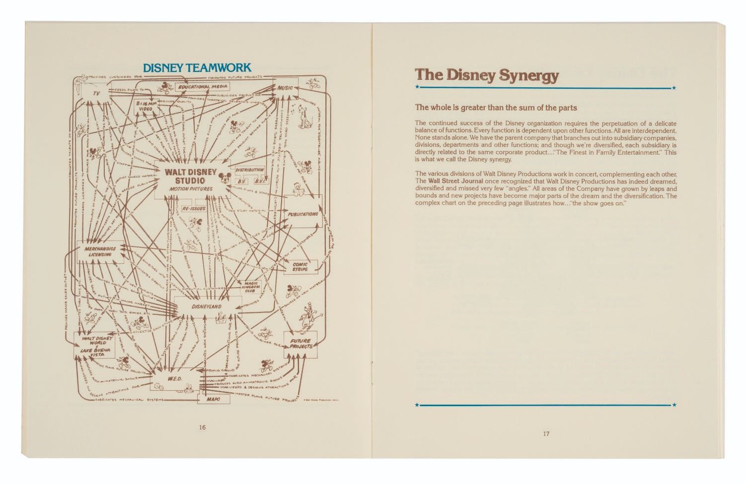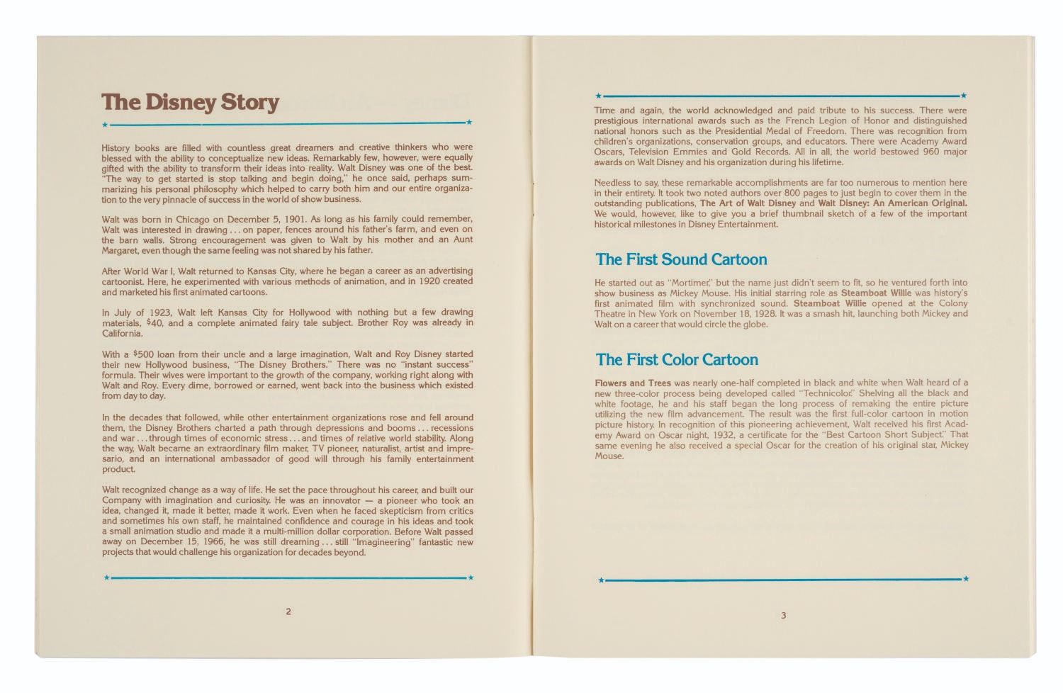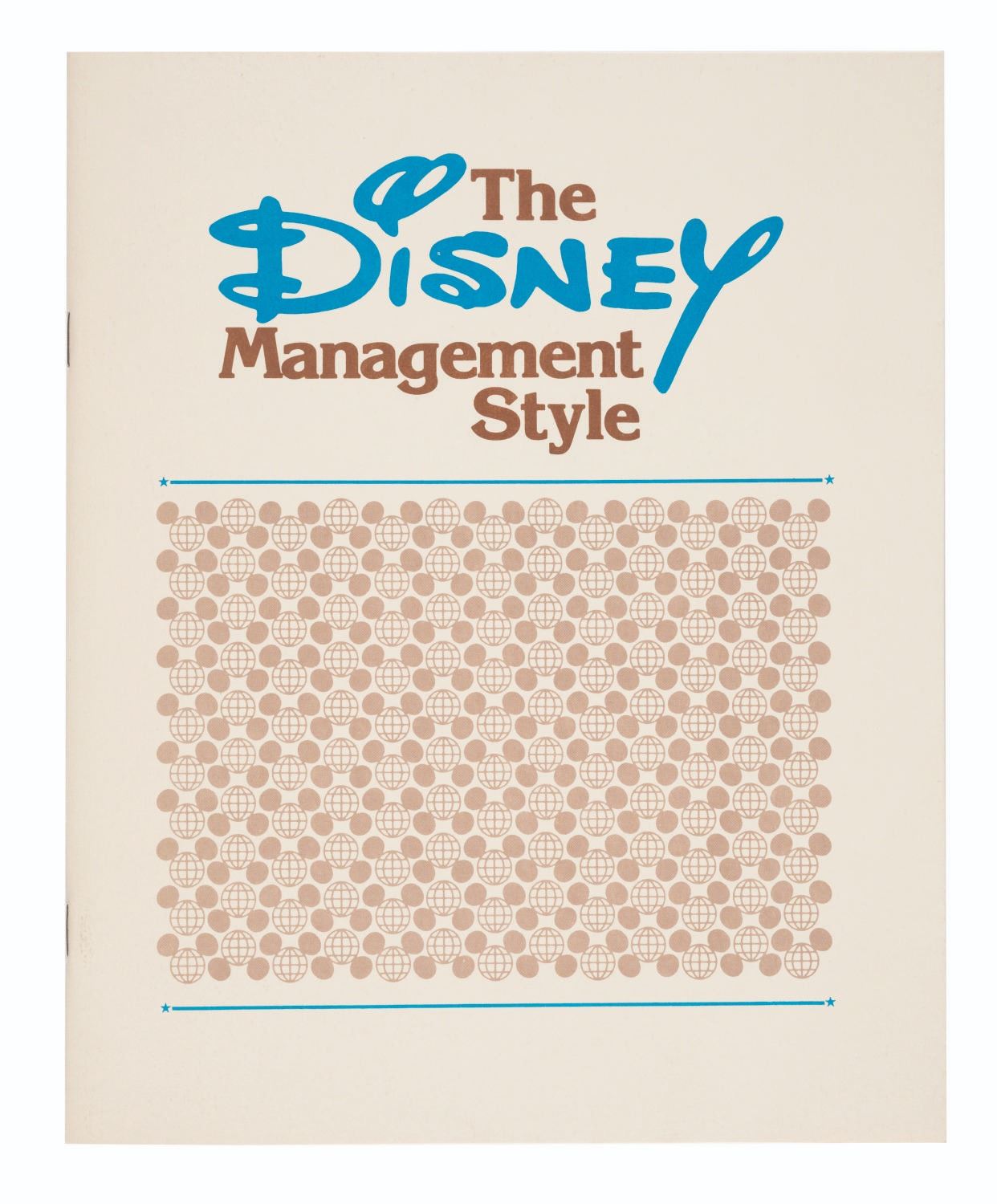 (Disneyland, 1981) A very rare in-house booklet titled "The Disney Management Style." The book outlines the history of Walt Disney Productions as well as gives an overview of their current business, practices, and goals. Measuring 8"x10", the booklet is in fine condition with one slight scuff from handling.