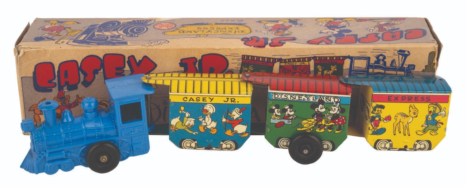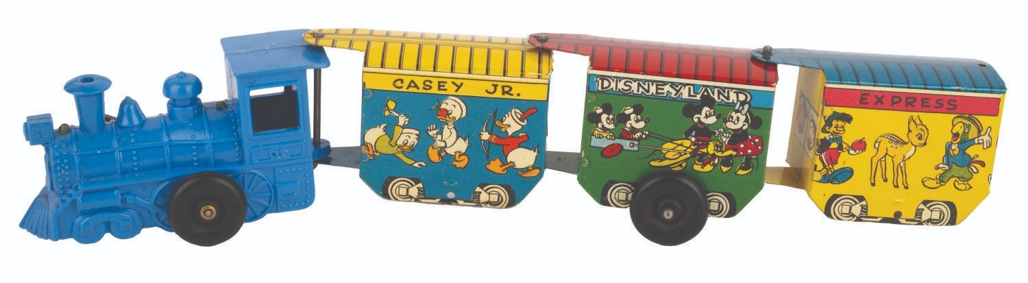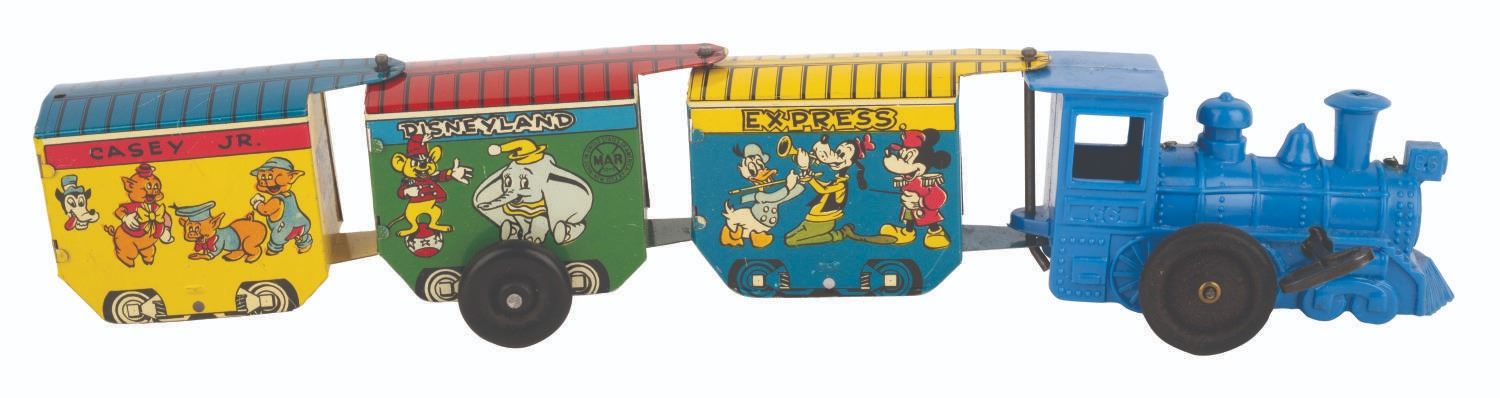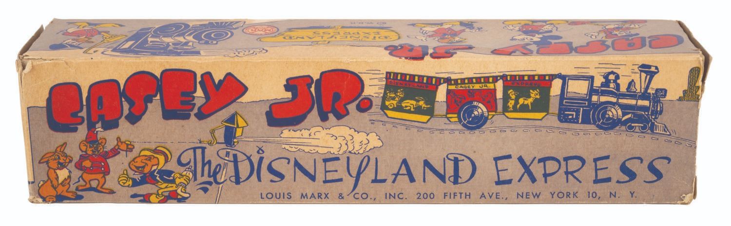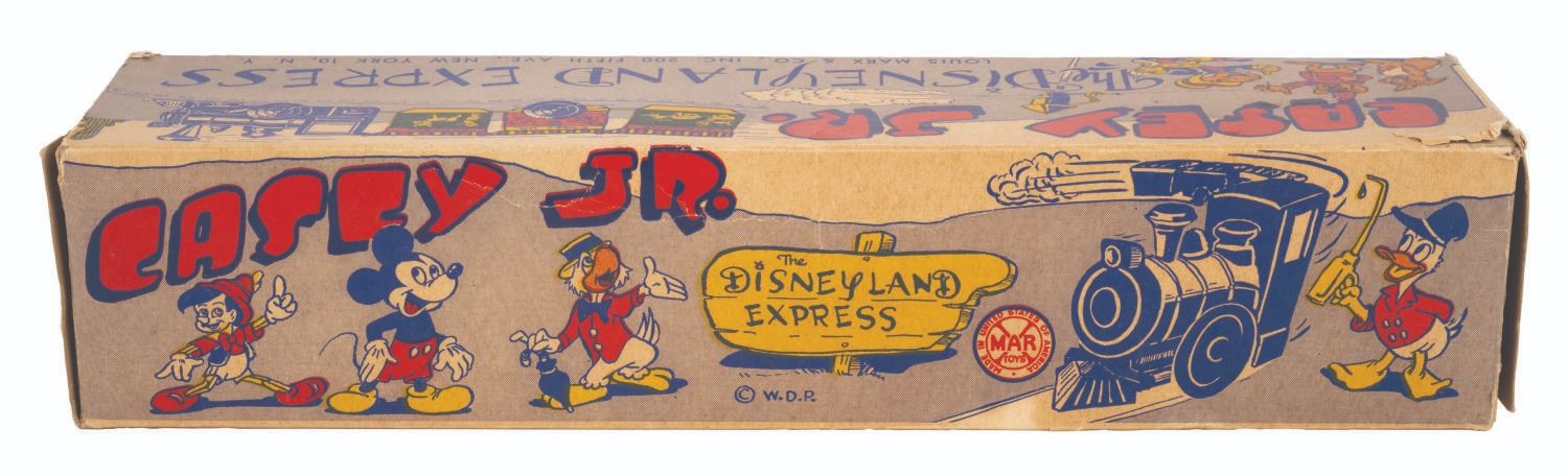 (Marx, 1950s) A tin-litho wind-up train titled "The Disneyland Express Casey Jr." Created by Marx Toys, the train cars depict Mickey, Minnie, Donald, Goofy, Pinocchio, Dumbo, and many other Disney characters with a mechanized and molded plastic locomotive. Measuring 12.5" long, this train is in very good non-working condition with minor scuffing and wear. This toy comes packaged within its colorful 12.75"x3"x2.75" good condition box with wear to the edges and corners of its panels.