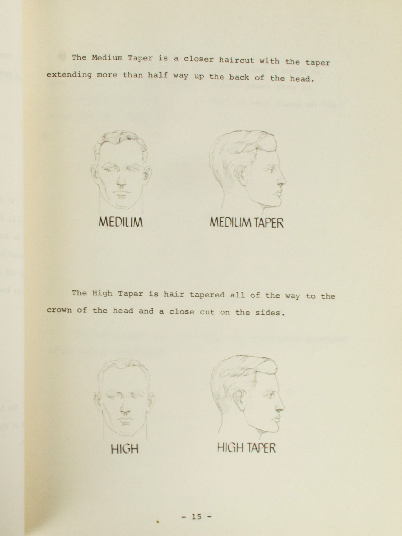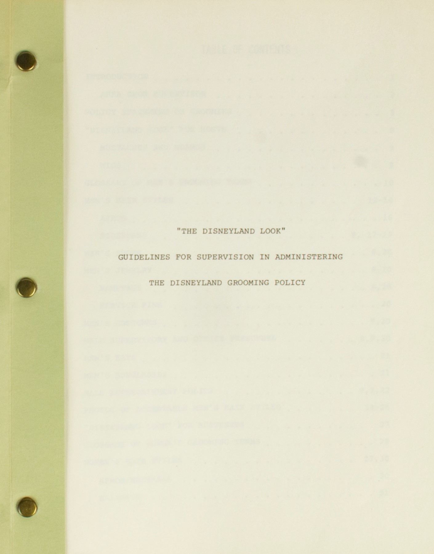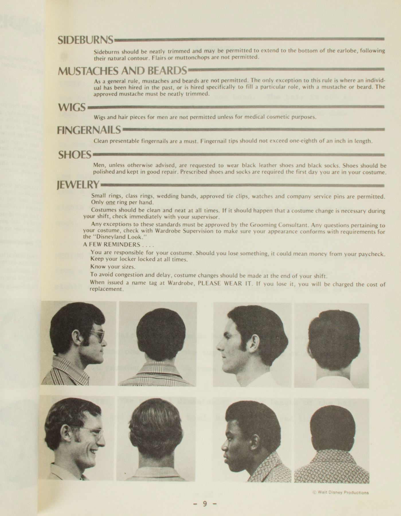(Disneyland, 1971) A rare internal booklet for Supervisors and Administration personnel titled "The Disneyland Look", that provides a summary of the park's expected appearance and grooming guidelines as well as instructions on how to reprimand incorrect practices. Unlike the more commonly seen booklets given to cast members, this policy guide is 3-hole punched and held together with brass brads. Included within are photos and descriptions of appropriate hair length and styles, as well as policies on shoes, jewelry, glasses, hats, and more. Measuring 11"x8.5", the guide is in good condition overall with some yellowing and wear to the cover from use.