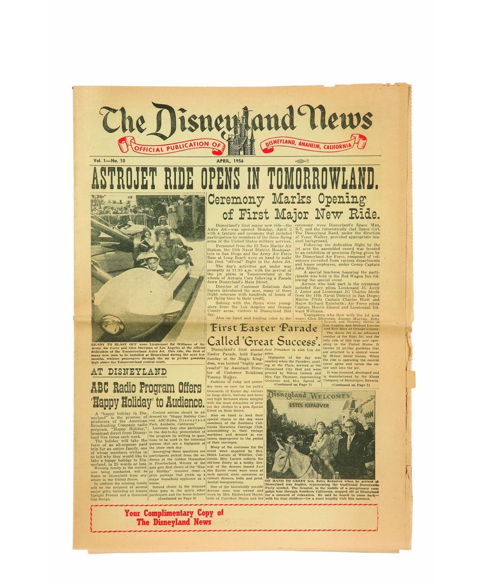 Disneyland, 1956) Vol. 1 - No. 10, April, 1956 issue of the Disneyland News announcing the opening of the newest ride in Tomorrowland, the Astrojets. Other articles include an update on expansions in Frontierland and Fantasyland as well as concept art of the Tom Sawyer Rafts. Measures 11.5”x16”. In good condition with minimal wear and yellowing throughout.