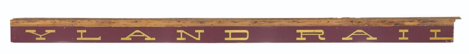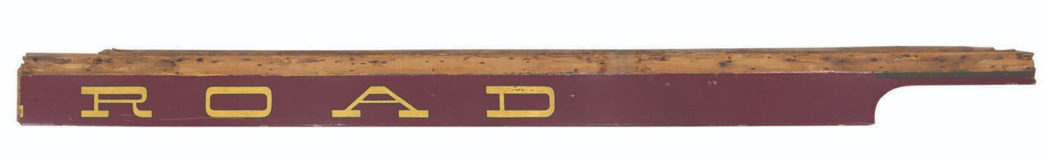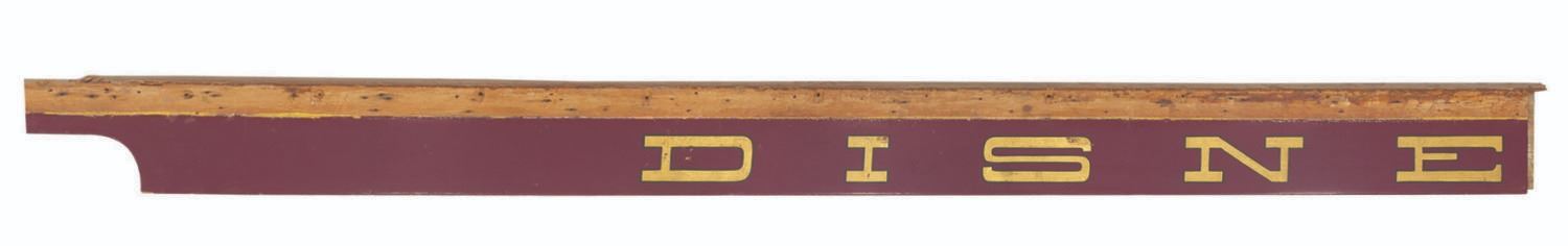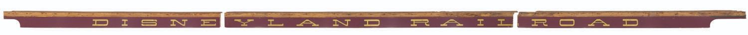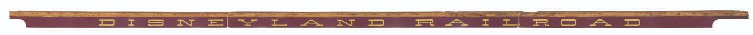 (Disneyland, 1955) The "Disneyland Railroad" sign from the side of the Lilly Belle train car. As Guests lined up by the thousands to enter Disneyland on opening day, they were greeted by the sight of the Main Street Train Station and the E.P. Ripley pulling the bright yellow cars, each proudly labeled "Santa Fe & Disneyland Railroad." Most of those passenger cars were retired by 1974 in favor of the open "holiday" cars still in use today. The Grand Canyon car was refitted into the Lilly Belle, with the signage repainted to read simply "Disneyland Railroad." These three panels - an impressive 36.16 feet long - graced the Lilly Belle until her last rehabilitation in 2006, seen by millions of Guests in both forms through 51 years of Disneyland history. The three panels measure from 10" to 10.5" tall and 136" to 169" long. The panels are designed to overlap slightly, and the top 3.5" of each is bare wood, where it was fitted into the car's roof above. The sign is in very good condition, even with much wear from Park use, the elements, and scuffs and scrapes from handling. This is truly a one-of-a-kind artifact of Disneyland. Due to size and weight, special shipping arrangements are required. Please inquire before bidding.