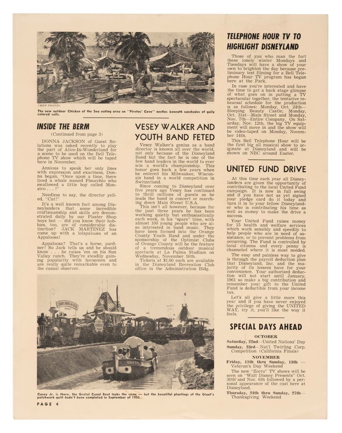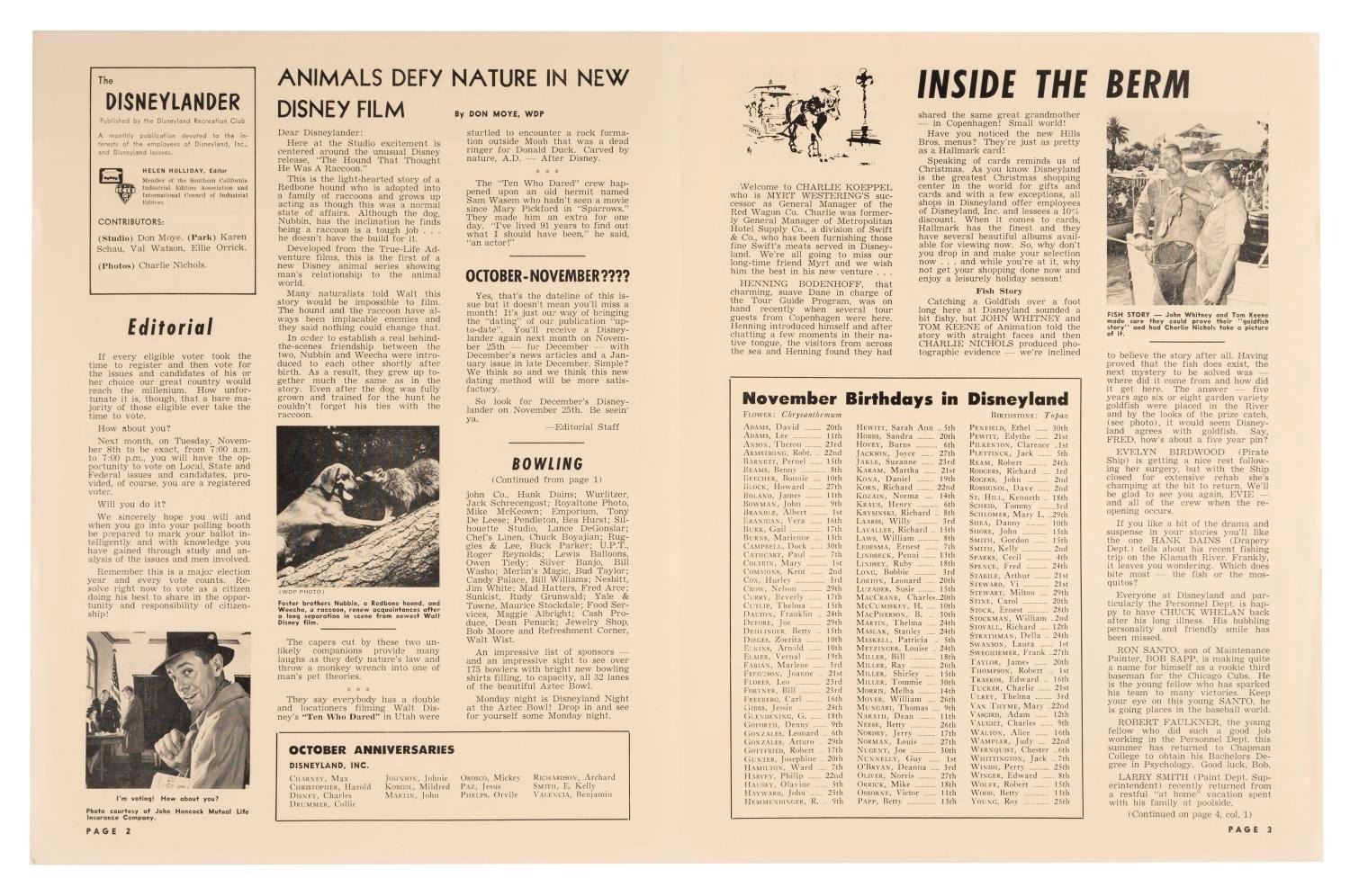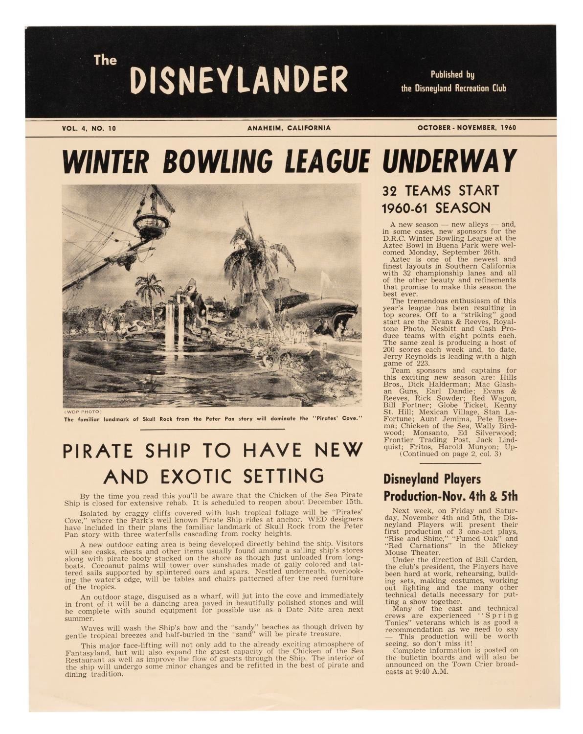 (Disneyland, 1960) An October-November 1960 issue of The Disneyland, published by the Disneyland Recreation Club, featuring a cover story about the construction of the “Peter Pan” Skull Rock in Fantasyland. Measuring 8.5” x 11”, the issue is in very good condition with light creases and wear.
