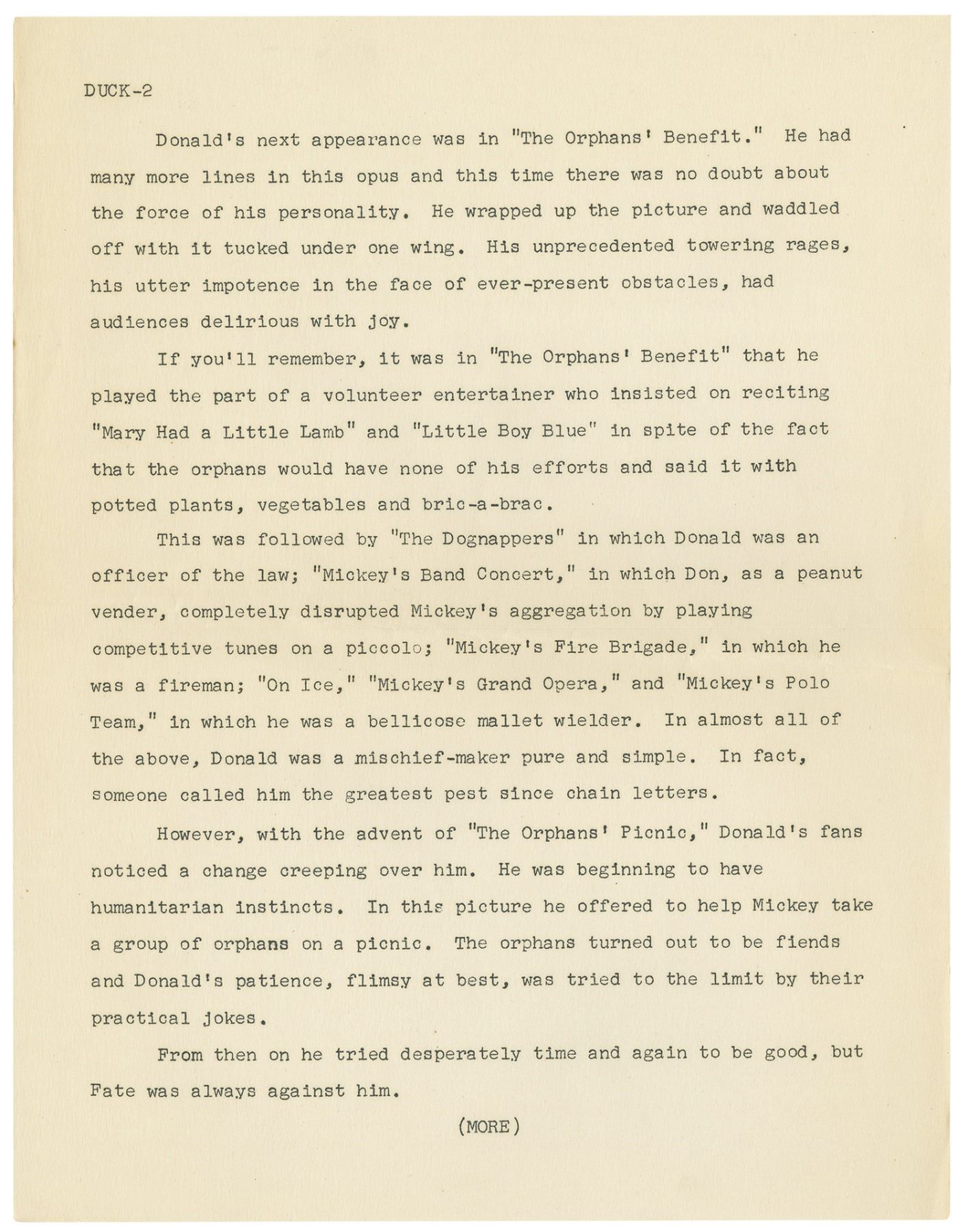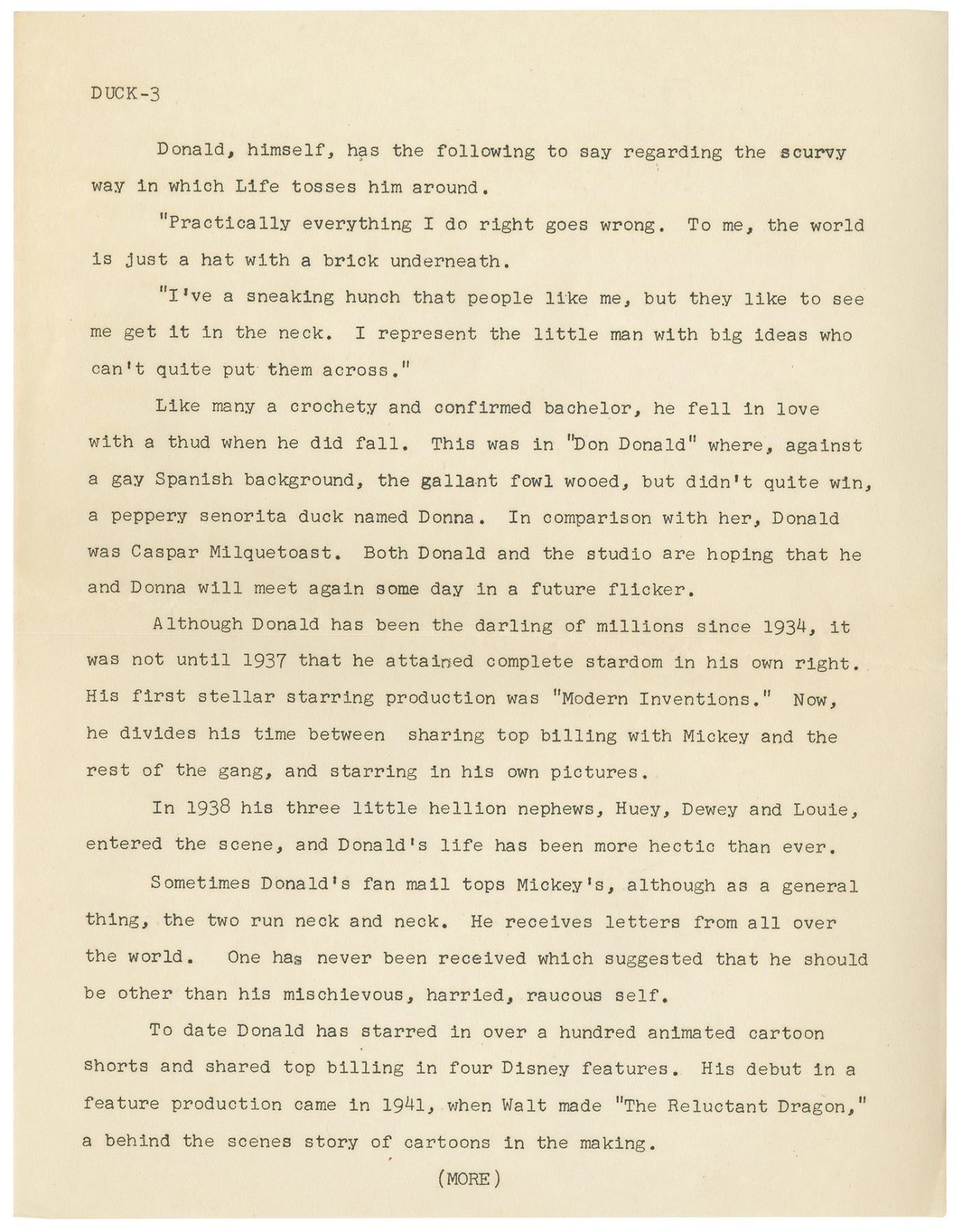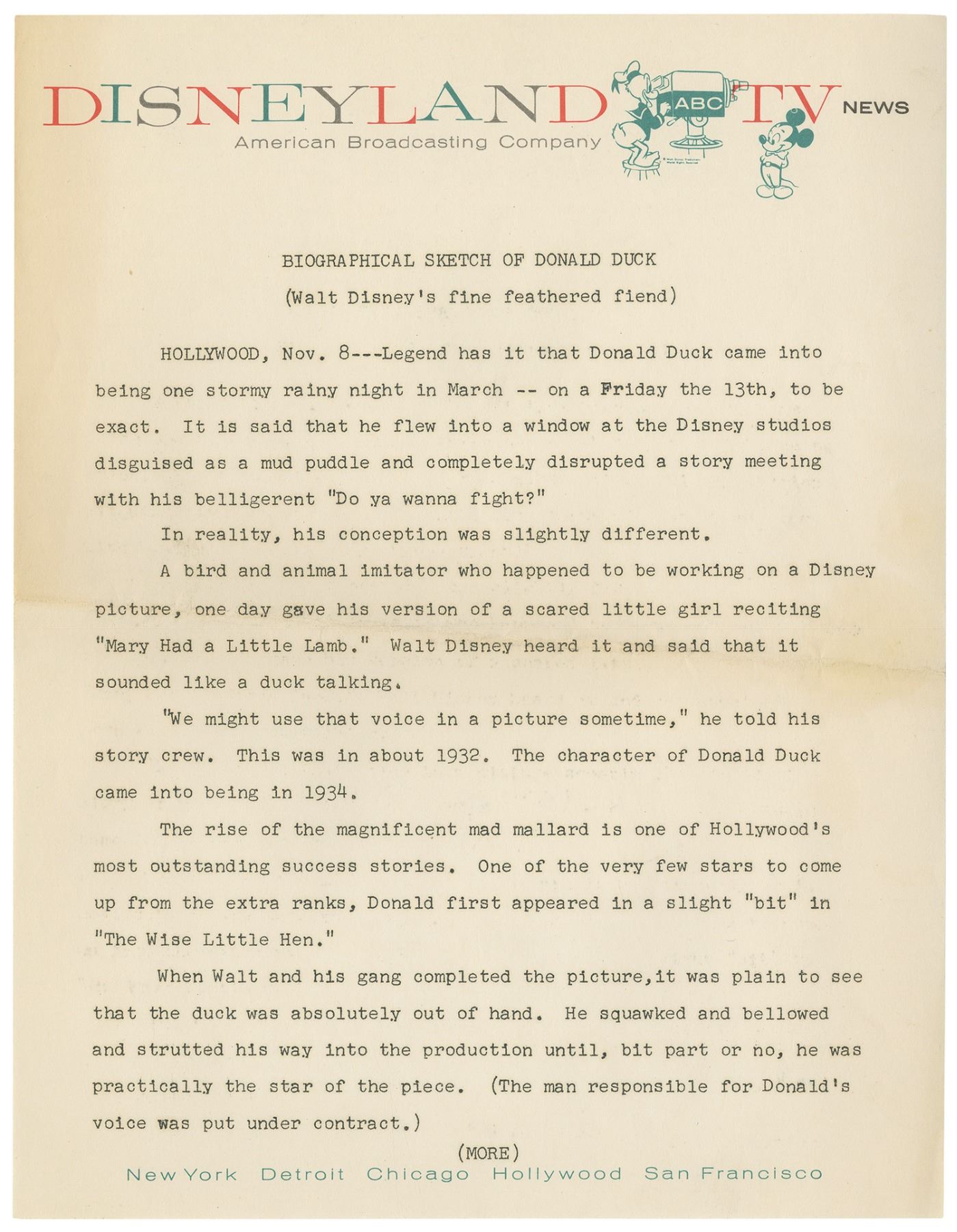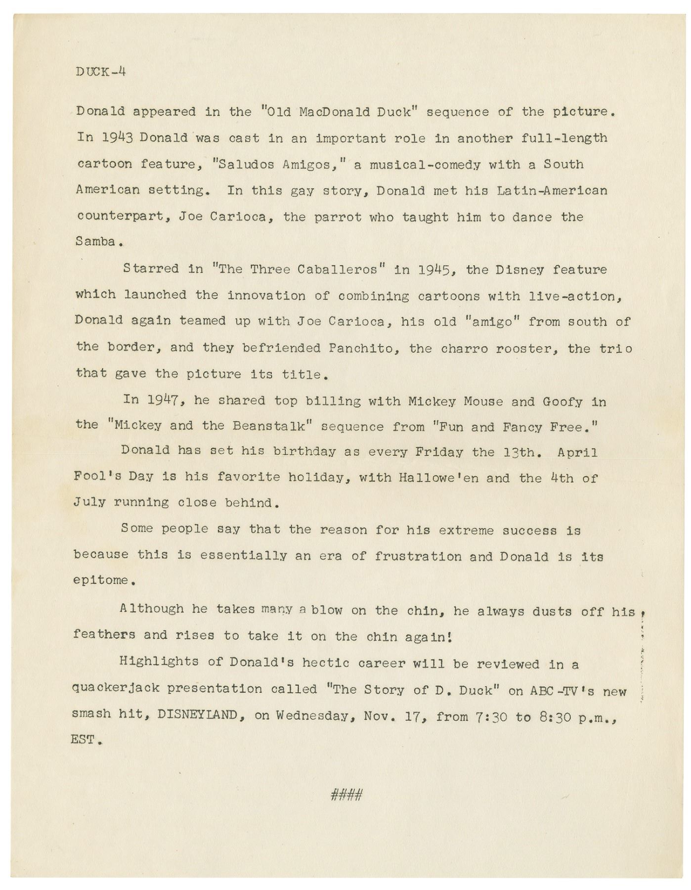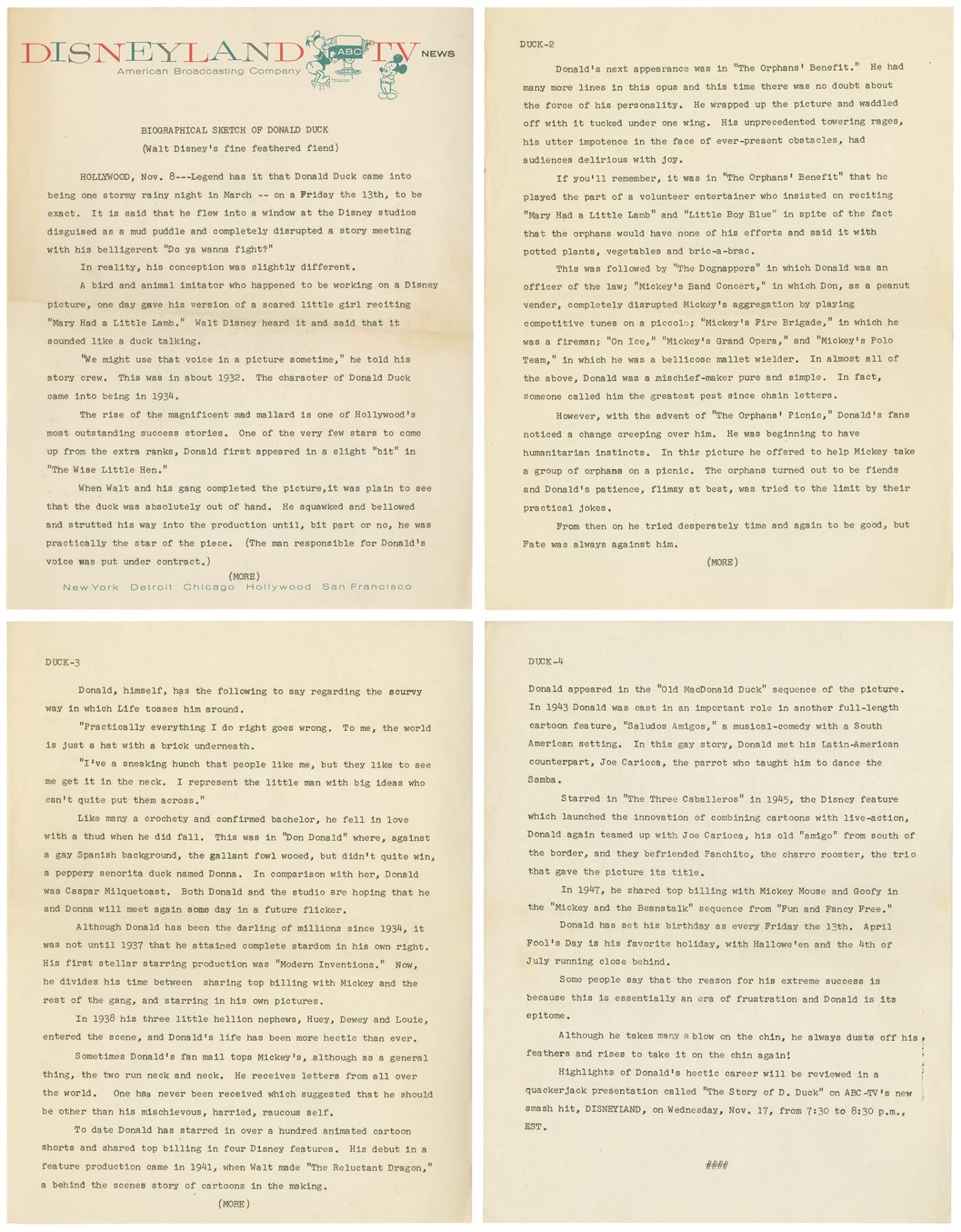 (Disney, 1954) A very rare Disneyland TV News press packet created for Episode 4 of the Disneyland television show. Titled, "The Donald Duck Story," the episode aired on Nov 17, 1954 and told the story of how Donald Duck came to fame. This 4-page summary, created with a Disneyland TV News front page, gives a summary of the episode's content. Each page measures 11"x8.5" in the set is in very good condition with minor wear from use and a horizontal fold line through the center.