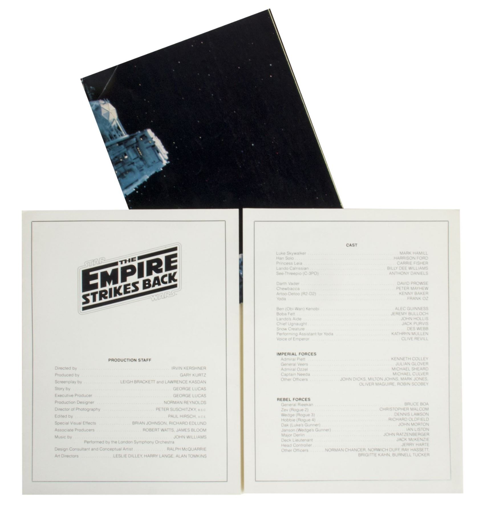 (LucasFilm, 1980) A sleek film program from the theatrical release of "The Empire Strikes Back". Featuring the film's logo on the front cover, the program unfolds to provide information on the cast, production staff, special effects units, and more. This rare program measures 11"x8.5" when folded, and the condition is good with some cover wear. The program includes a large poster which unfolds to 20.5"x30.75" and is in good condition with a few small tears on the top-edge.