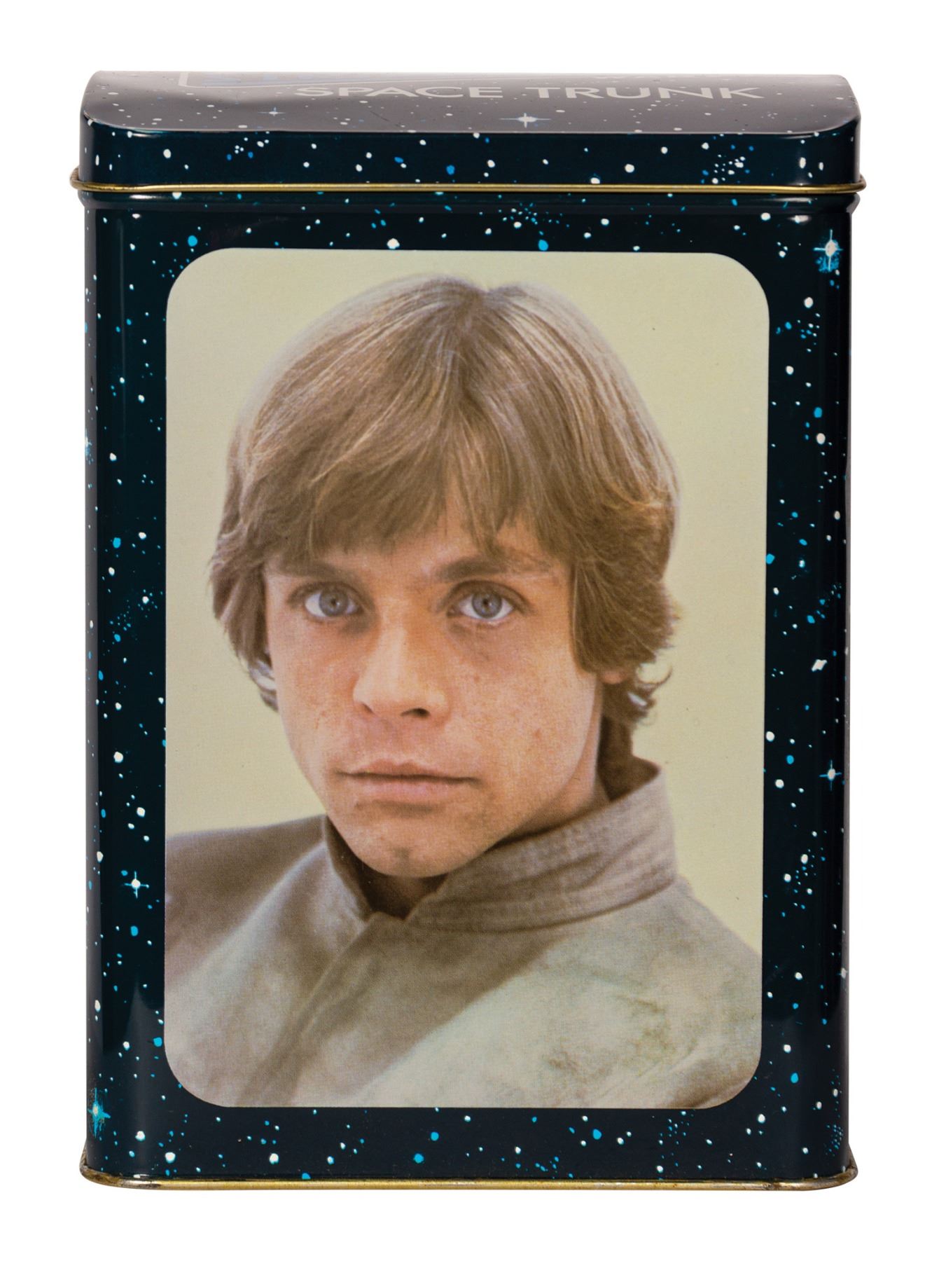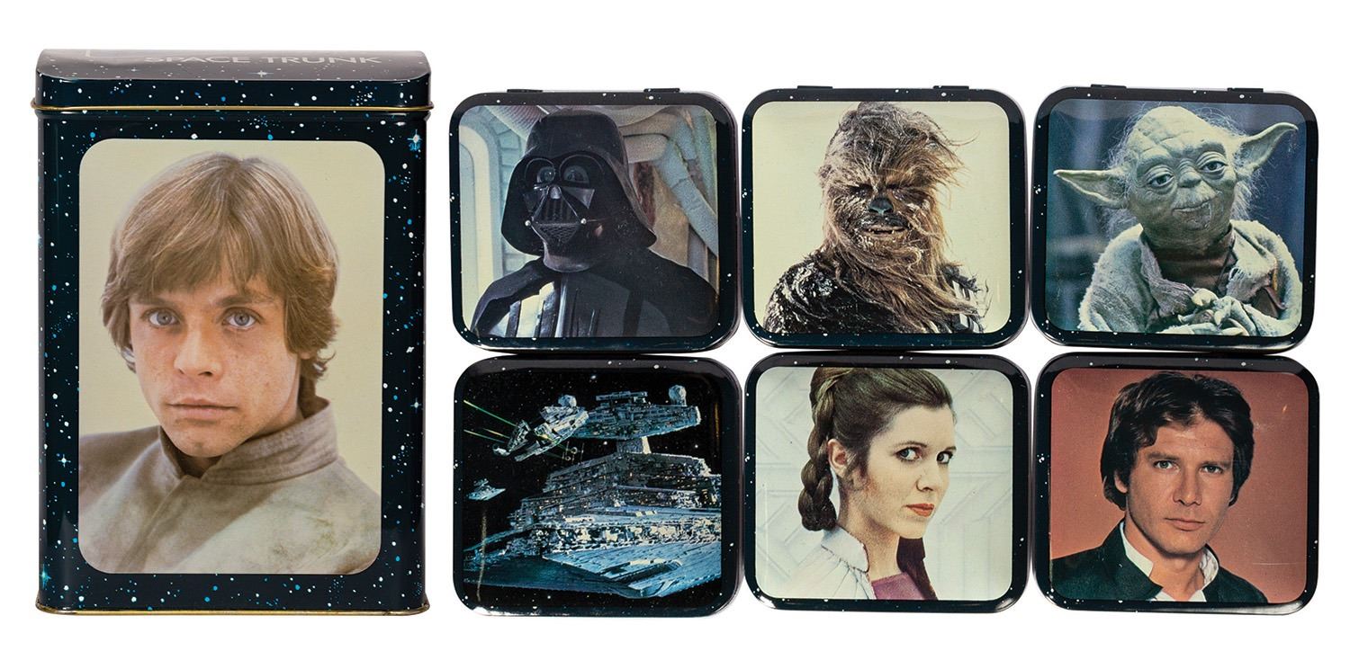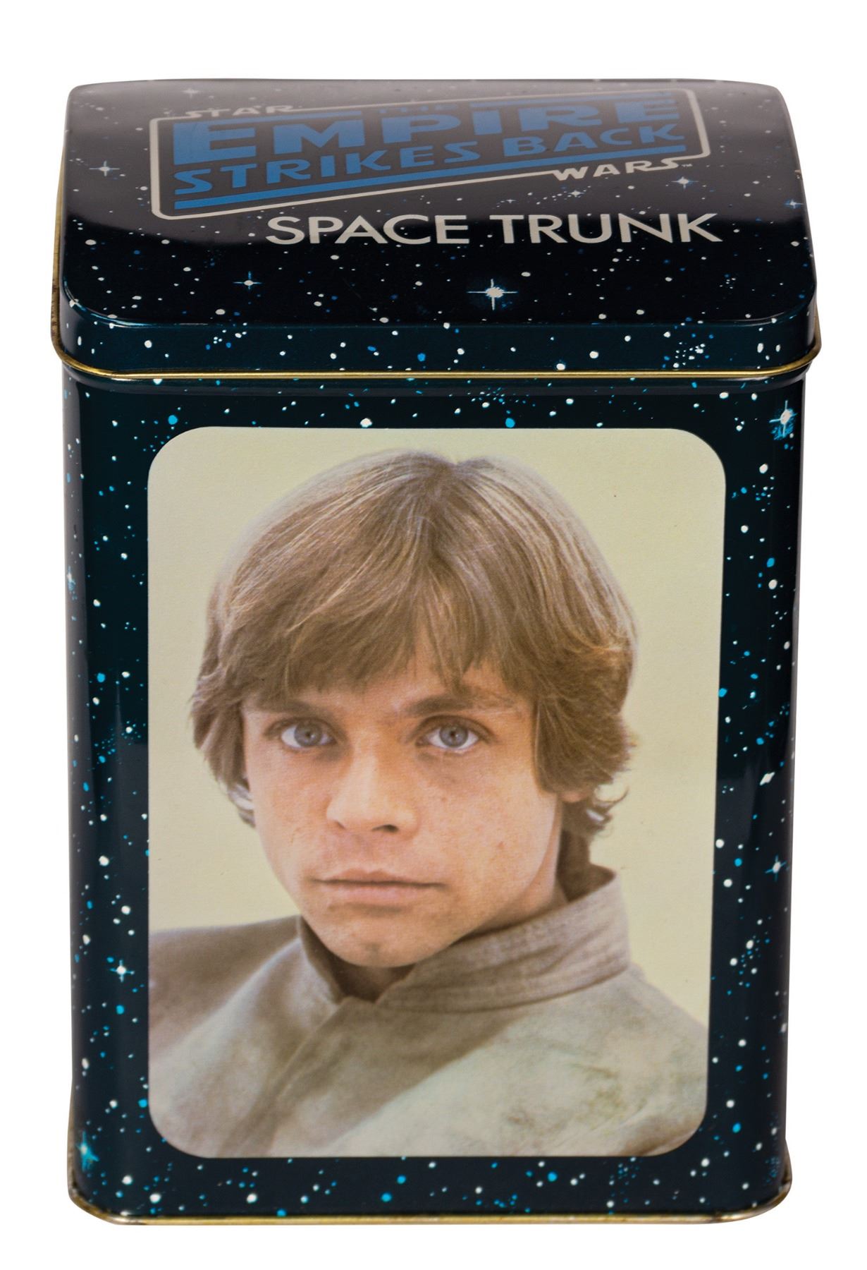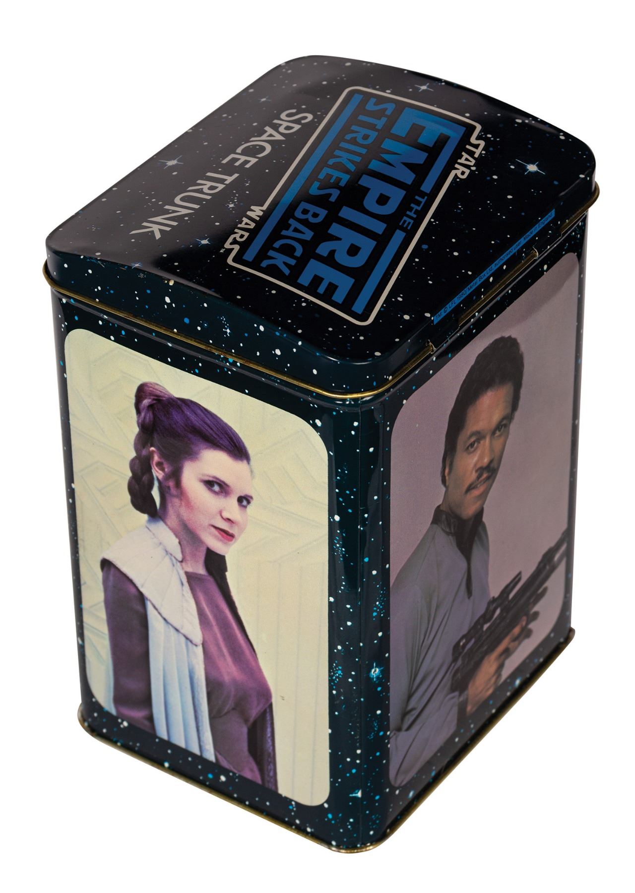 (Lucasfilm, 1980) A souvenir "Space Trunk" tin box and (6) smaller character boxes featuring imagery from The Empire Strikes Back. Each side of the "Space Trunk" depicts a different hero from the film, and the character boxes each feature a unique character or scene. The trunk measures 4.25"x5" and 7.75" tall, and the smaller boxes measure 3.25"x3.5" and just over 1" tall. The condition is good overall, with minor surface wear from light use.