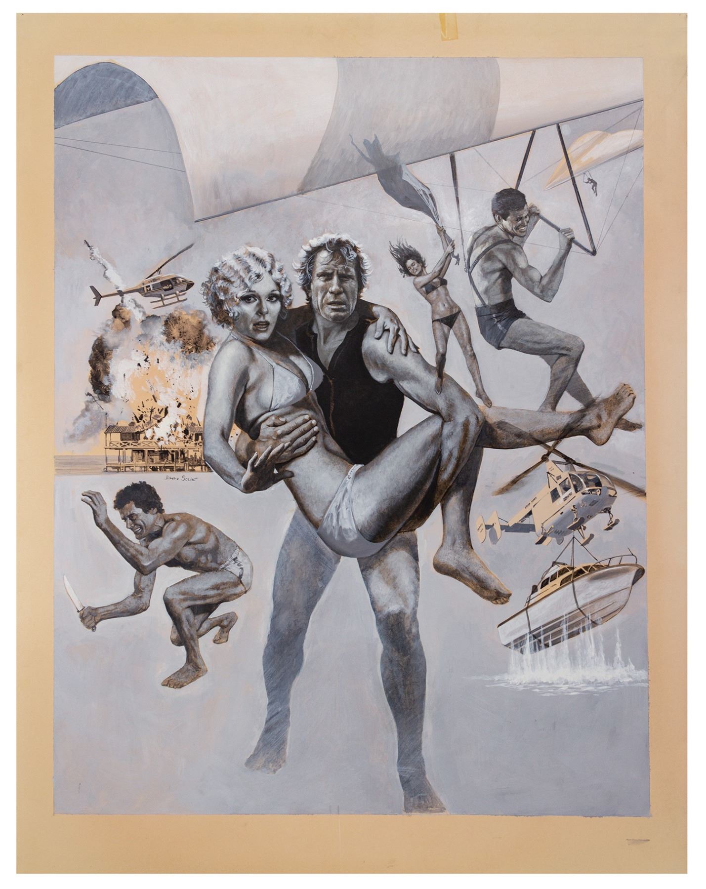 (Martin Poll Prod, 1979) An original painting by artist John Solie that was created for The Fantastic Seven. Accomplished in acrylic on art board, the painting is signed by Solie near the left-edge, and depicts the principle cast in a dramatic action sequence. The painting has an image size of 33"x26" on 38"x30" art board. The artwork itself is in very good condition, with some tape residue and wear to the edges of the board and to the border areas.