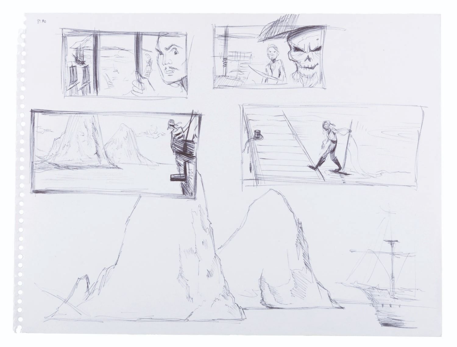 (Disney, 2002) The very first sketch of Captain Jack Sparrow from “Pirates of the Caribbean: The Curse of the Black Pearl.” Director Gore Verbinski joined the project in 2002 and brought aboard frequent collaborator James Ward Byrkit, who served as a creative consultant and storyboard artist on the film. As the two were on their first location scouting trip in the Caribbean, Verbinski mentioned to Byrkit the idea of having Jack’s entrance be him stepping off of a sinking ship. Byrkit loved the idea so much, he immediately sketched storyboards in his notepad in pen. This initial sketch, accomplished in pen on drawing paper, was made before Johnny Depp was even cast or the script was completed. Captain Jack’s iconic entrance and Depp’s performance delighted audiences worldwide, kicking off a franchise that would gross over $4 billion. Measuring 9” x 12”, this important piece of Disney Studio history is in very good condition with light wear.