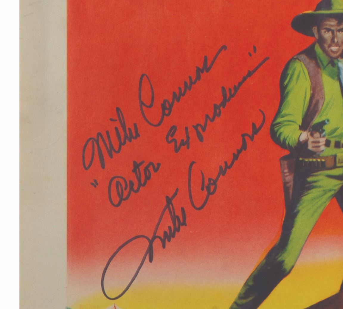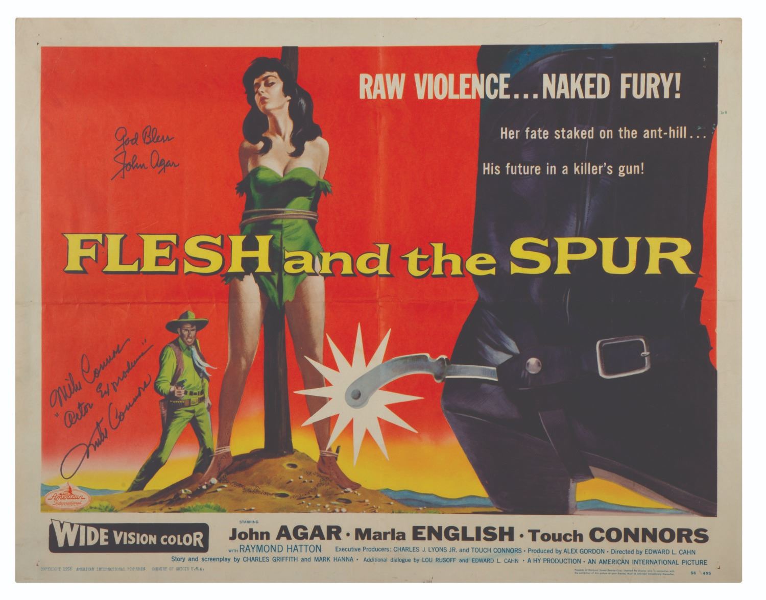 (American International Pictures, 1956) A jumbo window card for the western Flesh and the Spur, signed by actors John Agar and Mike Connors. Measuring 22"x28", the card displays in good condition, with vertical and horizontal center folds, and light wear mainly to the edges including pin holes, small creases, and scuffs.