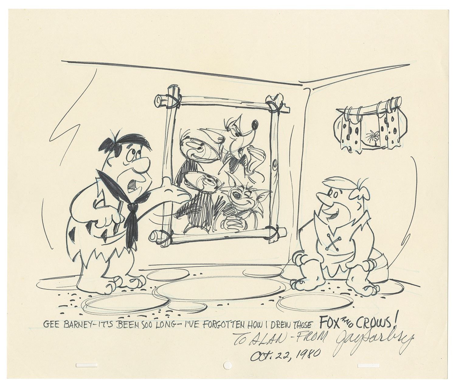 (Hanna Barbera, 1980) An original drawing by animation supervisor Jay Sarbry of Fred Flintstone and Barney Rubble from The Flintstones. This drawing was created by Sarbry in ink on art paper and is signed and personalized in the lower right "To Alan Hylton." Measuring 10.5"x12.5", the drawing is in very good condition with little wear.