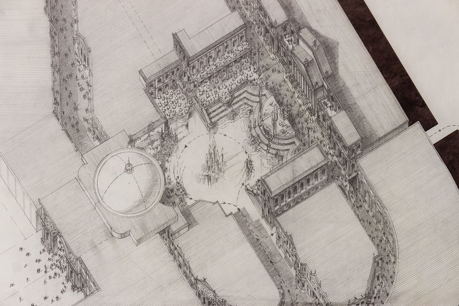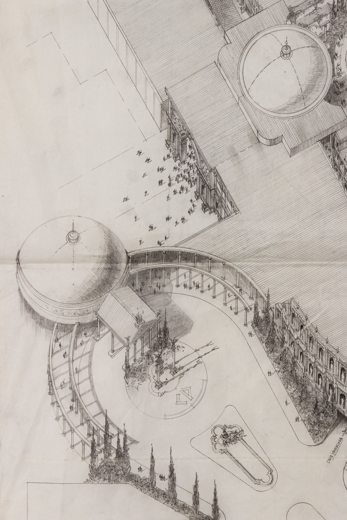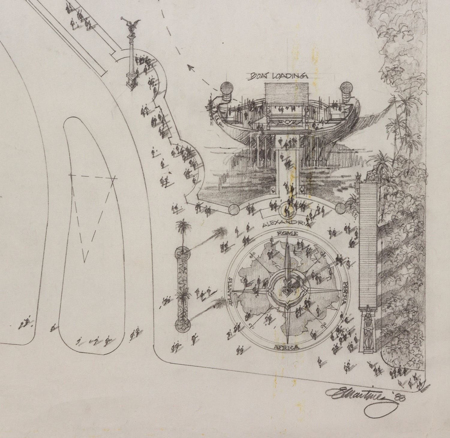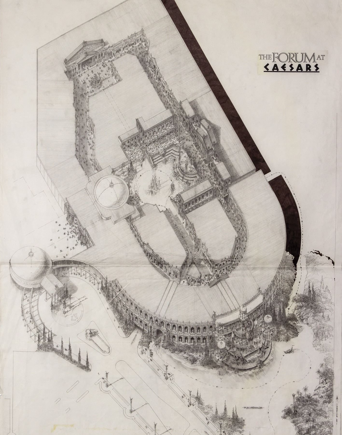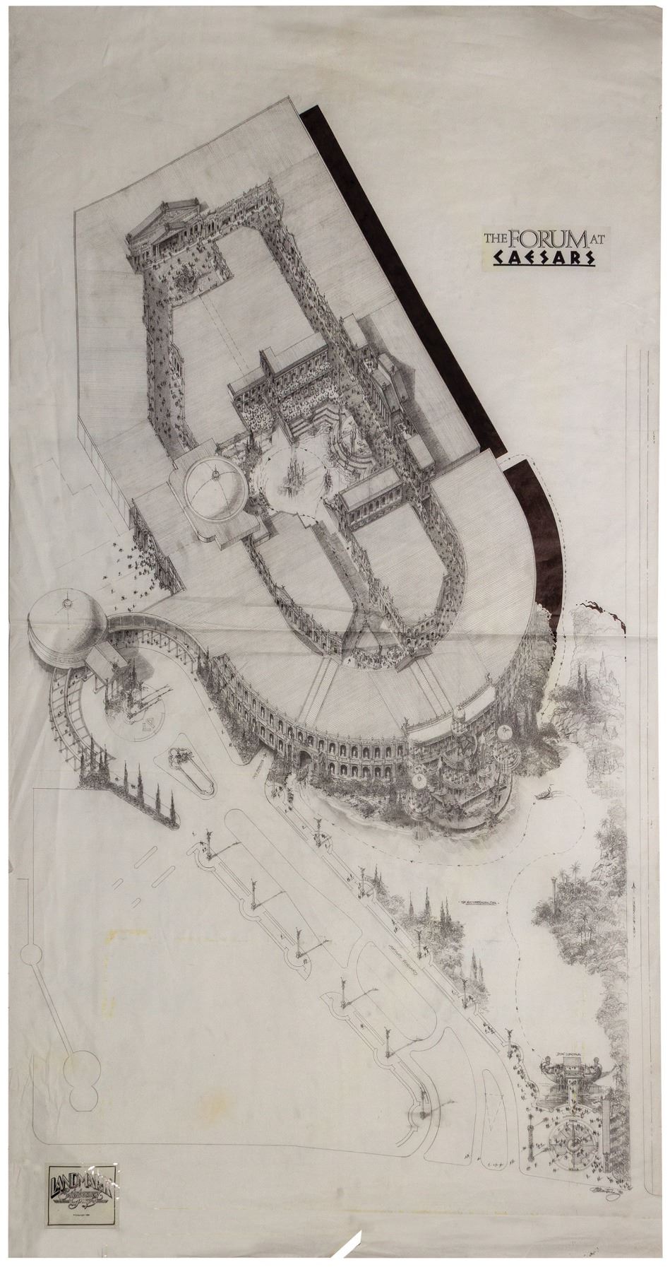 (Landmark Entertainment, 1988) A gorgeous concept for the Forum at Caesars Palace. This detailed concept drawing includes the potential Forum building as an open-air shopping center with the "Mediterranean Sea" as a water feature in the front. The drawing provides a fantastic glimpse of early planning for the iconic Caesars shopping center. Accomplished in pencil with ink shadow, the concept measures 67"x36", and is in good to very good condition with expected edge-wear, including a tear along the bottom edge and a fold across the center from previous storage.