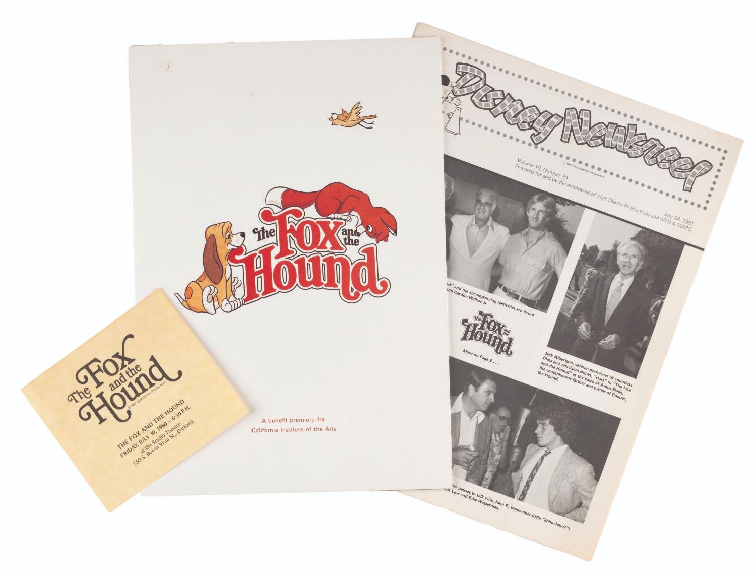 (Disney, 1980-1981) Three “The Fox and the Hound” theatrical release souvenirs. Included are a Vol. 10 No. 30 issue of Disney Newsreel from 1981 highlighting the new film, a "The Fox and the Hound" program for the benefit premiere for the California Institute of the Arts, and a ticket for the film at the Studio Theatre on Friday, July 10, 1980, a full year before the film's theatrical release. Ranging in size from 3.75” x 4.25” to 8.5” x 11”, the items are in good to very good condition with light scratches, wear, and discoloration from age.