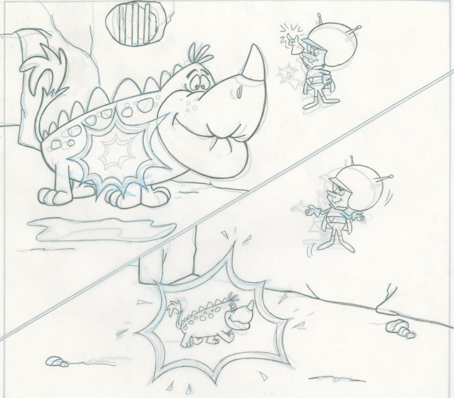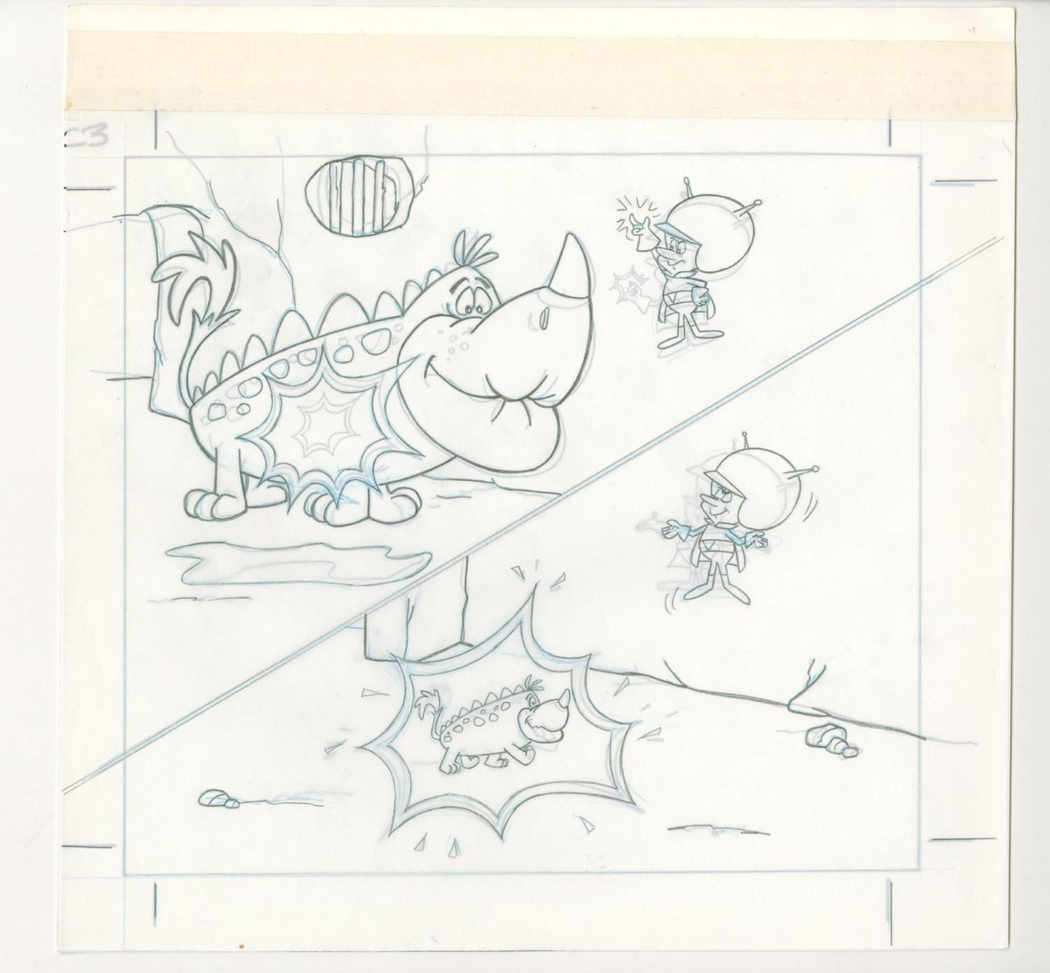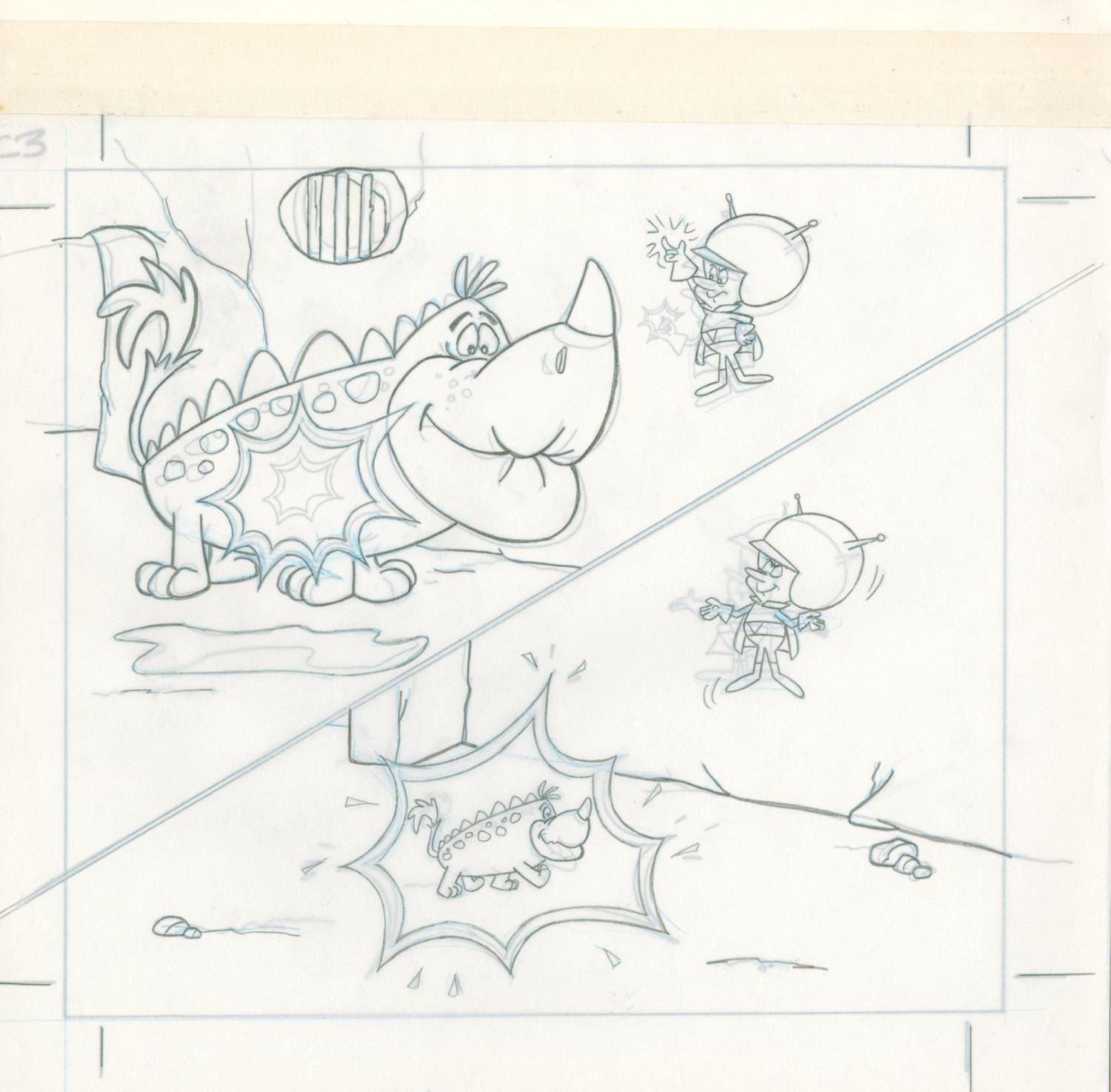 (Hanna-Barbera, 1991) An original development drawing for a View-Master slide, featuring The Great Gazoo from the TV series, "The Flintstones." The graphite drawing and photocopies were created at the Studio, and used to produce a color image on a View-Master reel. Measuring 11.75” x 11.75” each, the drawing and photocopy are in very good condition with minor fading, discoloration from age, and corner and edge wear.