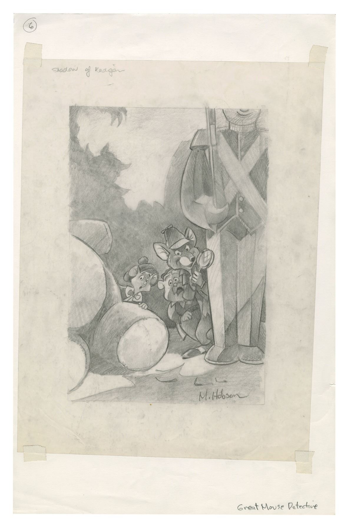 (Disney, 1986) An original concept drawing by artist Michael Hobson featuring characters from the animated feature film, The Great Mouse Detective. The artwork is believed to have been created for posters or other promotional materials for the theatrical release of the film. The drawing is accomplished in pencil on vellum which is taped to a 17"x11" sheet of paper. The condition is very good with minor edge wear, and Hobson signed the bottom-right corner of the drawing.