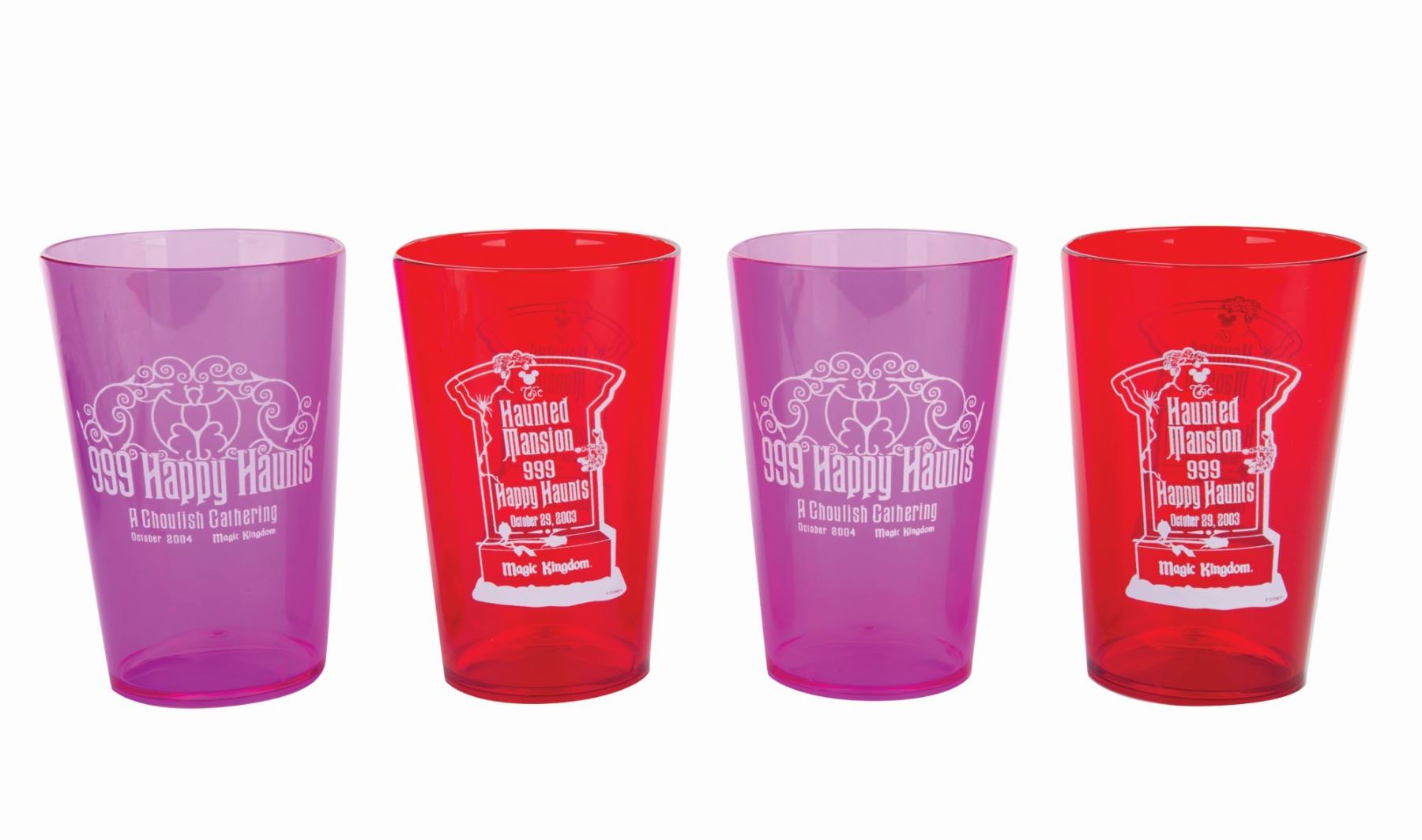 (Walt Disney World, 2003-04) A collection of (4) souvenir tumblers commemorating "The Haunted Mansion 999 Happy Haunts" & "A Ghoulish Gathering" events occurring at The Magic Kingdom in 2003 & 2004. Measuring 5" tall and 3.5" at their widest diameters, the plastic cups are in fine condition.