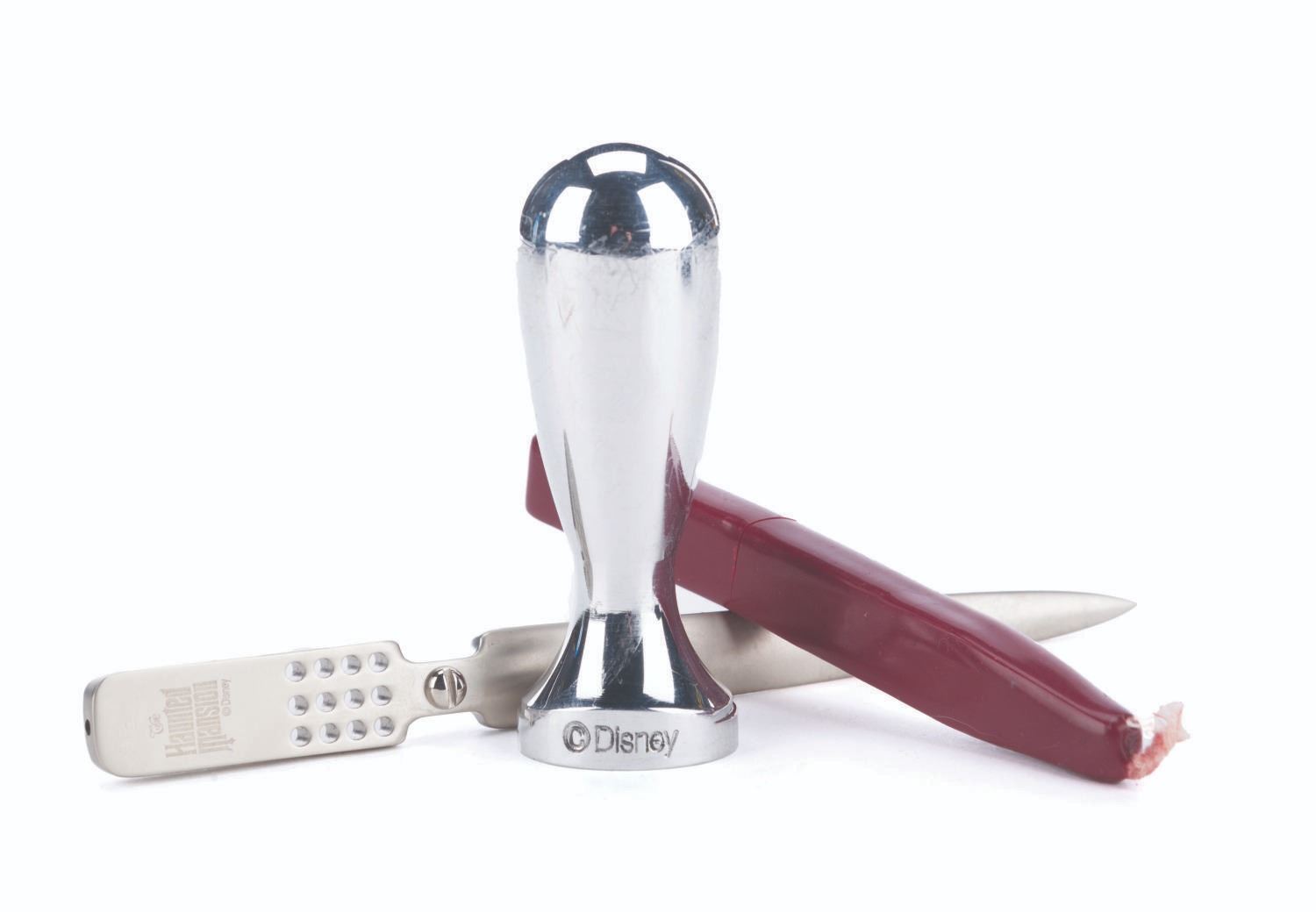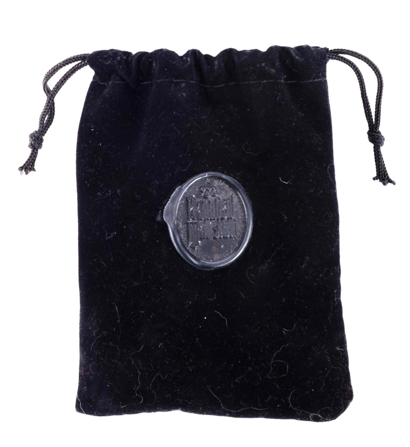 (Disney Parks) The Haunted Mansion wax seal set, including a seal, a letter opener, and red sealing wax within a velvet drawstring bag. The set is in fine condition.