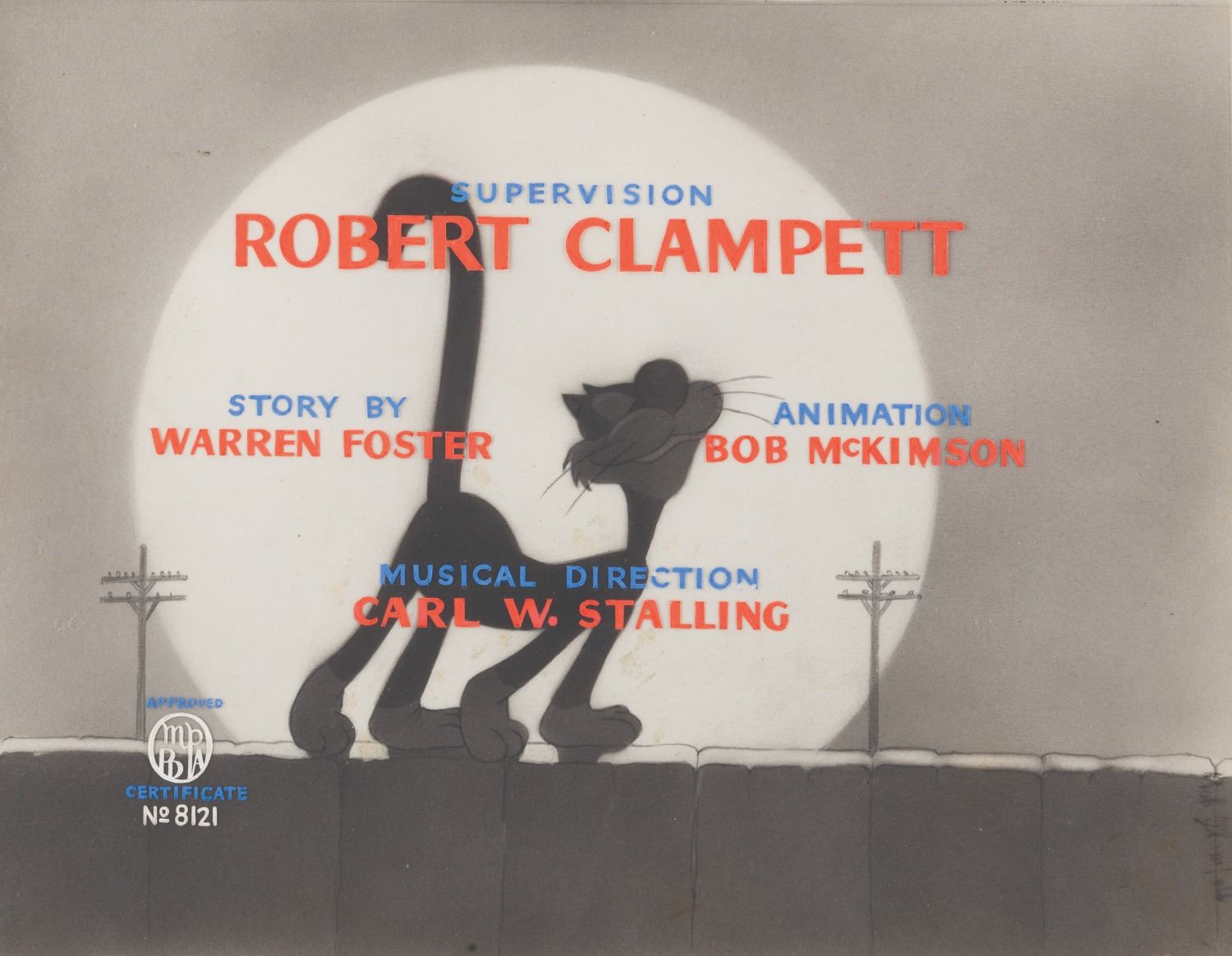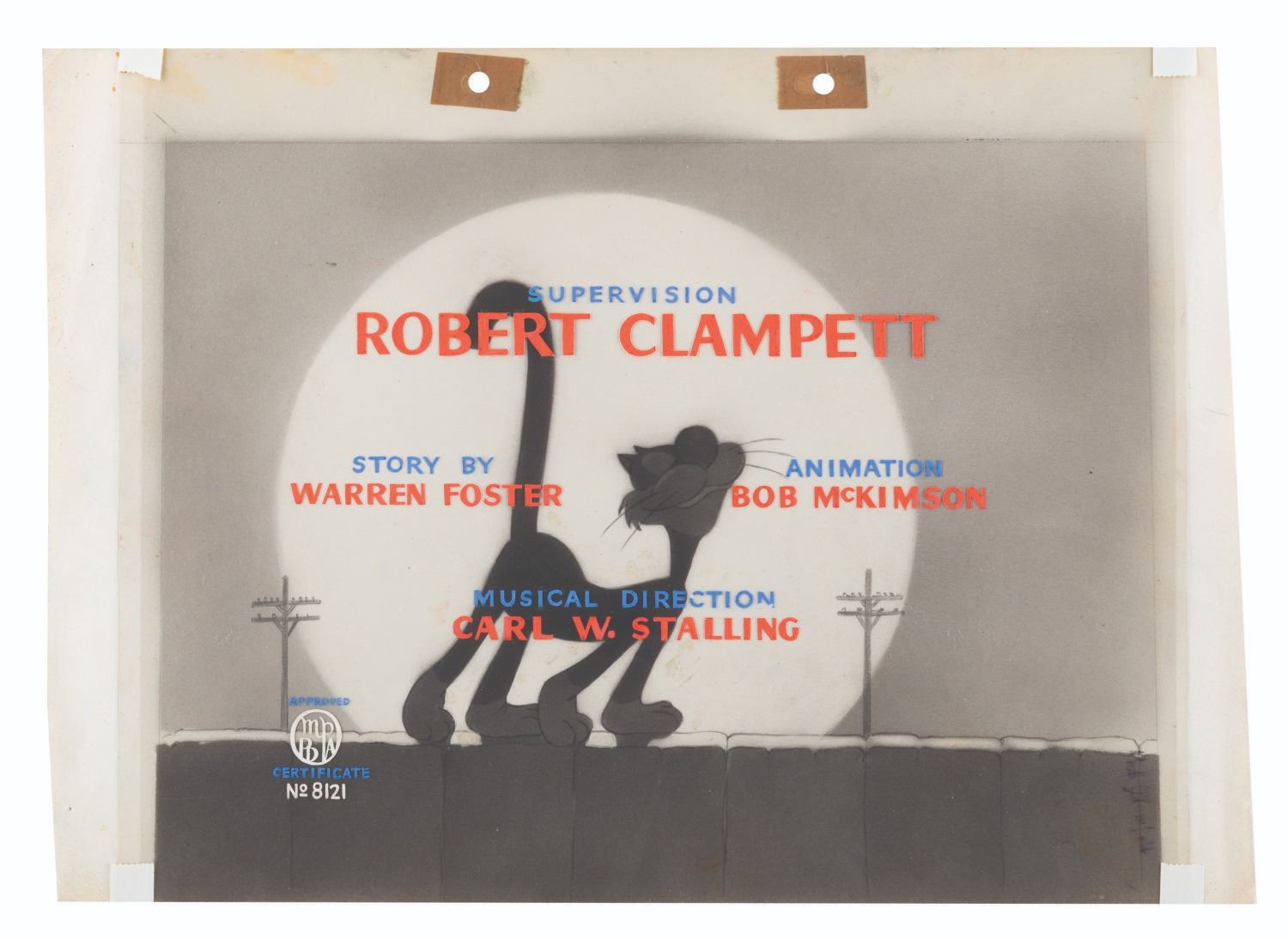(Schlesinger, 1942) The original title credit cel and background for “The Hep Cat,” directed by Bob Clampett. The title was later changed to the Blue Ribbon series card, with this original piece rarely seen. Accomplished in gouache and cel paint, the 10” x 12.5” cel and the 10” x 14” background are in good condition with scratches throughout, spots of paint loss, discoloration from age, pinholes on the background from production use, and a faded “Bob Clampett” stamp at the bottom right corner.