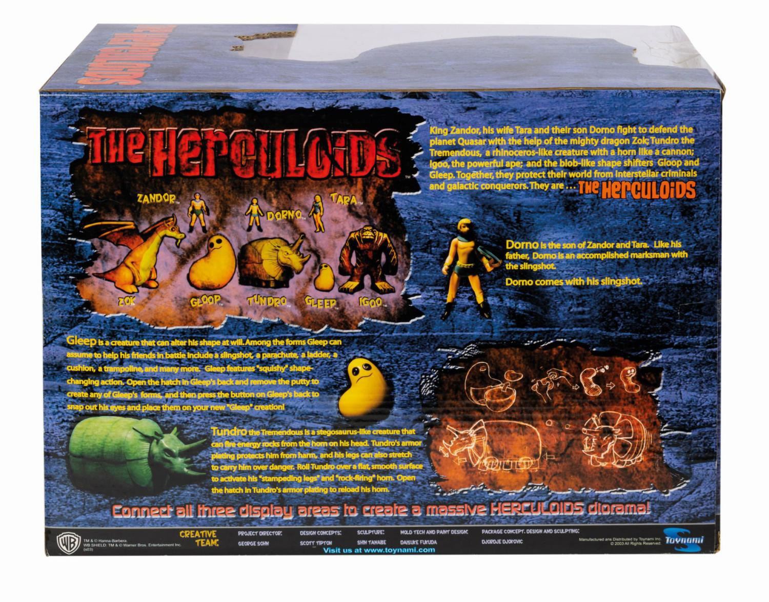 (Toynami, 2003) A The Herculoids playset manufactured by Toynami. The set includes an articulated Dorno figure with slingshot, Gleep, and a rolling Tundro figure. Never opened, all items are banded in place inside the original plastic windowed display box. Measuring 10.25"x14 and 9.5" deep, the box is in very good condition with a retail price tag taped to the upper right face, some bending to the plastic where it tucks into the left edge of the lid (also sealed with tape), and a 1.5" crack to the plastic on the right side.