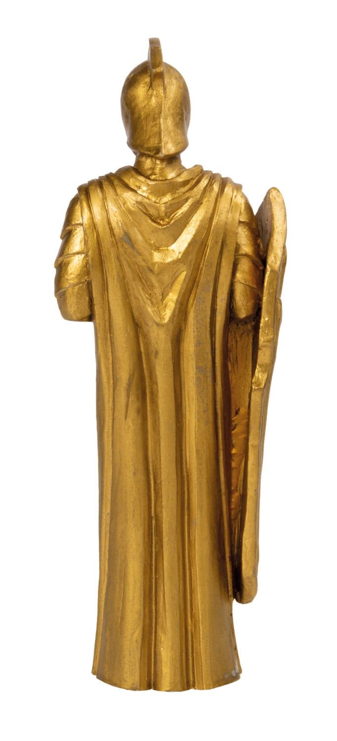 (Warner Bros., 2012) A statue of an elven warrior from the treasure hoard in The Hobbit: An Unexpected Journey. The statue is created in resin and painted gold, with details such as the helmet and armor which can be seen on the elven warriors in the Hobbit film series. Notably, the shield held by the figure does not match those used by the high elves in battle, which suggests that this may be a figure may have been created early in the film's development. Measuring 11" tall, the statue is in good condition with chipping to the paint around the base. There is some minor surface wear throughout, particularly to the cape.