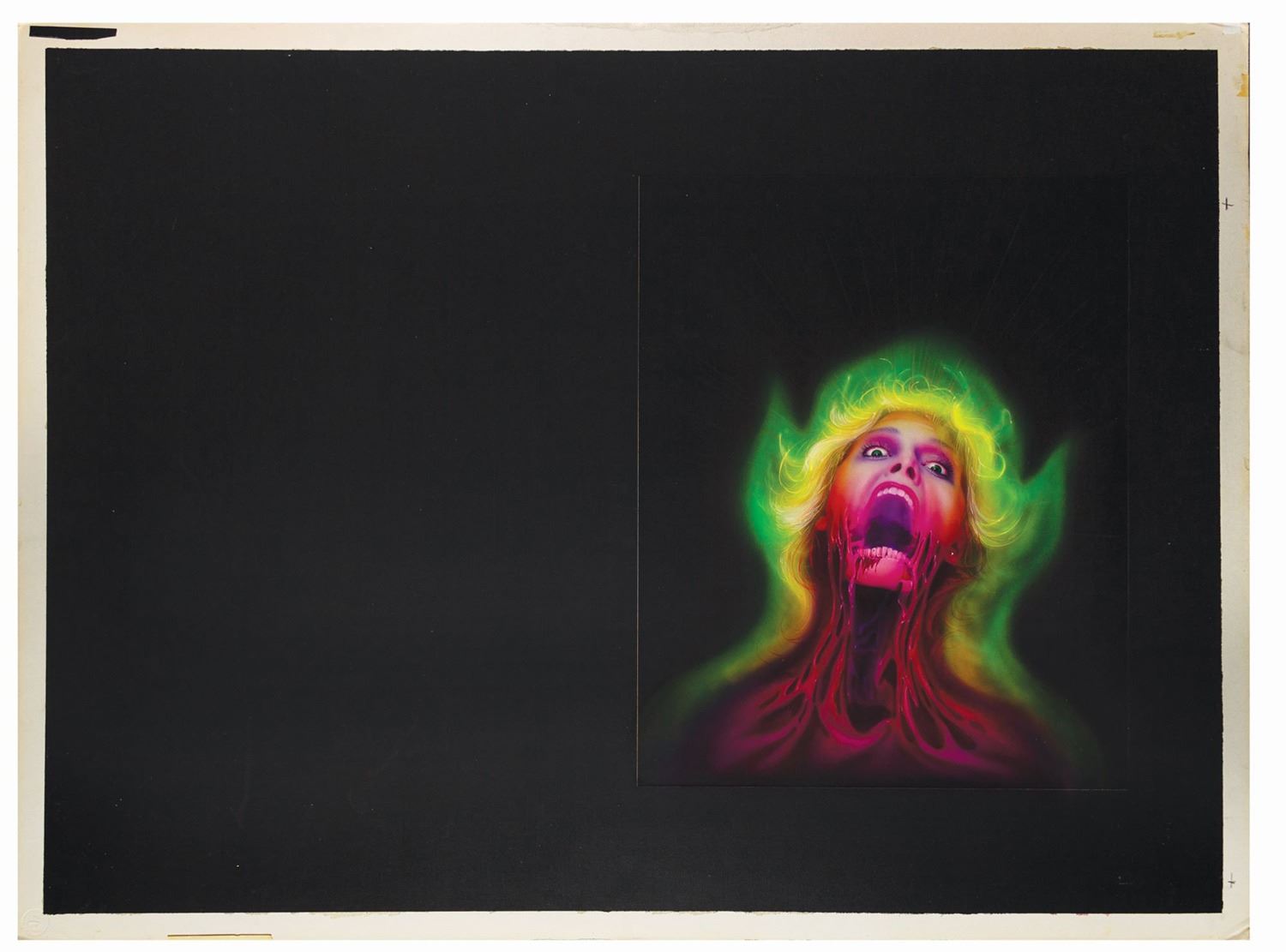 (Multicom Ent, 1982) An original painting used in the creation of posters for the theatrical release of The Incubus. The painting depicts a screaming, transforming woman, and was created by taking printed imagery of the woman's face and significantly airbrushing over it for details including the hair, green glow, black areas in the background, and details in the face and neck. As such, the wisps in the hair are unique to this painting, and can be seen in use for several foreign versions of the film's poster. The artwork is accomplished on 20"x16" paper adhered to a larger 30"x40" board. The condition is very good with some surface scuffs and wear to some of the black background area, as well as some wear to the edges and corners of the board.