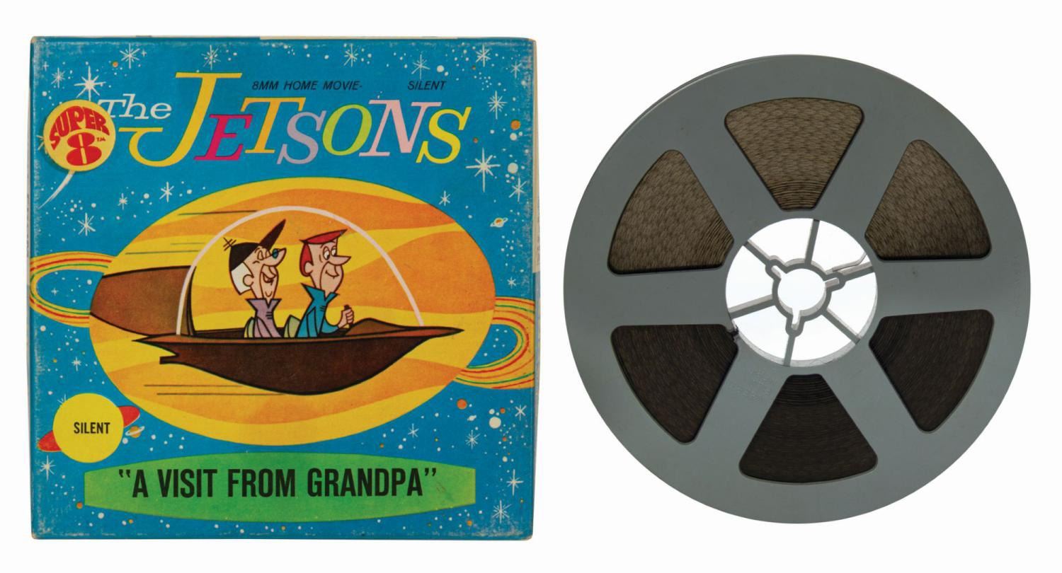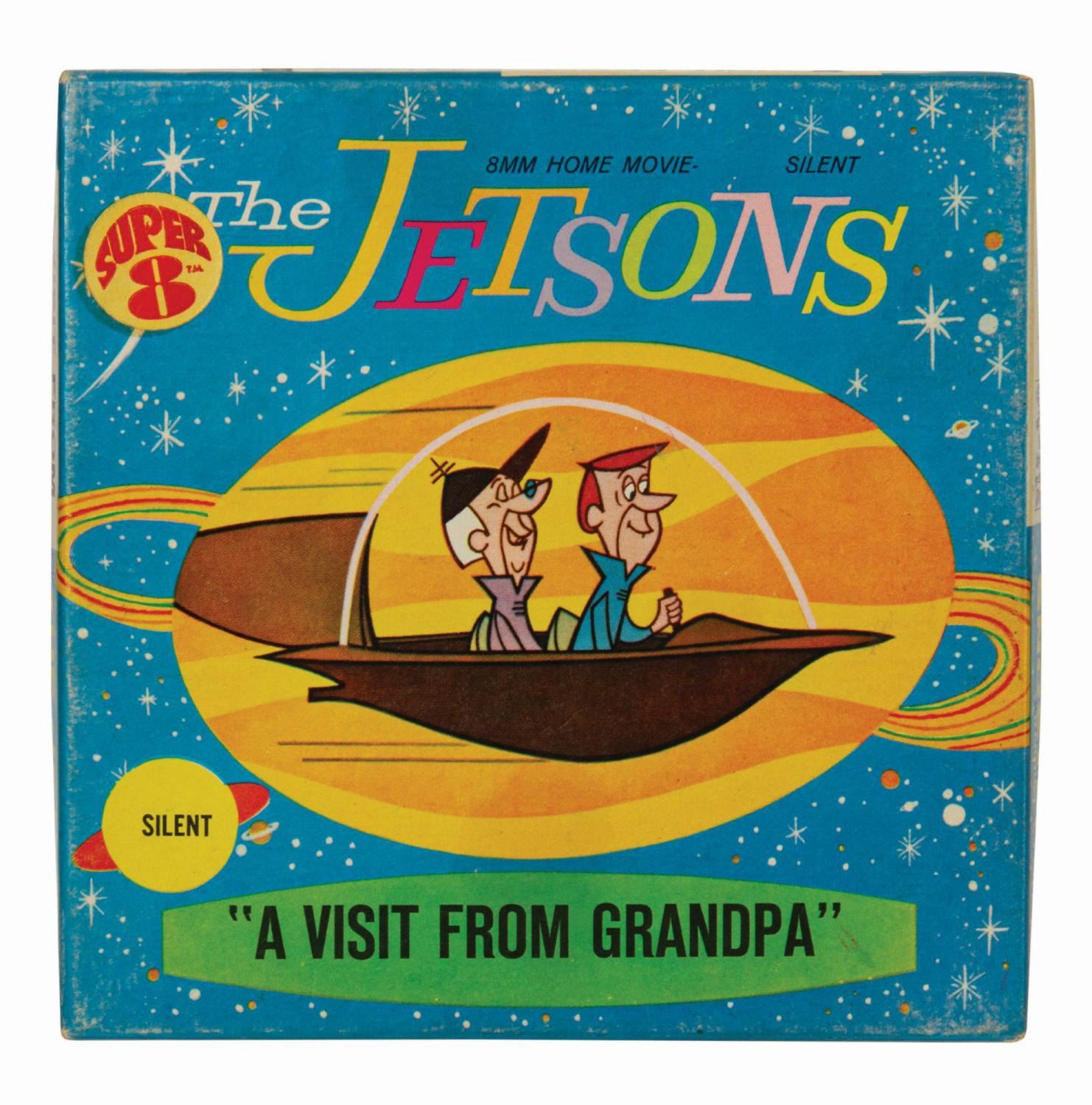 (Screen Gems, 1965) A Super 8 The Jetsons cartoon short titled "A Visit from Grandpa." The silent black and white Super 8mm film tells the story of the 11th episode of the first season of The Jetsons, in which Howard Morris guest stars as Grandpa Montague Jetson. The film comes in its original illustrated box which measures 5.25"x5.25". The condition is very good.