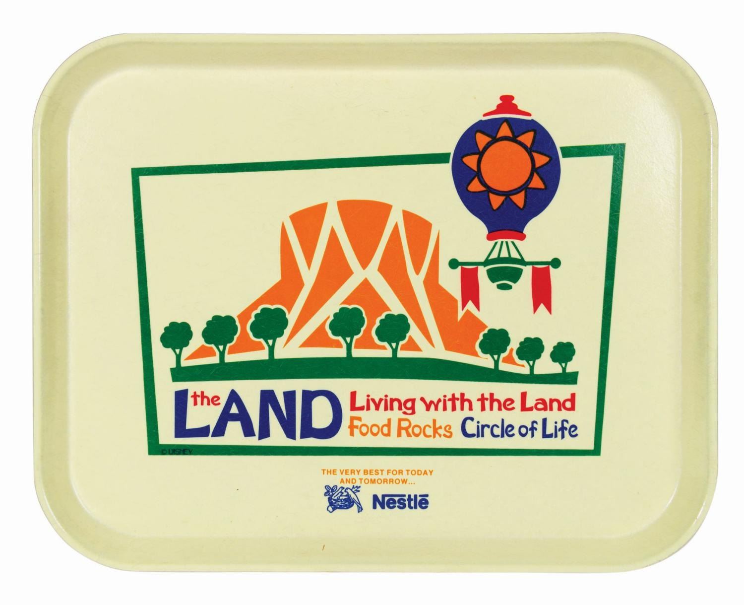 (Epcot, c.1993) A large fiberglass food service dining tray from The Land Pavilion at Epcot. The tray features the pavilion's graphic logo with list of attractions and the insignia of sponsor Nestle. Measuring 14"x18", the tray is in very good condition with only minor surface wear to the top and scratching and scuffs to the bottom from park use.