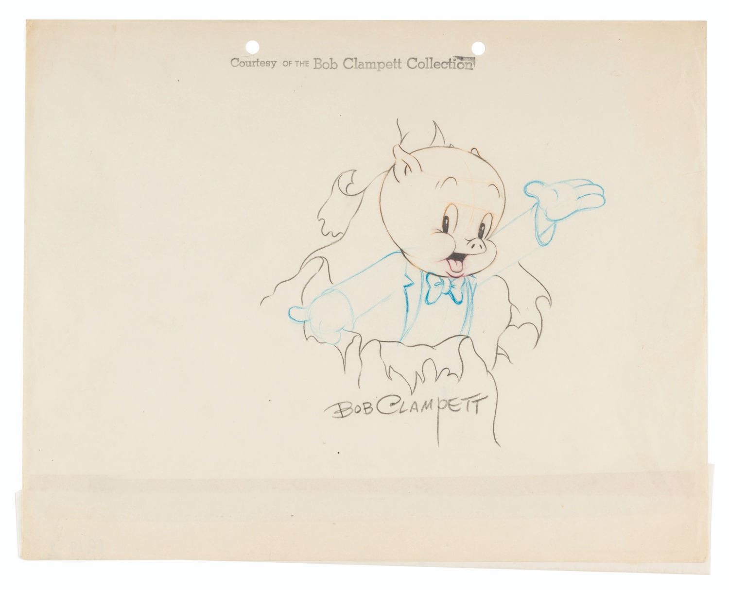 (Schlesinger, 1941) A Bob Clampett-signed layout drawing for the revised Looney Tunes title card of Porky Pig bursting through a drum. As Porky's design evolved, Clampett created this drawing as an update to the previous title card. This new version was used at the beginning of the nine Looney Tunes shorts from “Porky’s Snooze Reel” through “The Henpecked Duck.” With an image size of 5” x 6” on 9.5” x 12” animation paper, the graphite and colored pencil drawing displays in good condition with light edge wear and creasing, light discoloration from age, and a 3” x 12” strip of pegbar paper taped to the bottom and folded back. This piece is stamped “Courtesy of the Bob Clampett Collection.”