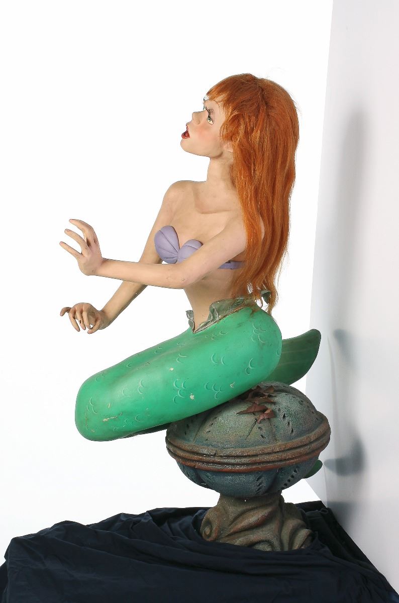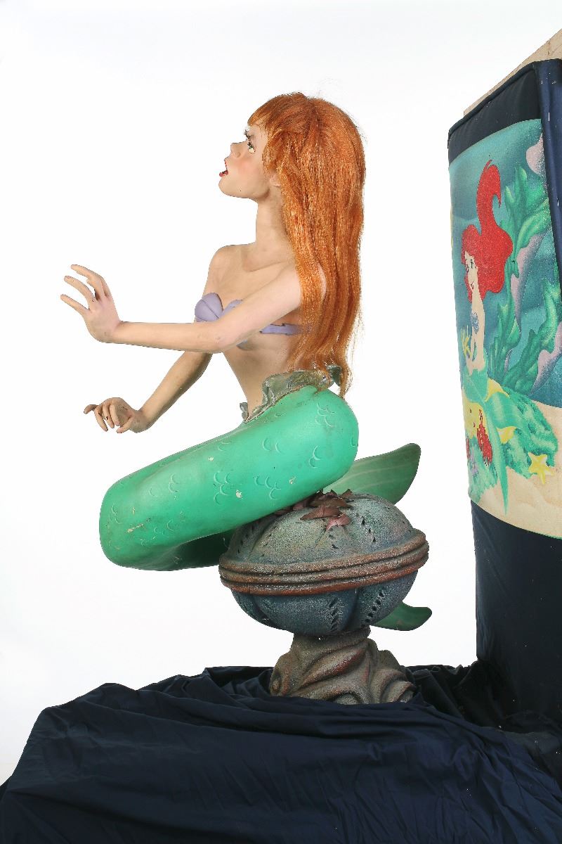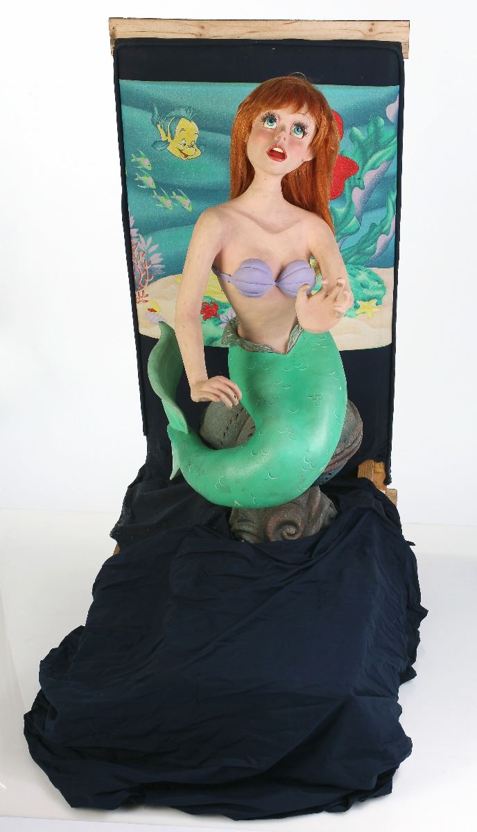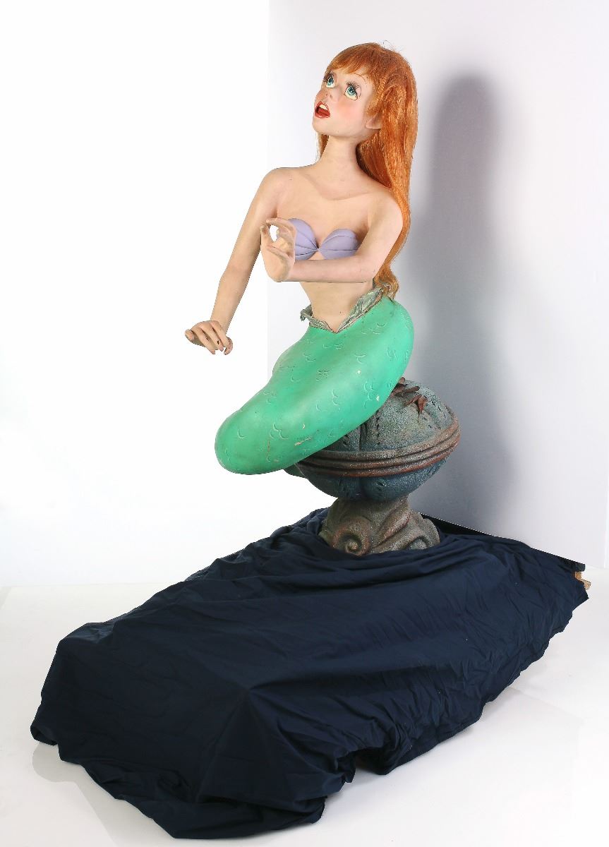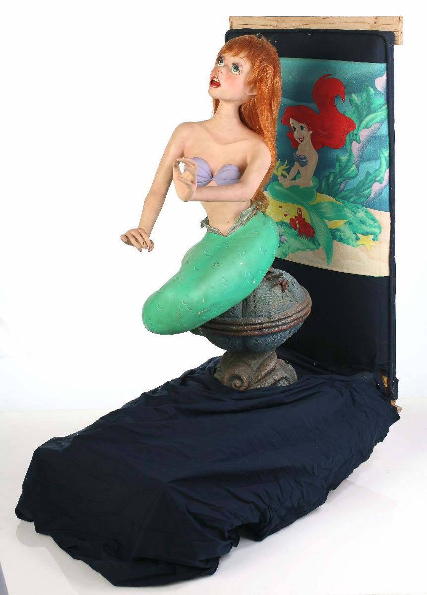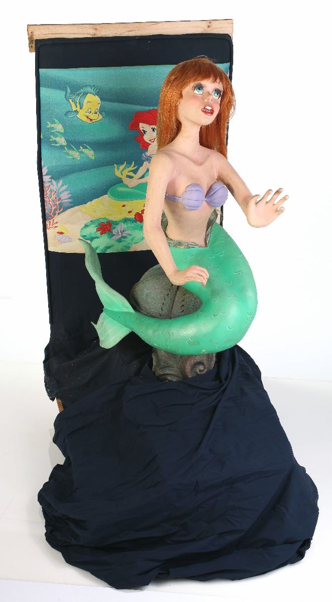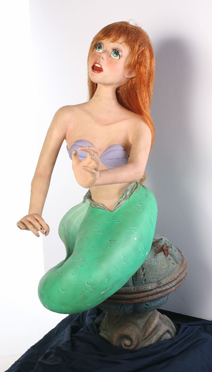 (Disneyland, 1989) For each animated film release, artisans at the studio would create special displays for the Main Street Emporium windows. These displays were often animated and recreated key movie moments to the delight of park guests. This large figure of Ariel was created for a scene from Walt Disney's 1989 animated feature film, "The Little Mermaid". Ariel sits poised to sign Ursula's contract, just before Ursula steals her voice. This one-of-a-kind figure measures approximately 36"x30" and 48" tall. It is in good condition and is still wired for movement, but currently not functioning. Comes with a Certificate of Authenticity from Disney Auctions.
