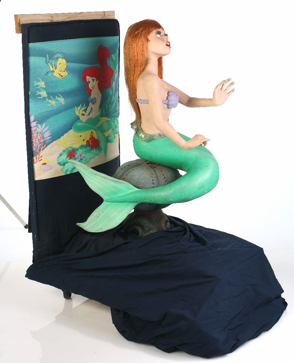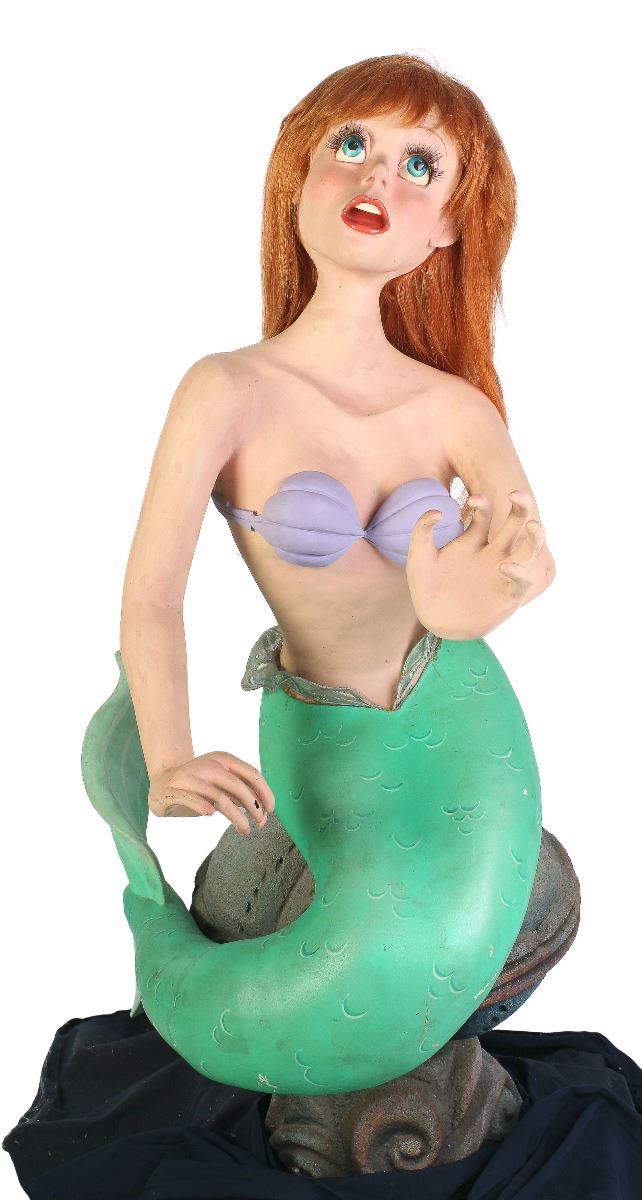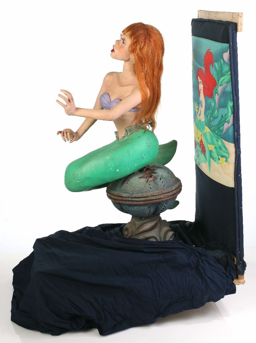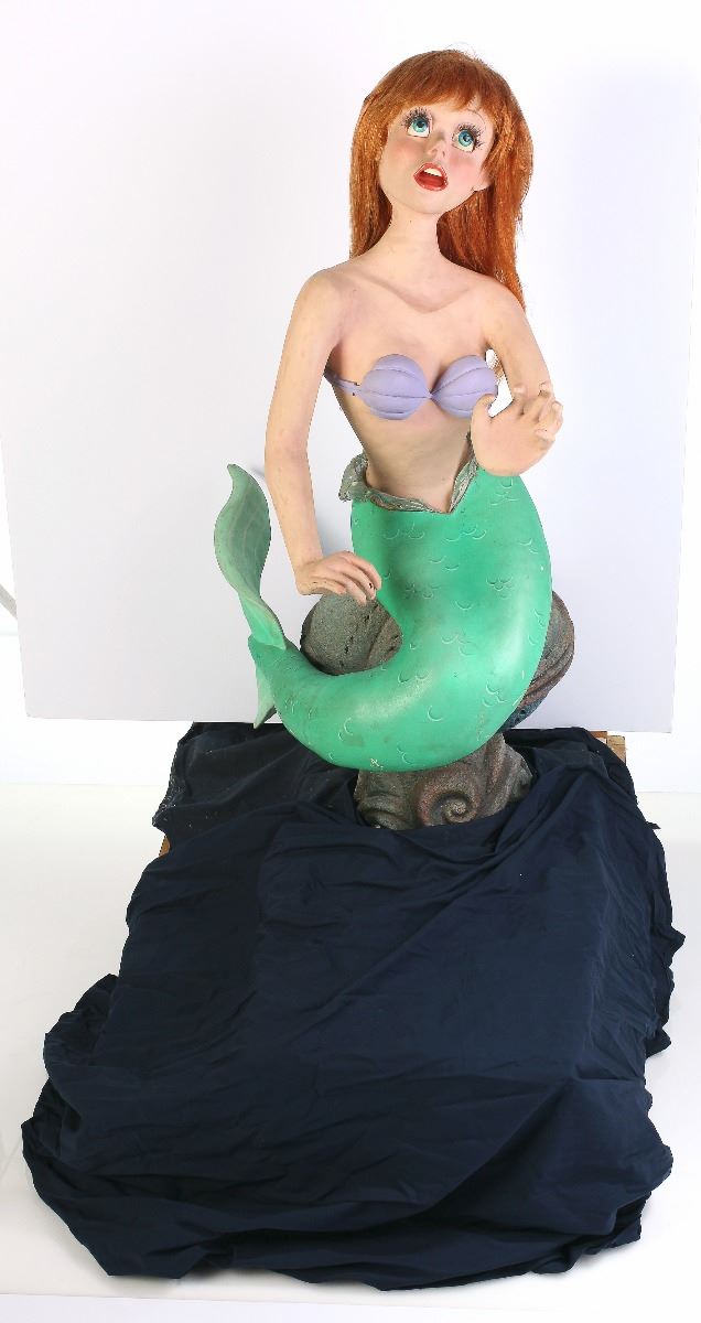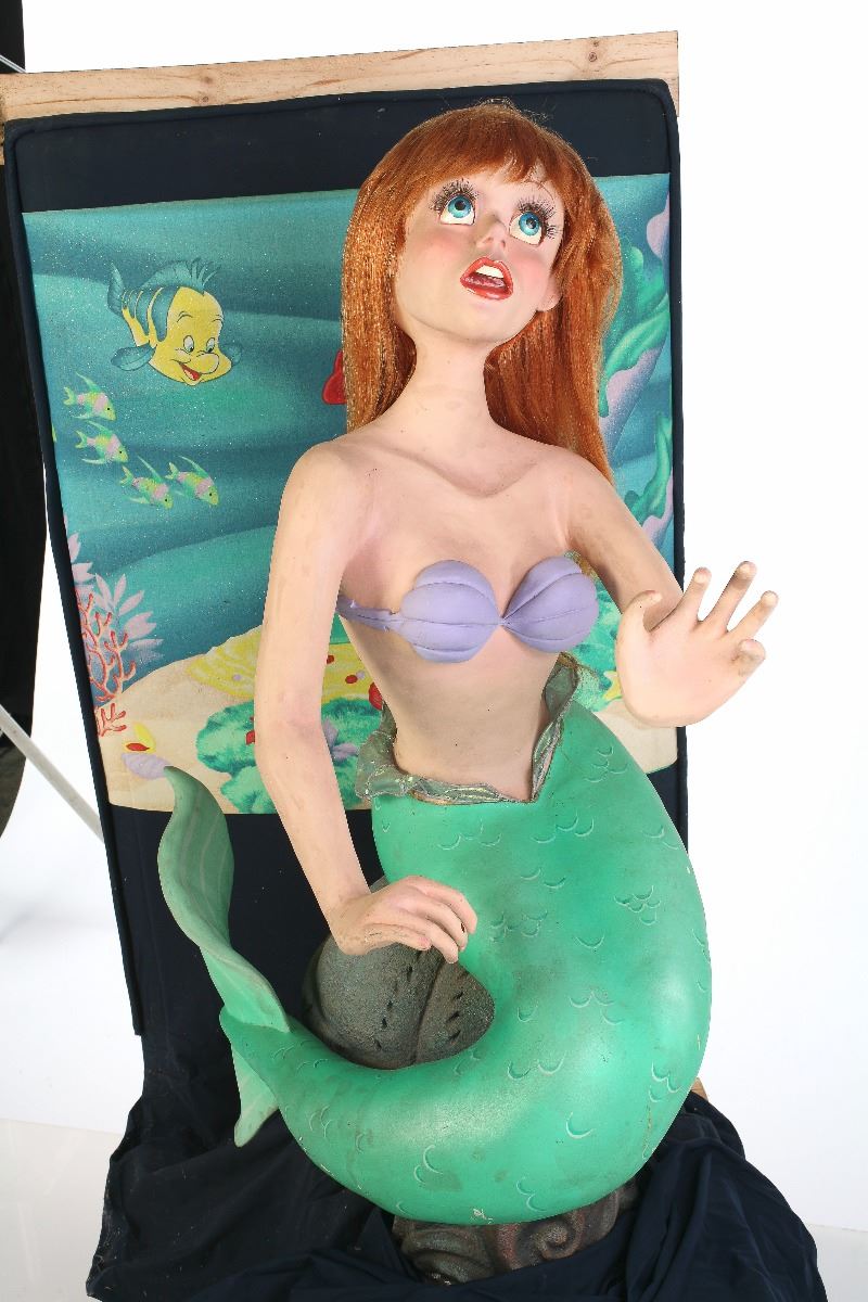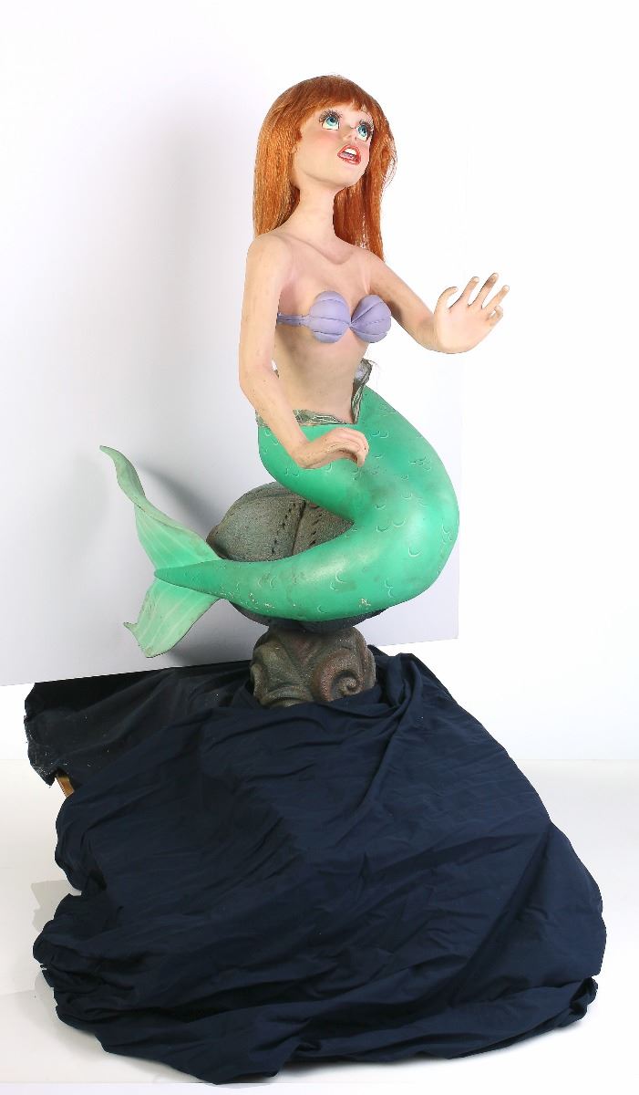 (Disneyland, 1989) For each animated film release, artisans at the studio would create special displays for the Main Street Emporium windows. These displays were often animated and recreated key movie moments to the delight of park guests. This large figure of Ariel was created for a scene from Walt Disney's 1989 animated feature film, "The Little Mermaid". Ariel sits poised to sign Ursula's contract, just before Ursula steals her voice. This one-of-a-kind figure measures approximately 36"x30" and 48" tall. It is in good condition and is still wired for movement, but currently not functioning. Comes with a Certificate of Authenticity from Disney Auctions.