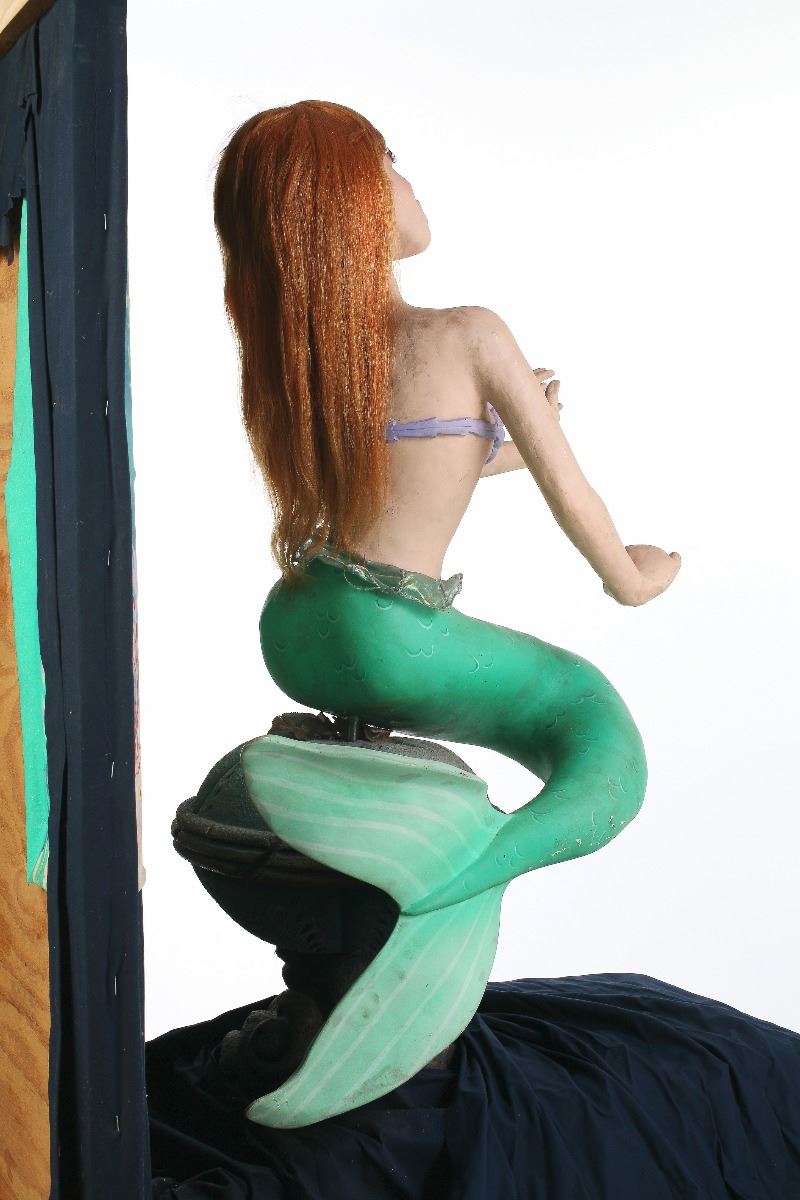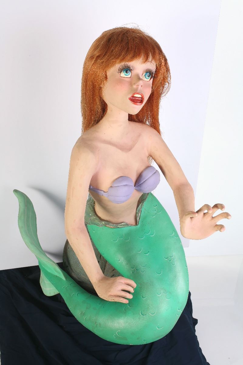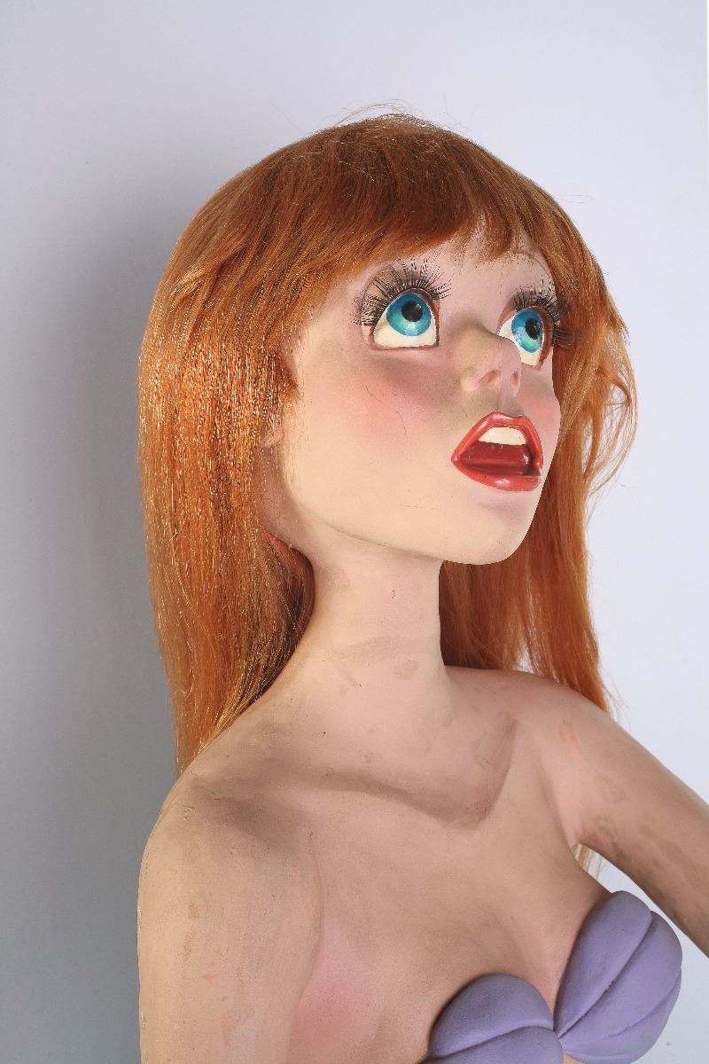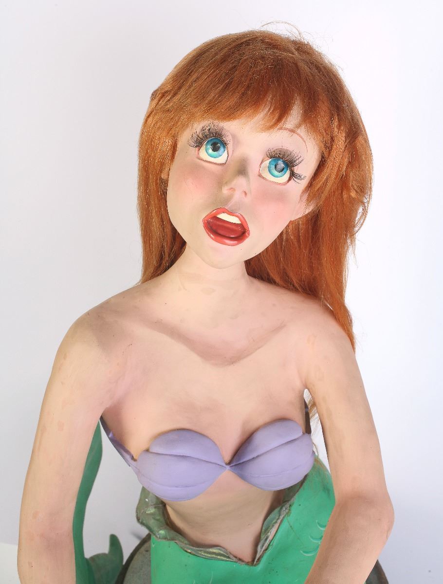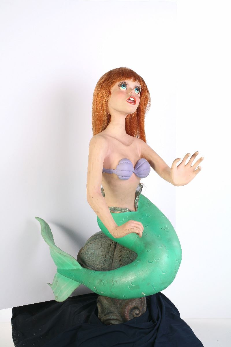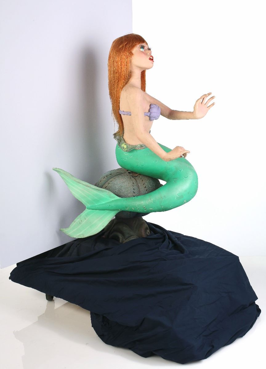 (Disneyland, 1989) For each animated film release, artisans at the studio would create special displays for the Main Street Emporium windows. These displays were often animated and recreated key movie moments to the delight of park guests. This large figure of Ariel was created for a scene from Walt Disney's 1989 animated feature film, "The Little Mermaid". Ariel sits poised to sign Ursula's contract, just before Ursula steals her voice. This one-of-a-kind figure measures approximately 36"x30" and 48" tall. It is in good condition and is still wired for movement, but currently not functioning. Comes with a Certificate of Authenticity from Disney Auctions.