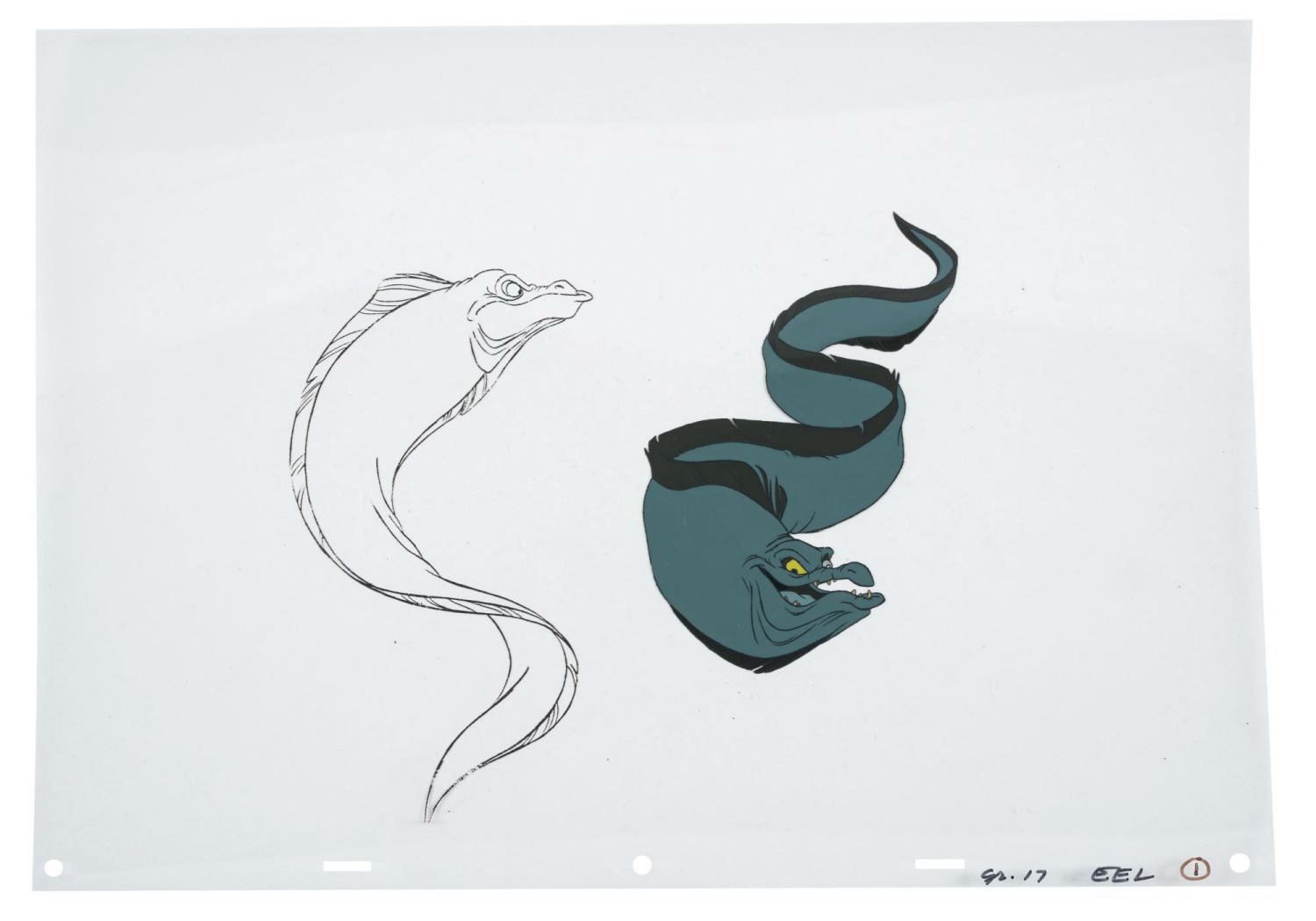 (Disney, 1989) A Studio model cel featuring Flotsam and Jetsam from The Little Mermaid. The cel features xerographic lines of both Ursula's little babies, with Jetsam being hand-painted. It would have been used to test colors against backgrounds as well as a guide for the ink and paint department. The piece has image sizes of 8"x4.25" and 7"x4.25" on the 12.5"x17" cel sheet. The item displays in fine condition.