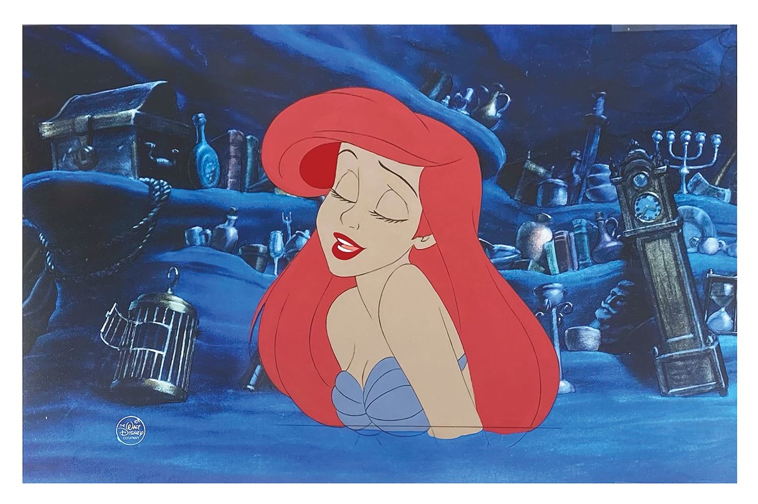 (Disney, 1989) An original hand-painted production cel of Ariel from The Little Mermaid. The slightly trimmed cel measures 11"x16.5" and has been placed over a color copy background that was prepared by the Walt Disney Studios. The cel has a Disney Studio seal in the lower left corner. Ariel's image size is 8"x7" and the cel is in very fine condition. The Little Mermaid was the last Walt Disney Animated Feature Film to use hand-painted animation cels, making this a true artifact of animation history.