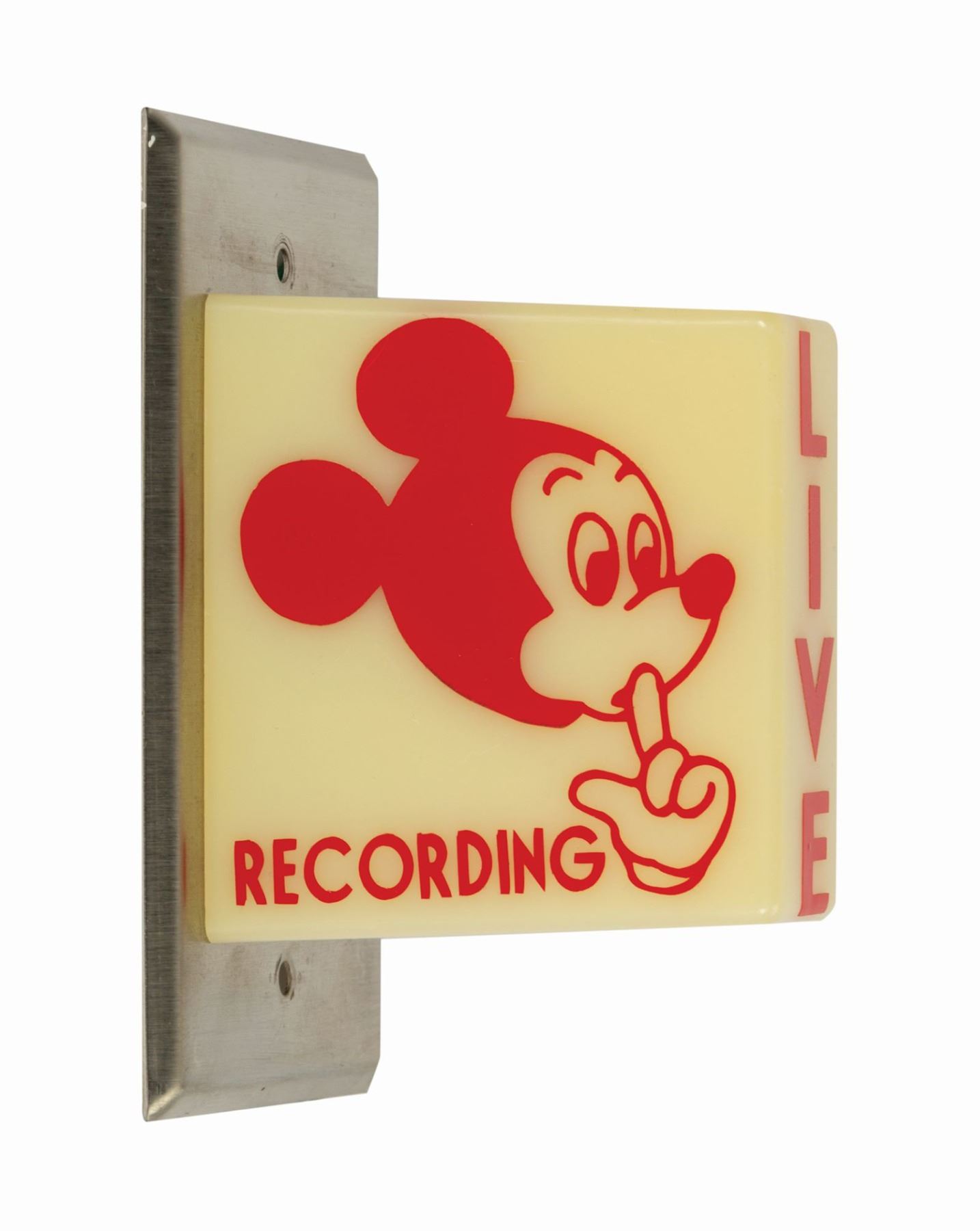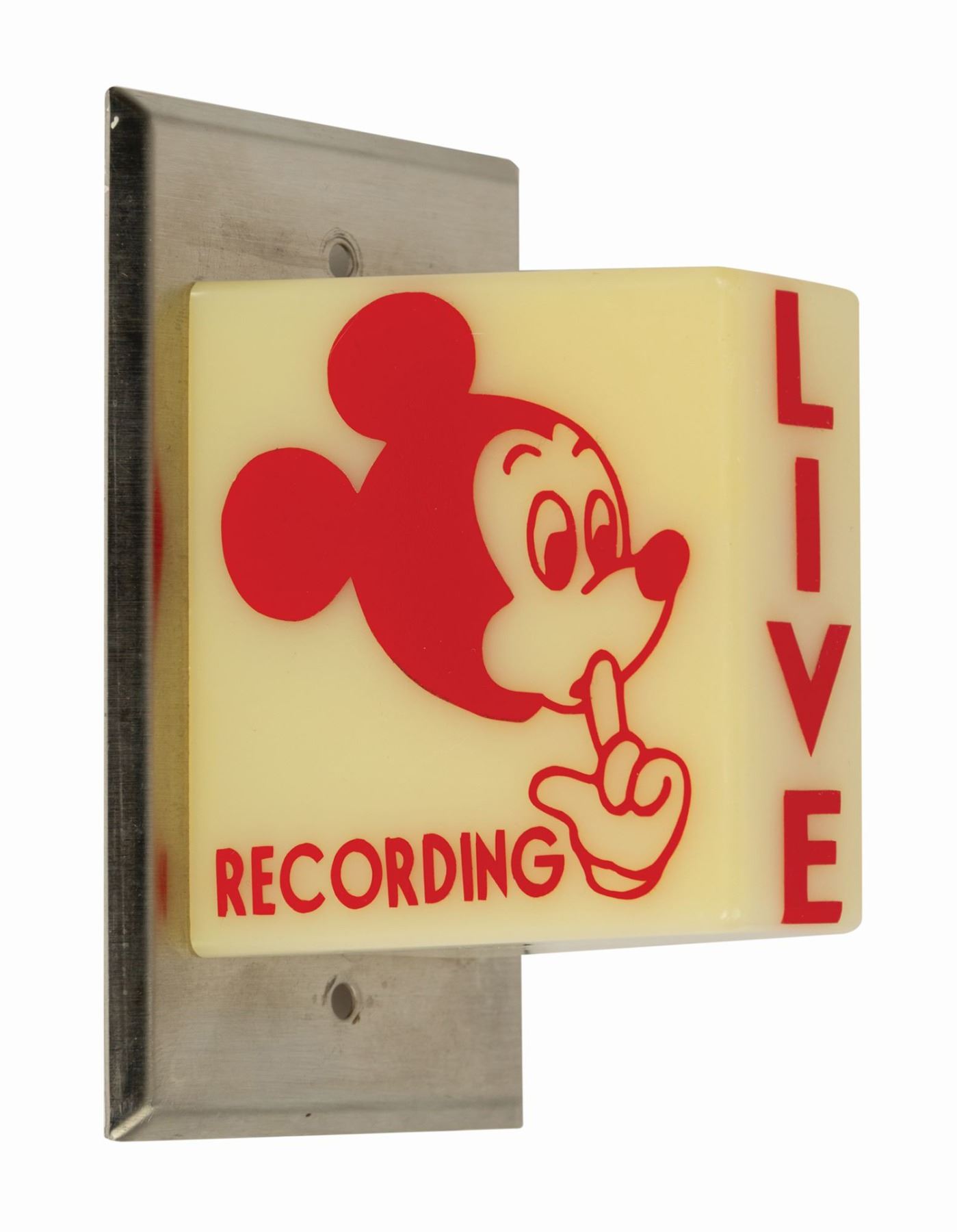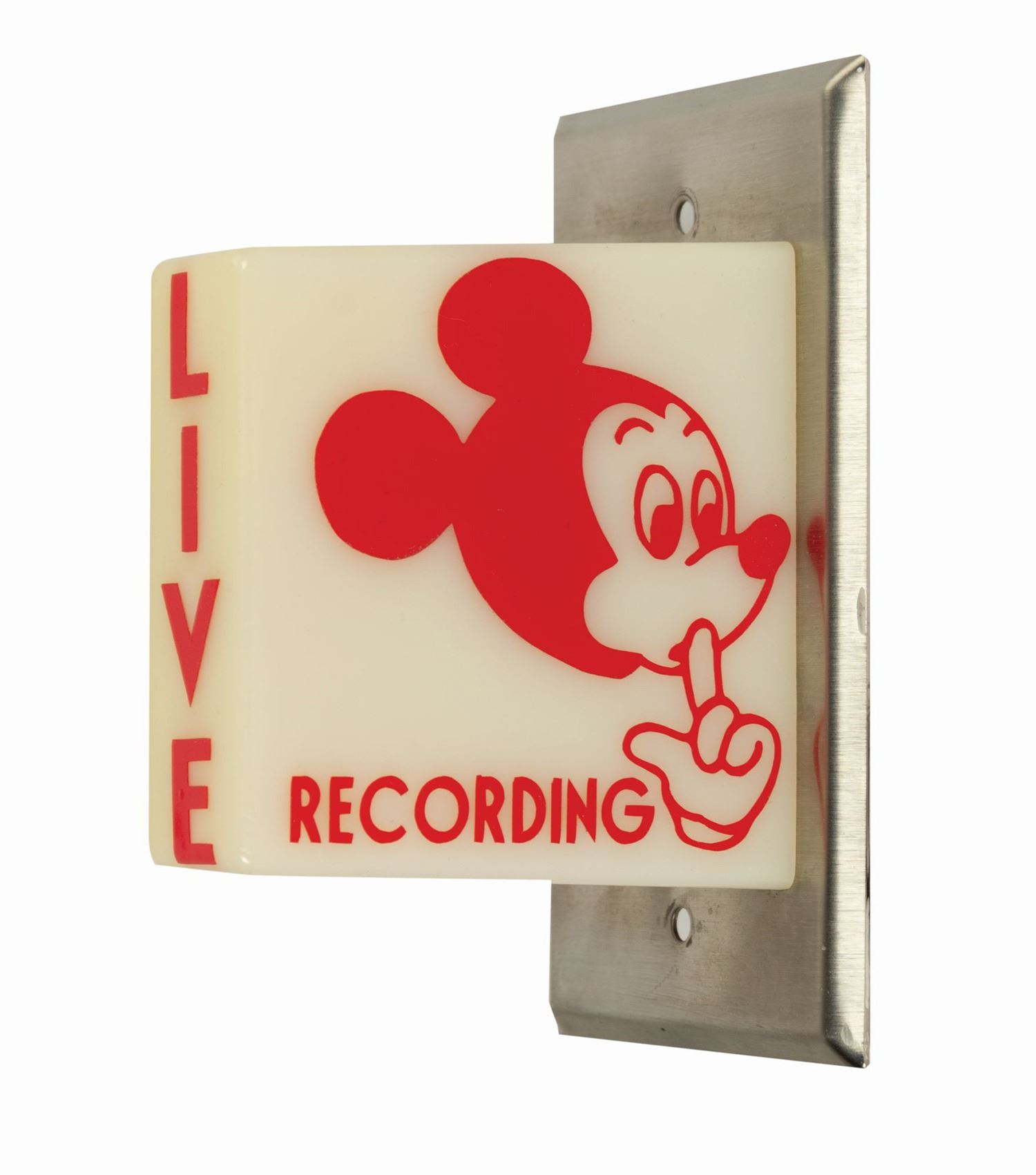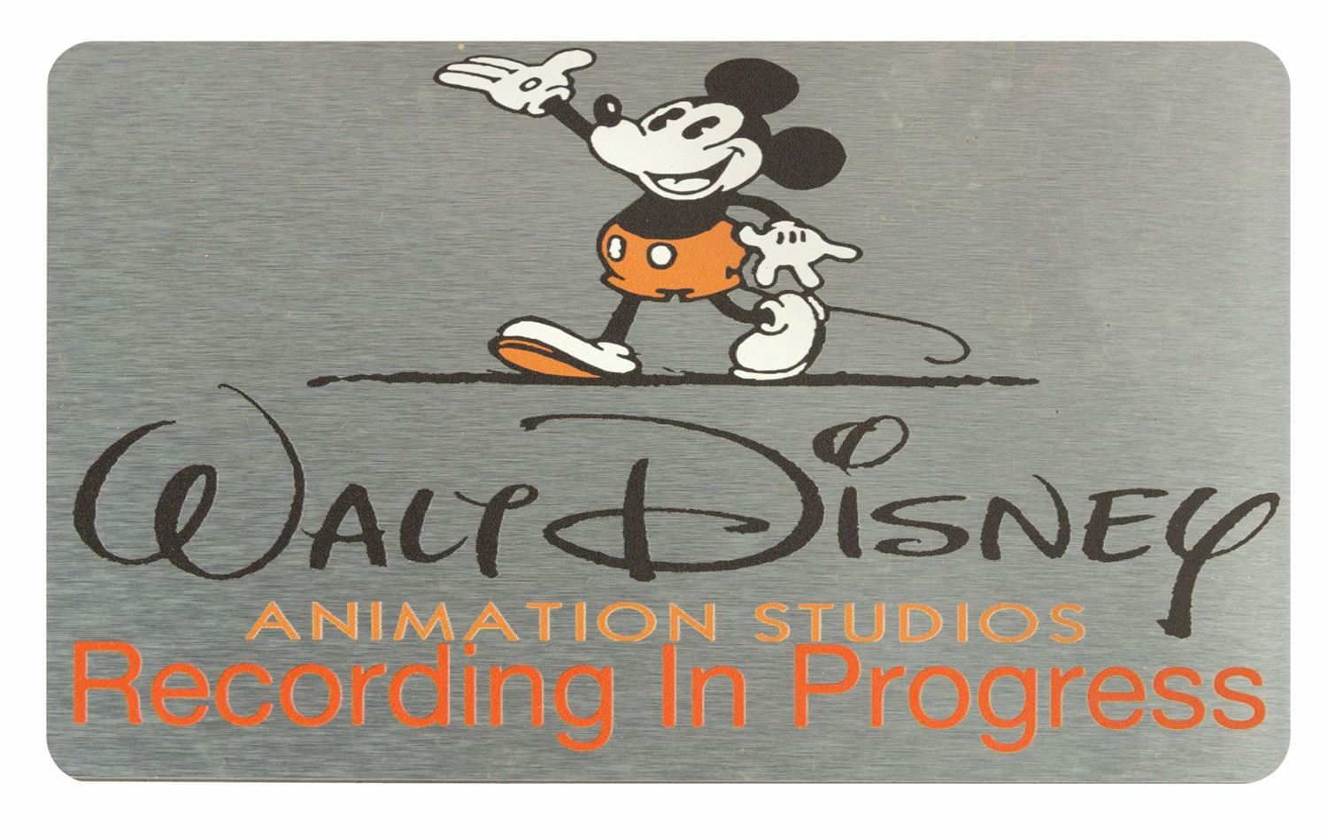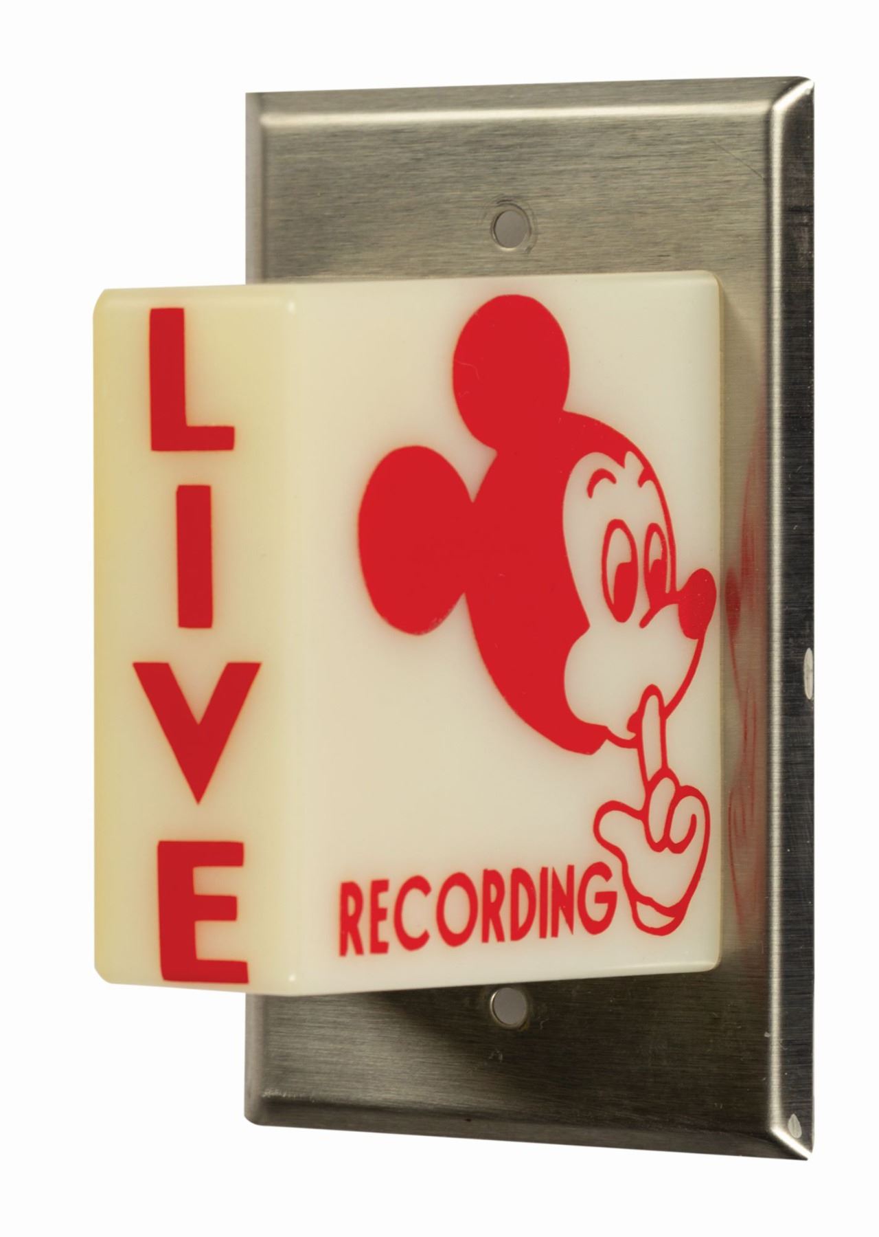 (Disney-MGM, c.1990s) An original plaque and light fixture used within The Magic of Animation attraction at Disney-MGM Studios. The attraction contained a functioning animation studio which allowed guests to watch animators at work. The plaque and light fixture come from the recording area of the studio and designated when recording was in progress. The plaque is printed on thin metal with a dense foam center, and measures 6"x10". The light fixture measures 4.5"x2.75 on the cover and 2.75" deep. Both are in good condition, with the plaque showing some surface and edge-wear.
