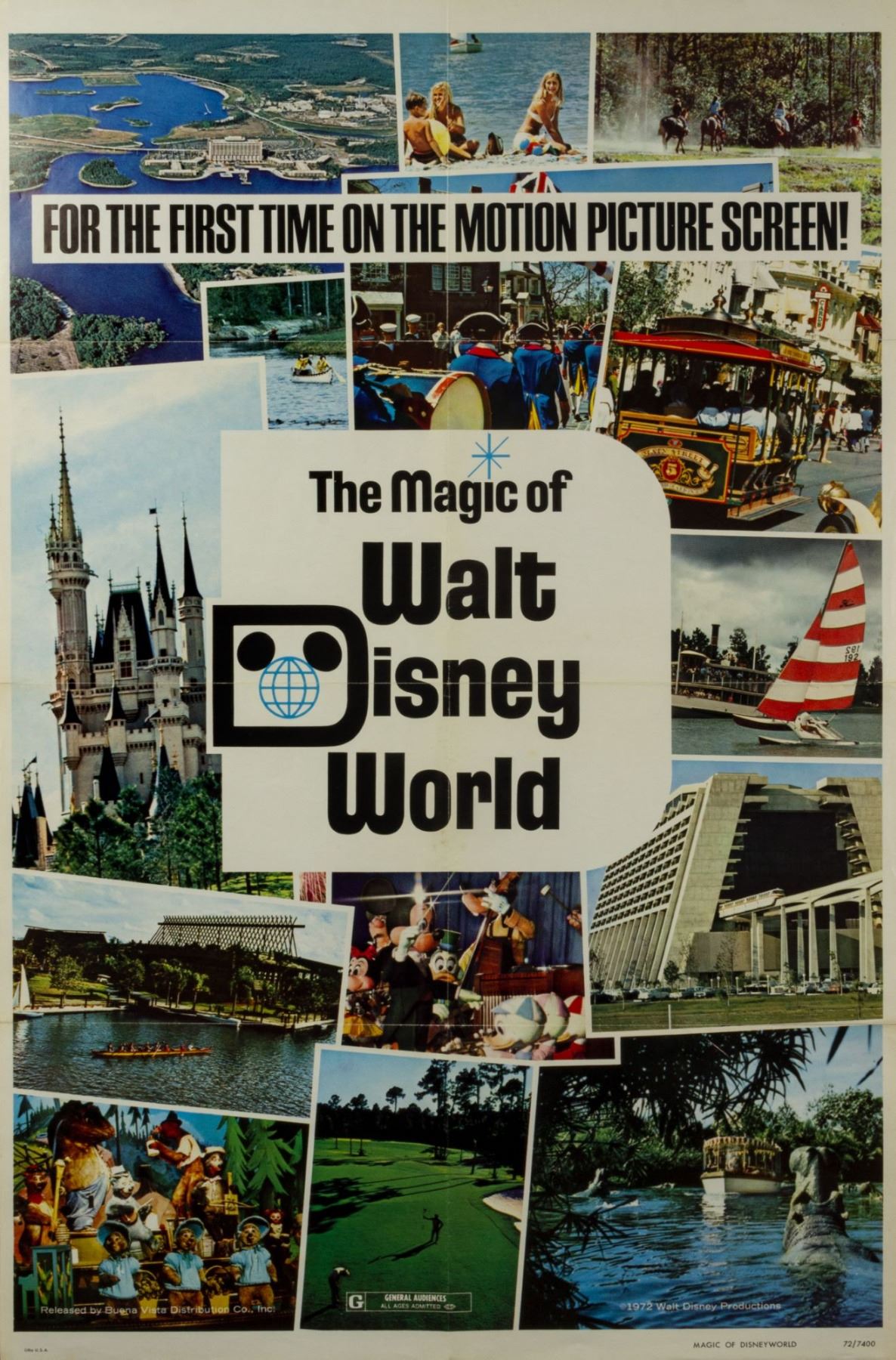 (Walt Disney World, 1972) A one sheet poster promoting the theatrical release of the short film The Magic of Walt Disney World. Created within a year of the park's opening, this short was released to theaters alongside Saludos Amigos and Snowball Express in order to promote Walt Disney World. Measuring 41"x27", the poster is in very good condition with minor wear to the original fold-lines and a few small spots of discoloration from age.