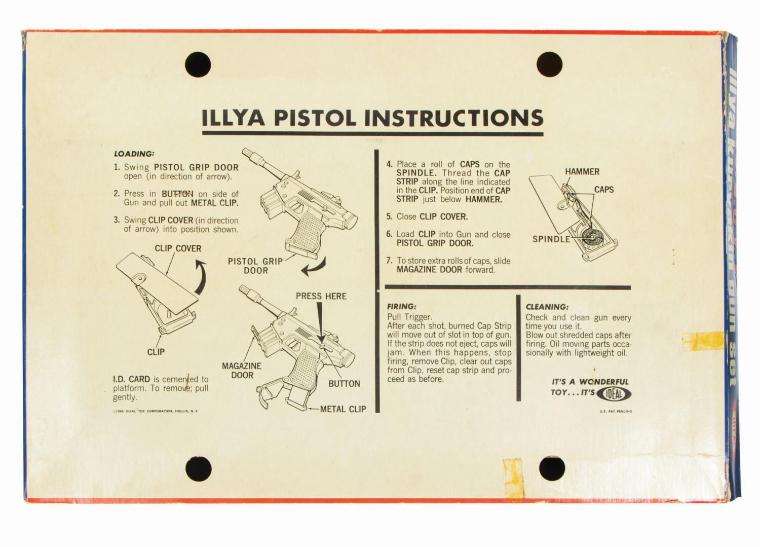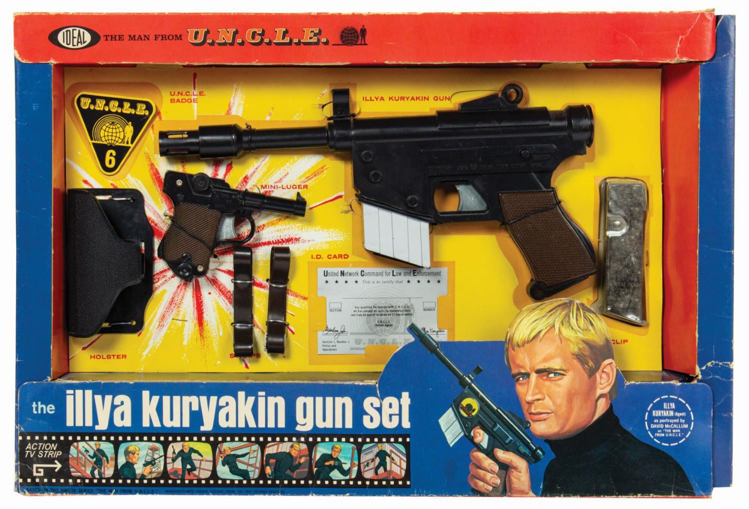 (Ideal, 1966) A vintage The Man From U.N.C.L.E. Illya Kuryakin Gun Set manufactured by Ideal. Constructed of plastic and metal, the set includes a .223 clipfire cap pistol, a clip, a mini Luger cap pistol, a holster, two straps for the holster, an U.N.C.L.E. badge, and an U.N.C.L.E. identification card. Never opened, all items are assembled in their original cardboard packaging. Measuring 13.75"x20" and 2" deep, the packaging is in good condition, with some edge wear, creasing, and tape staining to the reverse. The weapons and accessories are as-new.