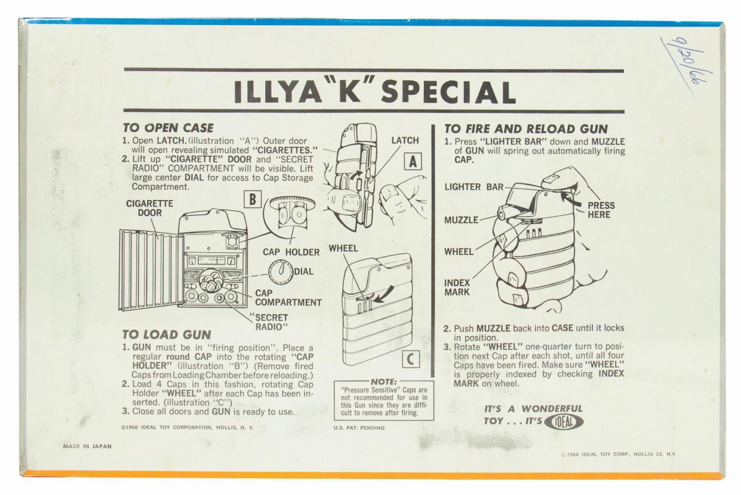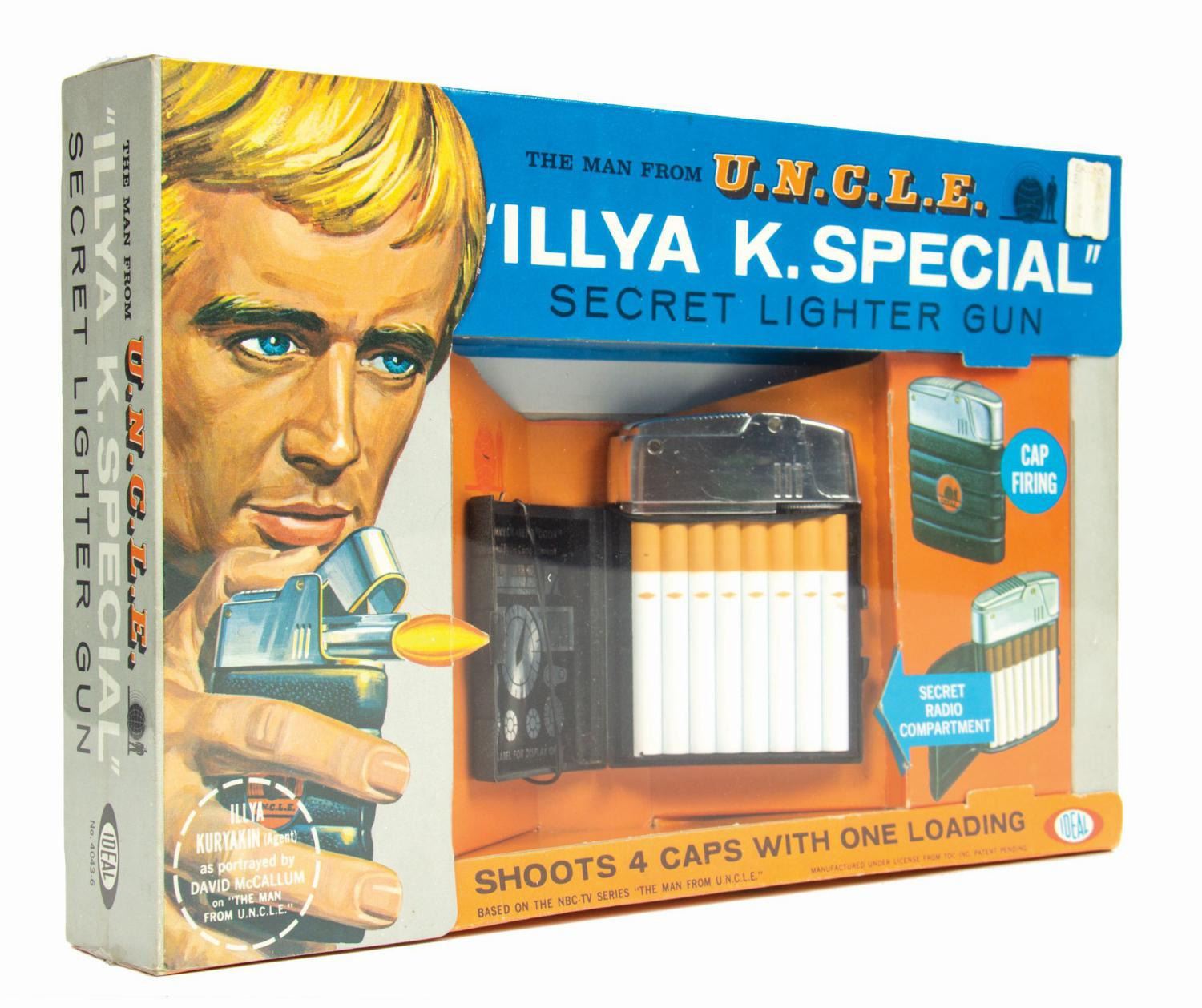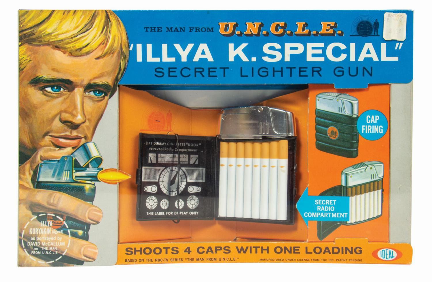 (Ideal, 1966) A vintage The Man from U.N.C.L.E. Illya K. Special Secret Lighter Gun manufactured by Ideal. Constructed of plastic and metal, the combination cigarette holder/lighter conceals a secret faux radio and a functioning cap gun. The Secret Lighter Gun remains factory sealed in plastic wrap inside the original cardboard box packaging. Measuring 8.5"x13" and 2" deep, the piece is in fine condition with minor wear to the packaging.