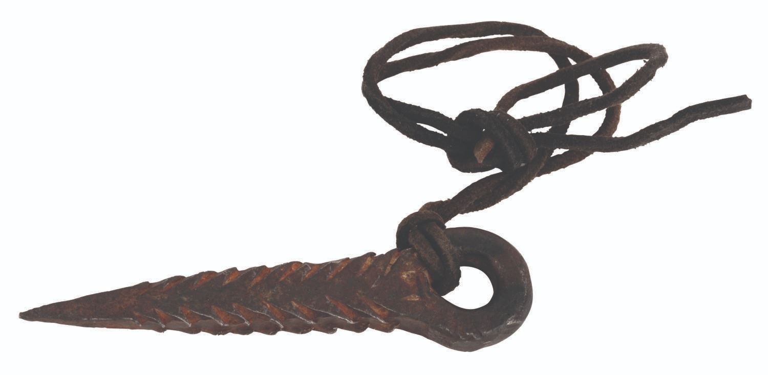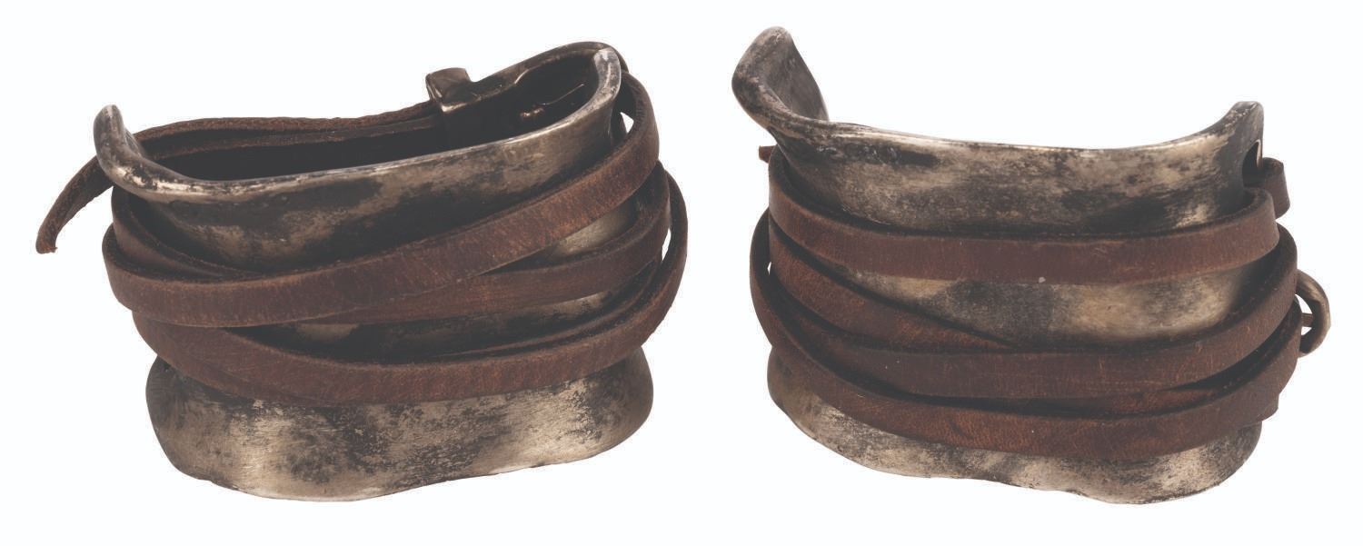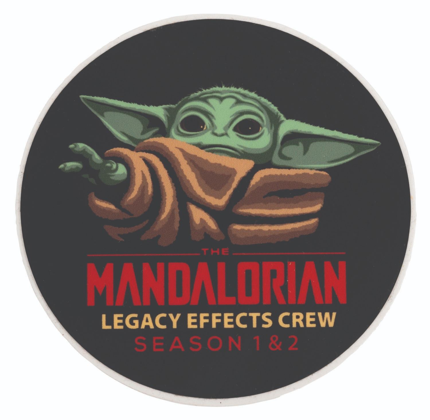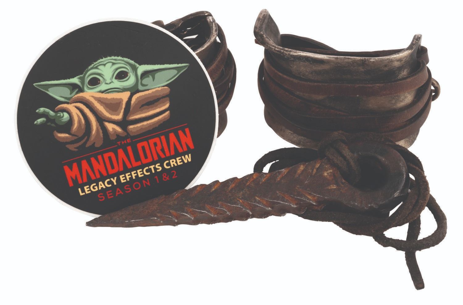 (Disney, 2020s) Three costume pieces and a crew sticker from production of "The Mandalorian.” Two of the metal and leather pieces are wrist guards, and the third is a jagged necklace. The decal is for the Legacy Effects Crew from Season 1 & 2 and features Grogu. Ranging in size from the 3” in diameter sticker to the 13” long necklace, the items are in good to very good condition with scratches on the decal and typical wear from production use.