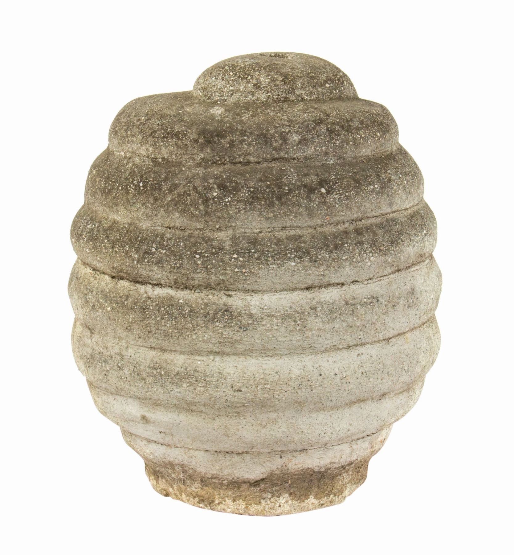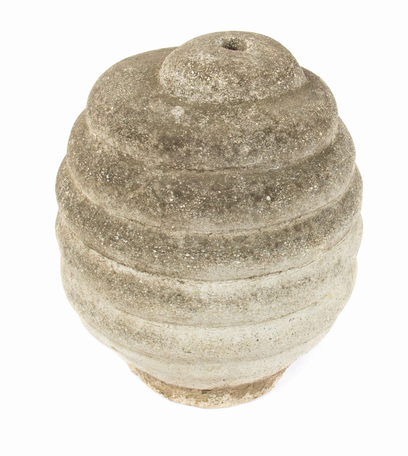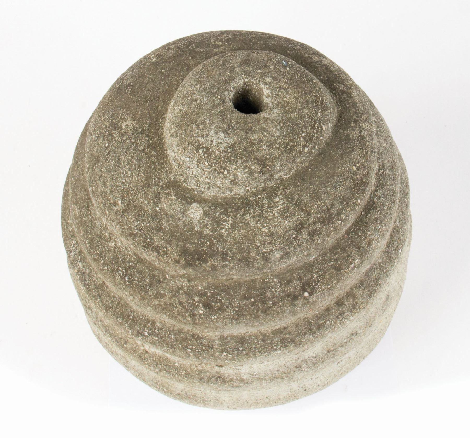 (Disneyland, c.2000s) A stylized beehive created in cement packed with foam that is believed to have been used in designing the line queue for Disneyland's "The Many Adventures of Winnie the Pooh". This beehive is similar in shape, size, and style to the colorful beehives seen within the line queue of the popular Disneyland attraction. This prop measures approximately 14" tall and is in good condition with some wear from use.