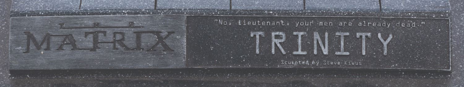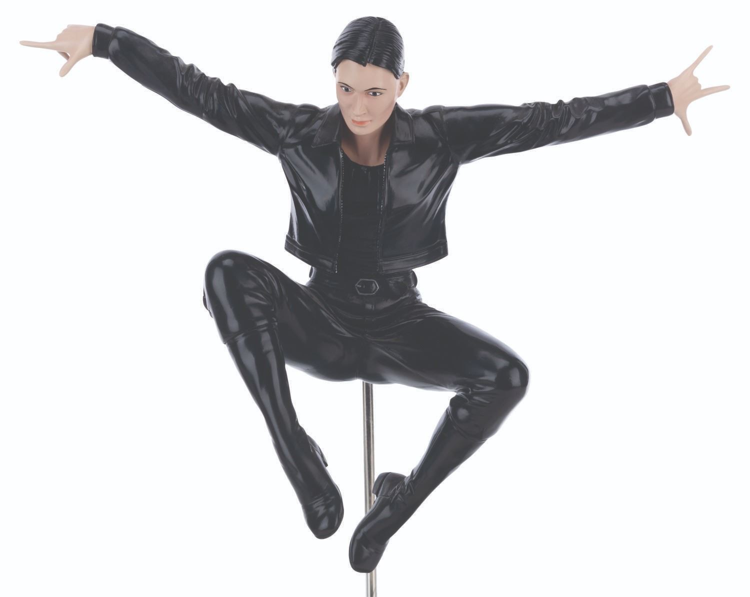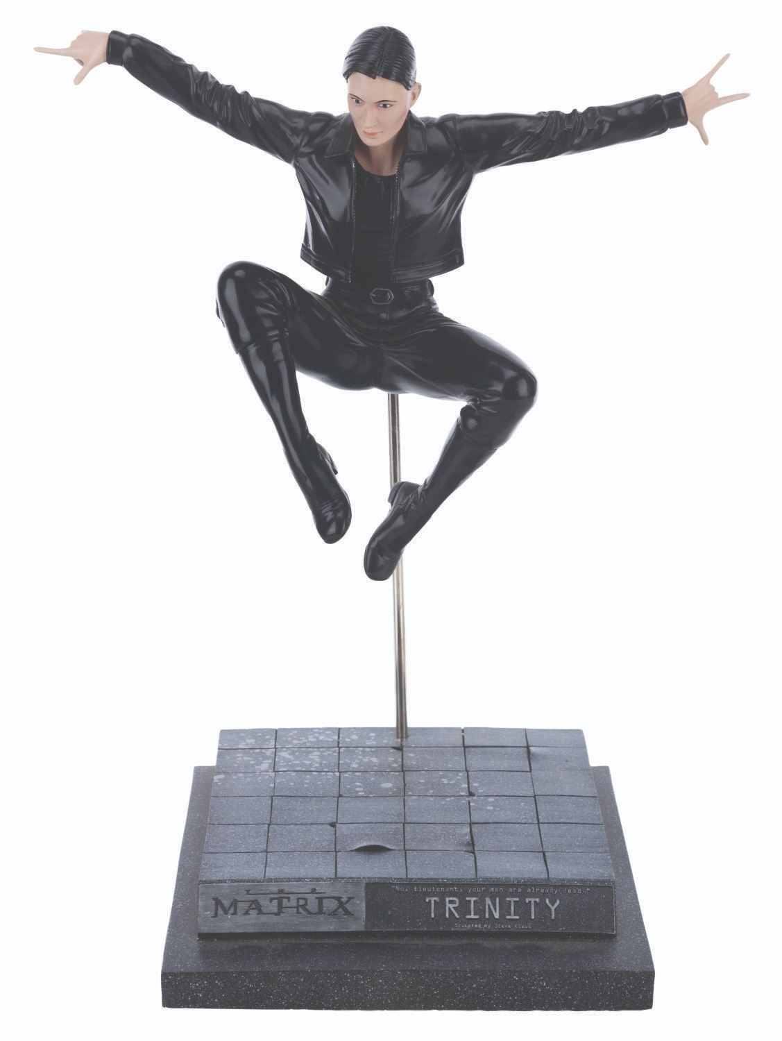 (N2 Toys, 2000) A cold-cast figure of Trinity’s iconic flying kick from “The Matrix.” Sculpted by Steve Kiwus, the figure is displayed with a detachable pole and resin base featuring the quote “No, lieutenant, your men are already dead.” Measuring 6.75” x 7.25” x 12.75” tall, the piece is in very good condition with light wear, visible repair on the right middle finger, and a missing right pinky.