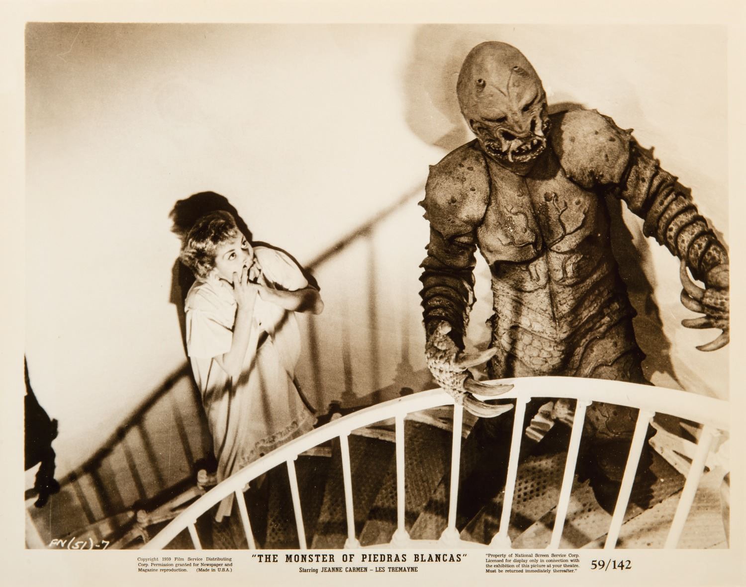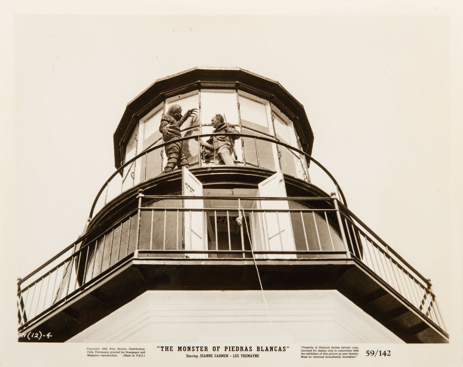 (Vanwick, 1959) A collection of (3) promotional publicity photos advertising "The Monster of Piedras Blancas." Among the photos are images of the monster, which was manufactured by some of the creative artists that brought Universal's Creature from the Black Lagoon to life four years prior. Measuring approximately 8"x10" the photos are in fine condition, exhibiting little wear to edges and corners.