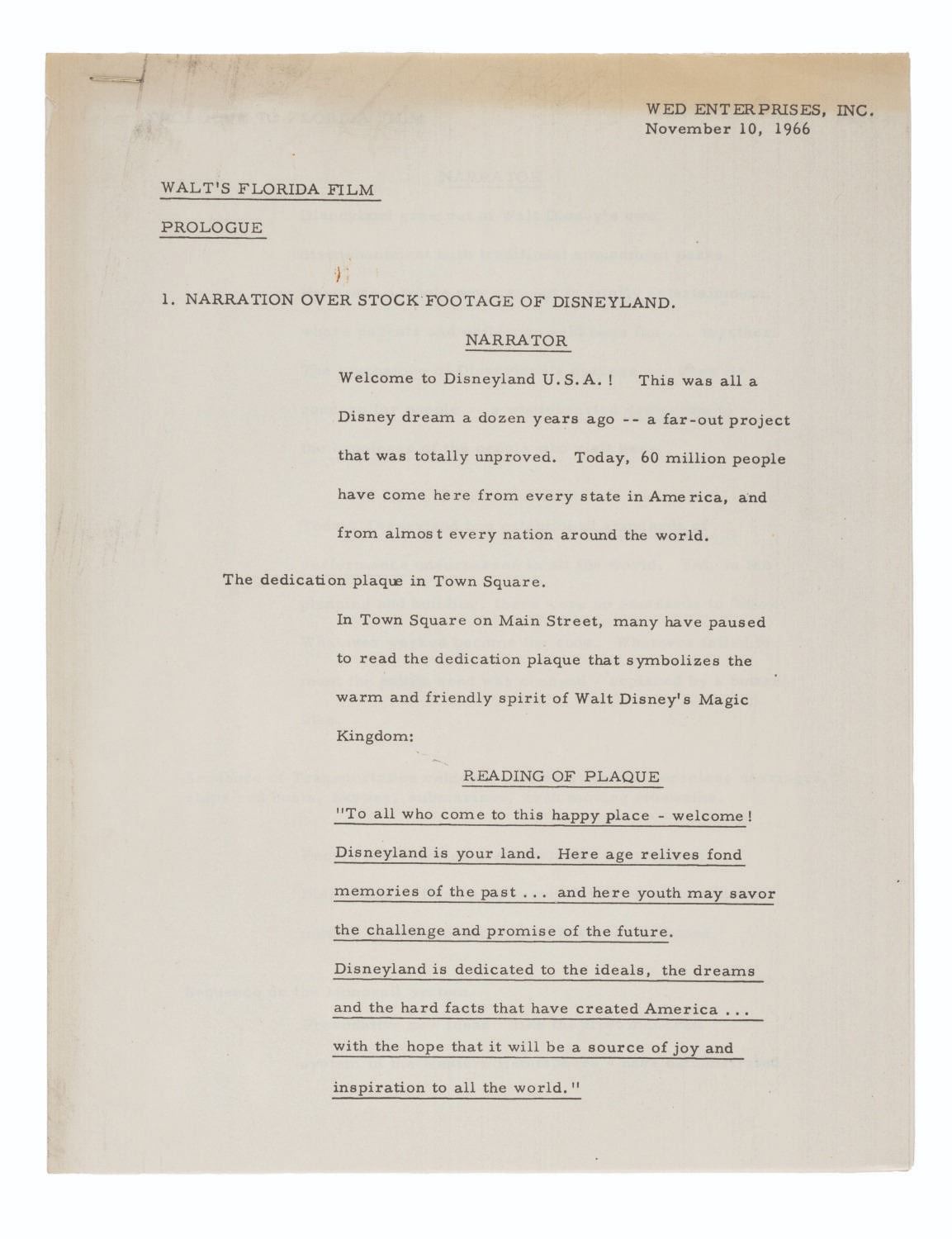 (Disney, 1966) The script for the narrator in "The E.P.C.O.T. Film." Famously, Walt Disney’s last filmed segment was shot at the Disney Studio on October 27, 1966. The E.P.C.O.T. Film, or "Walt’s Florida Film" as it is titled here, outlines Walt’s full plans for Walt Disney World and EPCOT as a true Experimental Prototype City of Tomorrow. This narrator’s script includes all the dialogue voiced by Dick Wesson as he opens the film with a history of the Disney Company and specifically Disneyland before introducing Walt Disney, who carries the rest of the show. The five-page photocopy script measures 8.5" x 11" and is in good condition with discoloration and scuffs to the edges of the front page, and typical wear from production use and age.