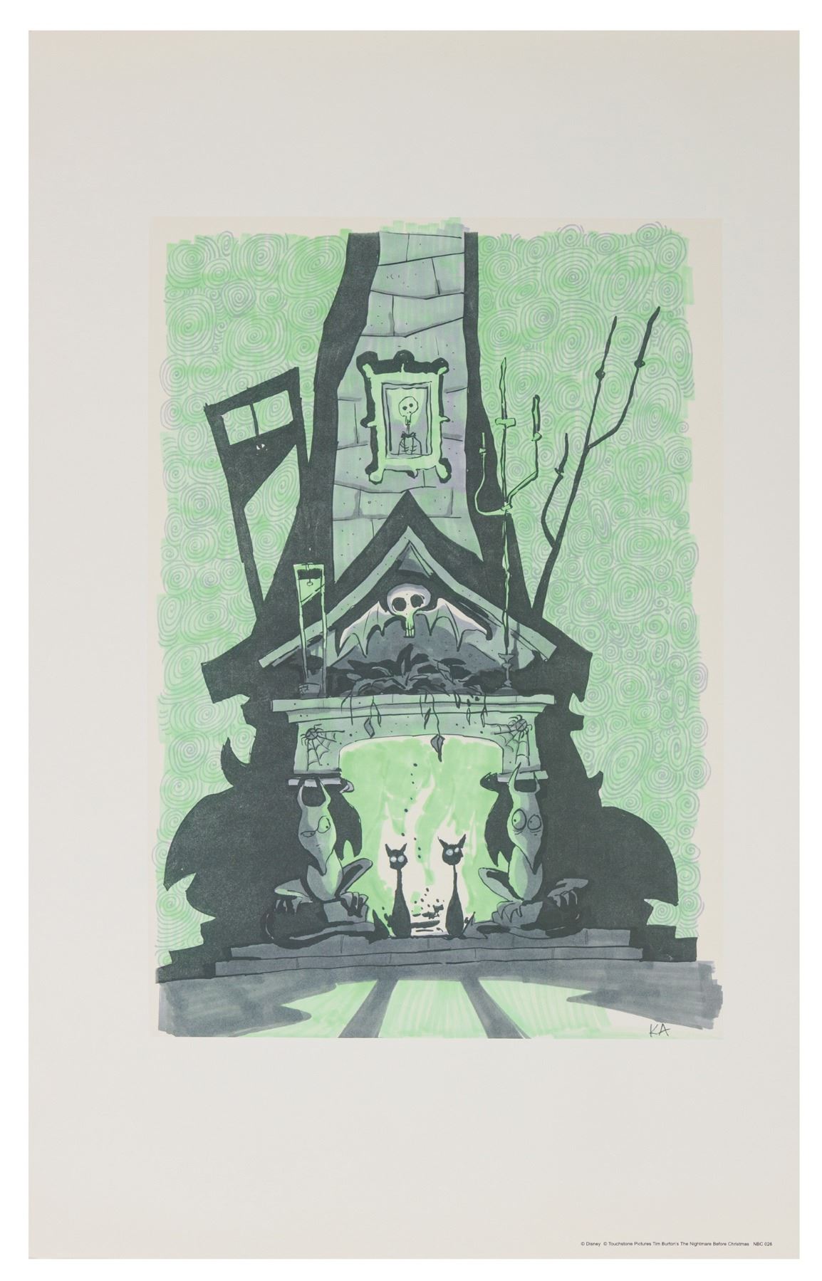 (Disneyland, c.2001) A very rare concept art print of a spooky fireplace from The Nightmare Before Christmas. Available at the Disney Gallery for only a short while, this print features scarcely seen concept art from the film. Measuring 22.5"x36", the print is in very good condition with minor wear.